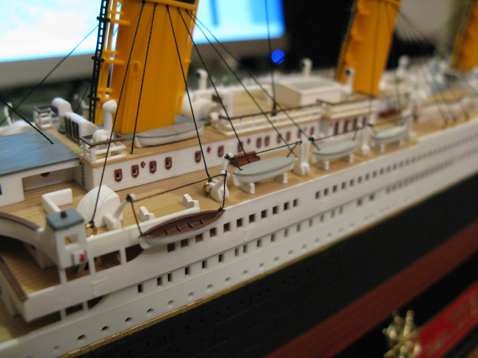По модели. Вот вроде сделано аккуратно. Но.. Покрашено, я так понимаю частично? Зря вы поставили такие кольца под такелаж, уж лучше было оставить отверстия. Сами прикиньте - масштаб модели Титаника (насколько я помню у Моделиста 1/400) колечко выходит высотой метра полтора?