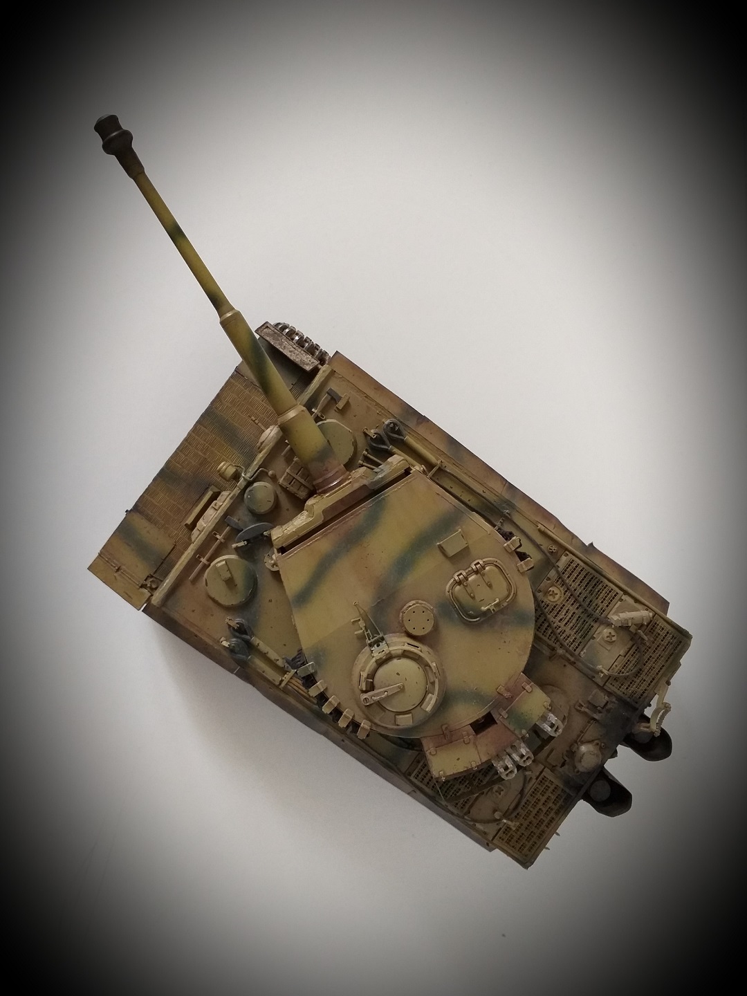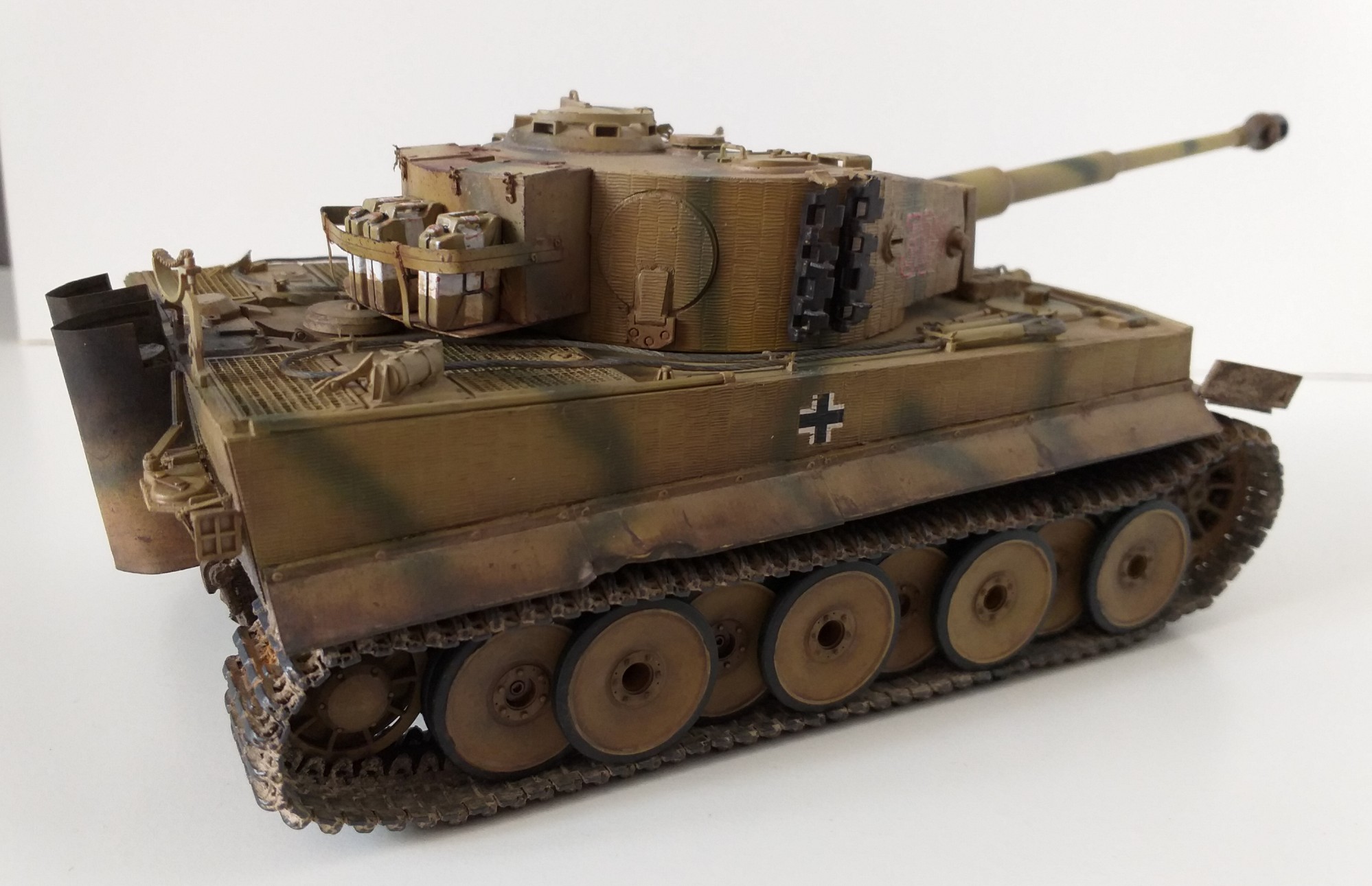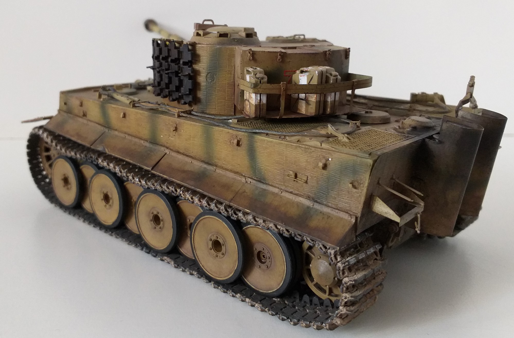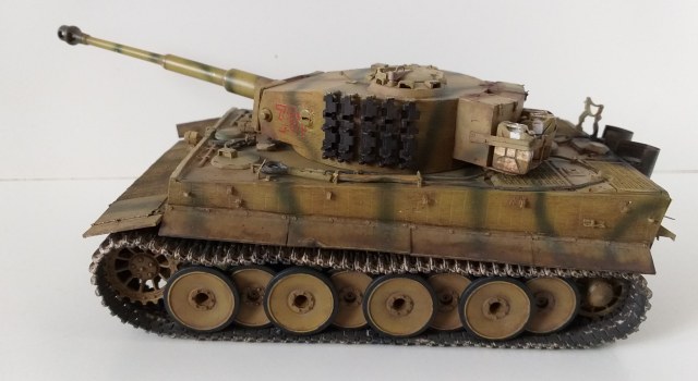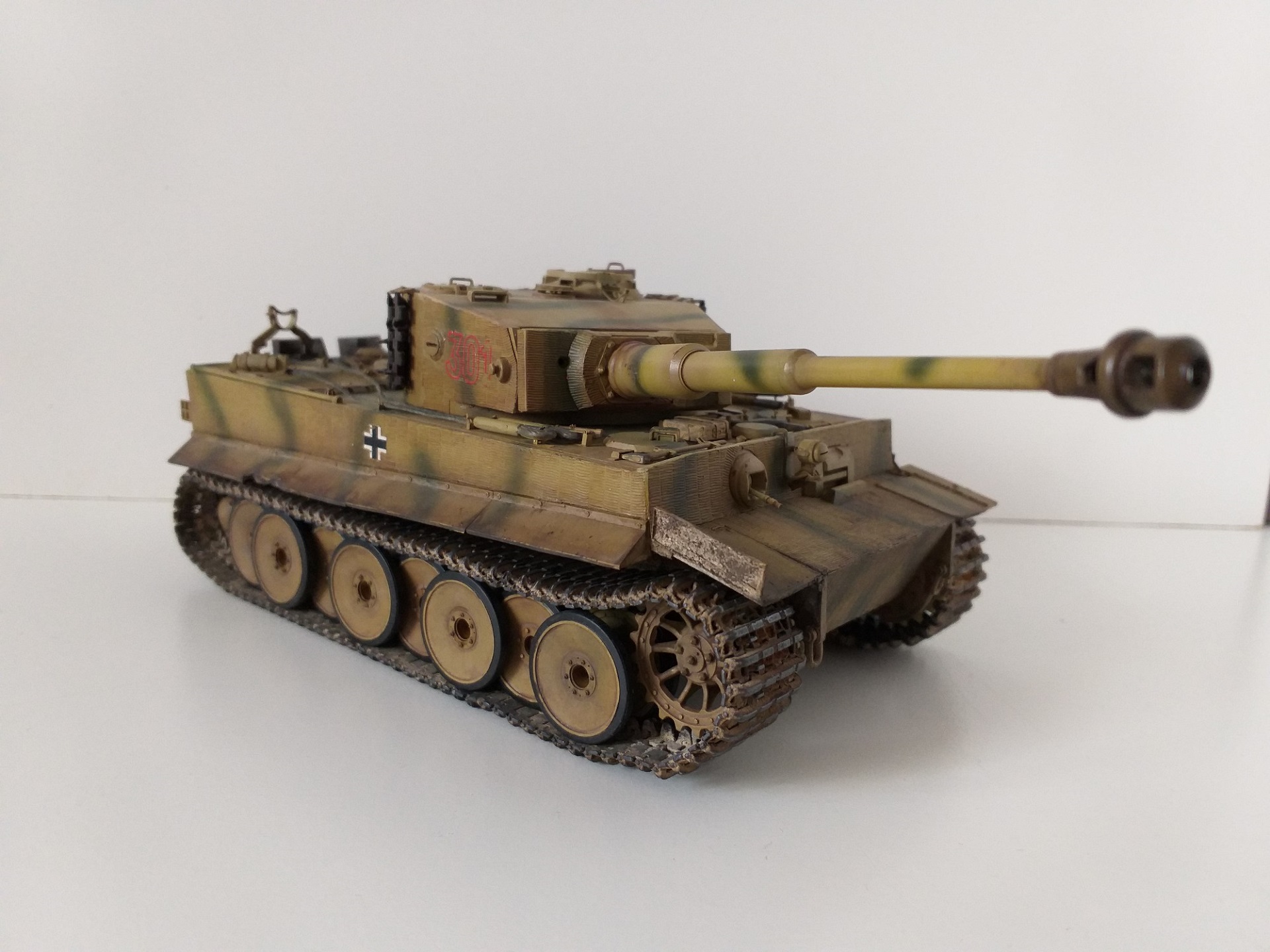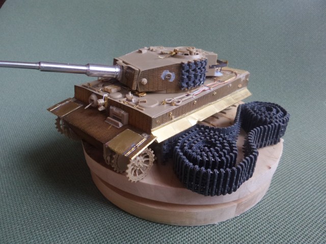 Всем привет. Это мой первый танк из семейства кошачих. При сборке модели у меня не стояла задача сделать какой-то определенный реальный танк, но историю я покопал. Это ранний тигр, который во второй половине войны был отремонтирован и модифицирован частично. Отсюда ходовка ранняя и башня от более поздних тигров. Танк от Tamiya сборка очень приятная и нет никаких проблем со стыкуемостью деталей. Травло от Voyager models, ствол Aber, гусеницы от танка другой фирмы(который на интерьере). Циммерит брал с рук и незнаю что за фирма. Использовалась химия от AK, Tamiya, Revel, Zvezda и масло Сонет. Из доработок это полка задняя для канистр с питьевой водой от Tamiya. Буду рад мнениям и оценкам. Спасибо.