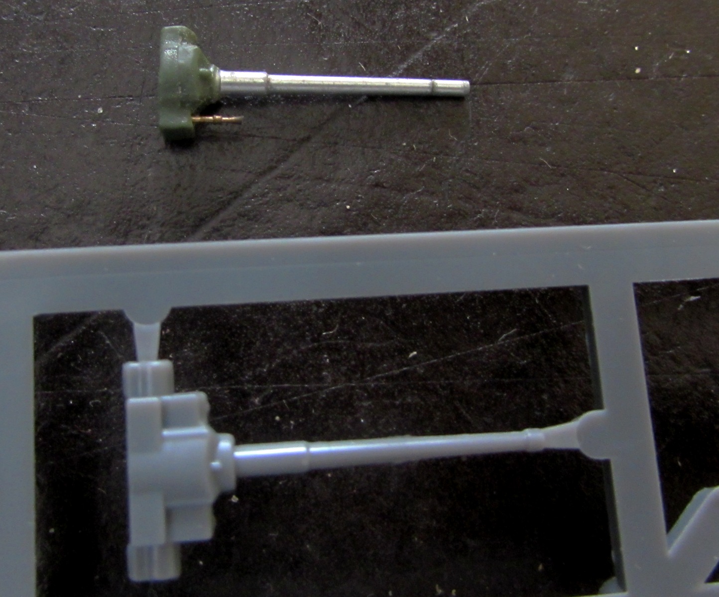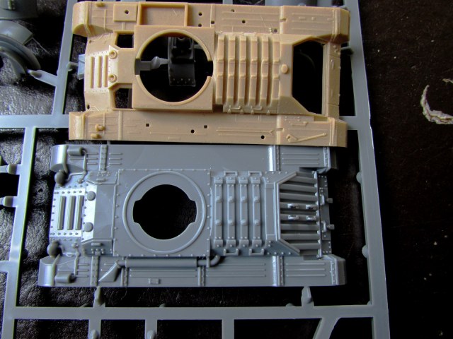 Башен три: двухместная, трехместная и трехместная поздняя. Отлиты они примерно одинаково. Единственное отличие в том, что трехместная ранняя позволяет сразу заменить ствол на металл, а вот в остальных случаях не самого хорошего качества ствол отлит вместе с маской пушки, что усложняет дело. Кстати, маска пушки на ранней версии немножко с недоливом, да и выглядит немножко некопийно (у Italeri, кстати, та же история) - даже "Танки мира" оказались в этом моменте лучше (положил для сравнения на фото рядом).