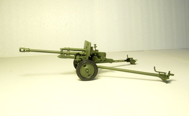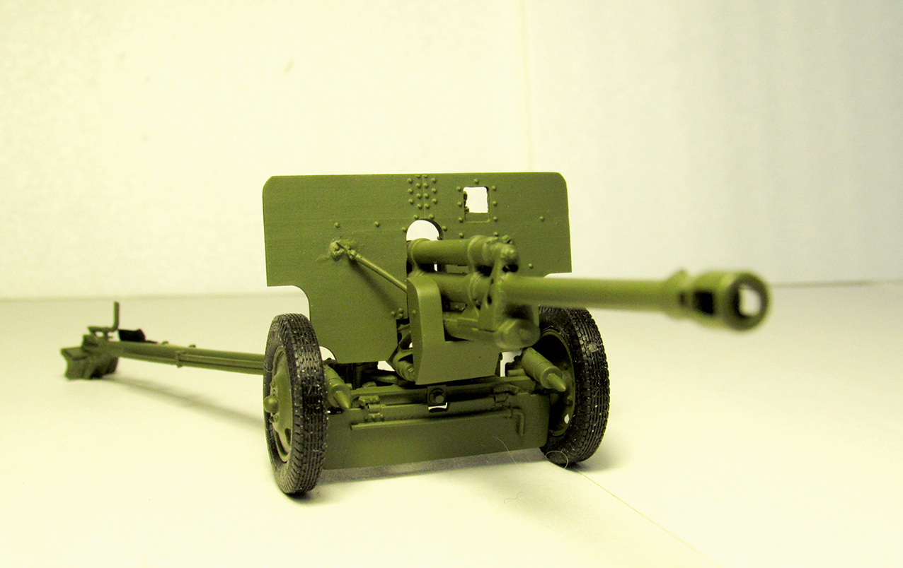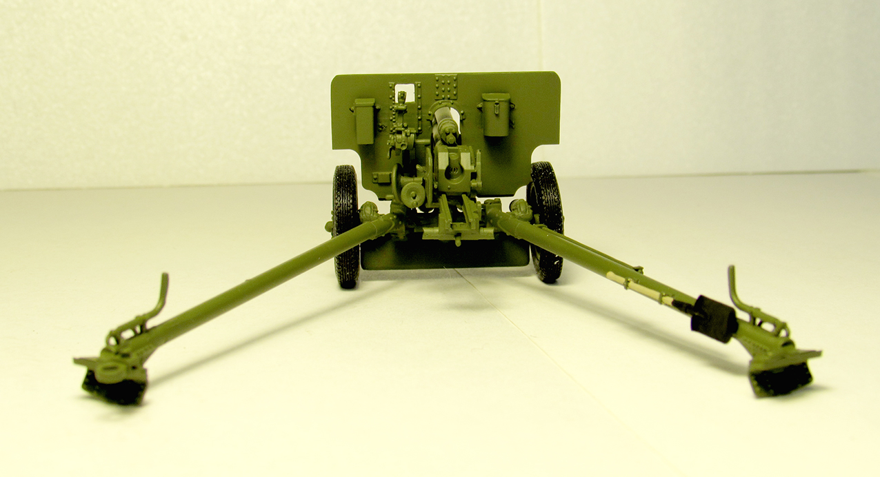 Довольно детально проработана. Ствол и две станины пушки выполнены из латунных трубок. Остальные детали- из смолы. Колёса- из чёрной смолы, по характеристикам схожими с резиной.