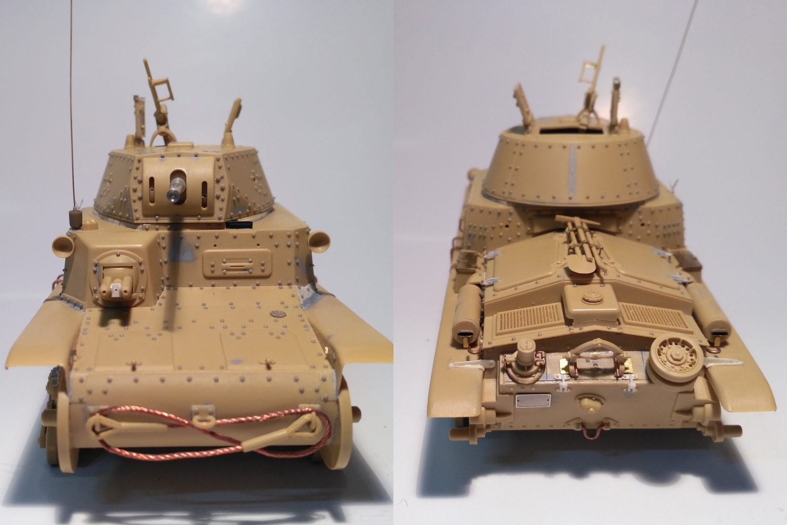 В процессе постройки я использовал фототравление от Эдуард (но взял из него процентов 20). Гусеницы заменил на Фриул. Все болты заменил на Мастерклаб, а срезанные родные пупырышки перекочевали на днище. Фары рассверлил и вставил подходящее стекло и отражатель от Эльфа. Курсовые и спаренный пулеметы из латунной трубки. Трос из запасов. Проволока, остатки фототравления, куски полистирола для мелочей.