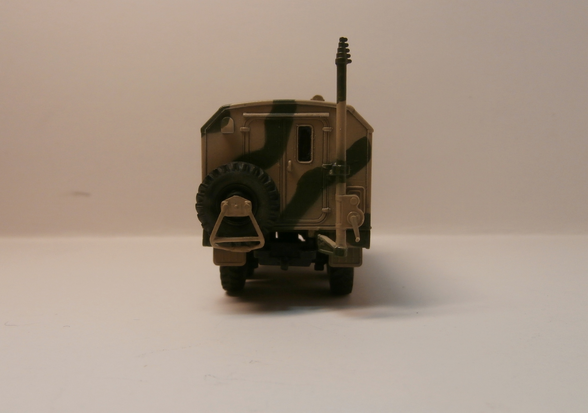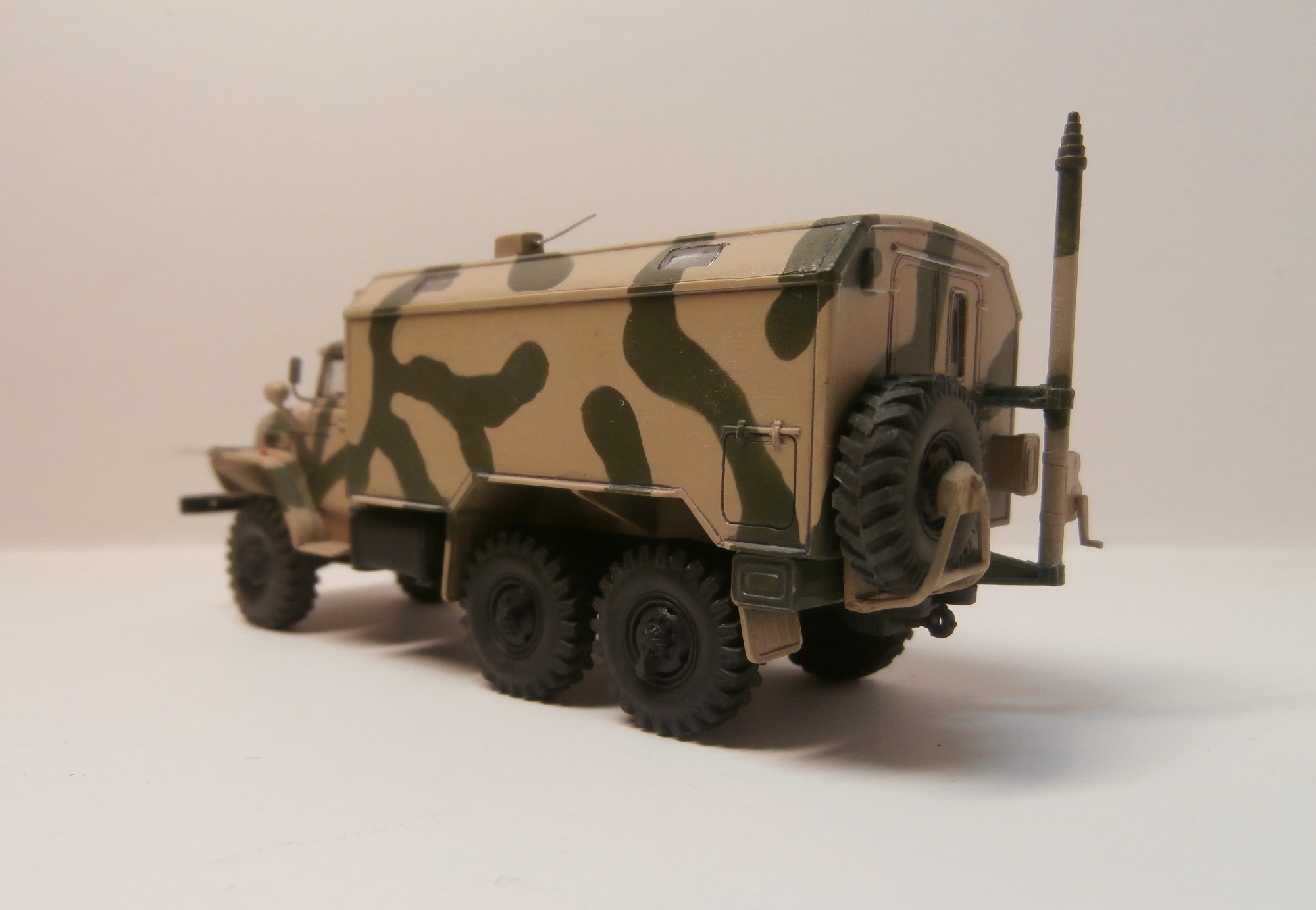 Набор всем известный, рассказывать особо нечего. В наборе попалась кабина, не очень высокого качества. Пришлось шпаклевать. Думал нарезать протектор - поленился. Окраска по стандарту. Камуфляж - по мотивам, так попросили. Добавил самодельные "дворники". Спасибо за внимание.