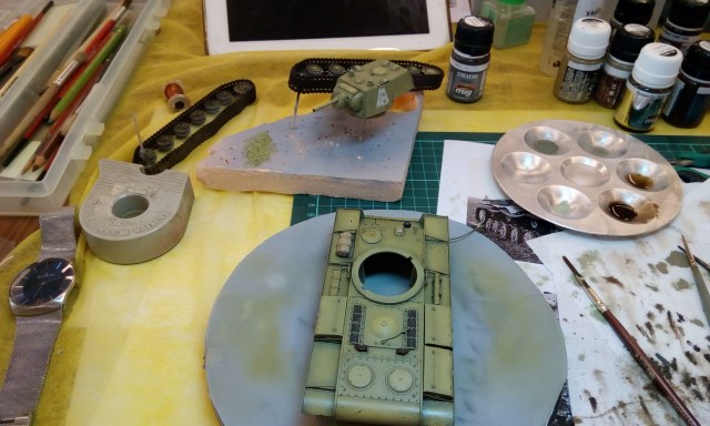 В качестве основного цвета траков использовал грунтовку A.MIG-2007 Tracks Primer. Для придания им запыленности использовал пигменты AMMO MIG и ZIP Maket оттенков земли и пыли. Для закрепления пигментов использовал жидкость AMMO MIG A.MIG-1400 Kursk Soil.