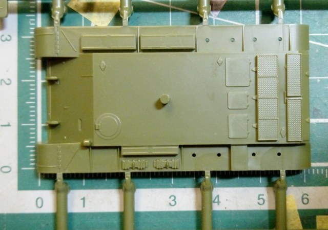 Литники из традиционного для советской техники этой серии пластика защитного цвета, литье очень качественное, облоя и утяжин нет. Ствол отлит целиком с маской пушки. Имеется небольшое смещение пресс-форм, которое впрочем, исправляется шлифовкой. Отверстие канала ствола придется сверлить самостоятельно. Пушка выполнена подвижной. Решетка МТО отлита довольно аккуратно. Запасные траки, как и вся мелочевка, отлиты прямо на корпусе. Траки гусениц отлиты упрощенно, как и на всех моделях этой серии.