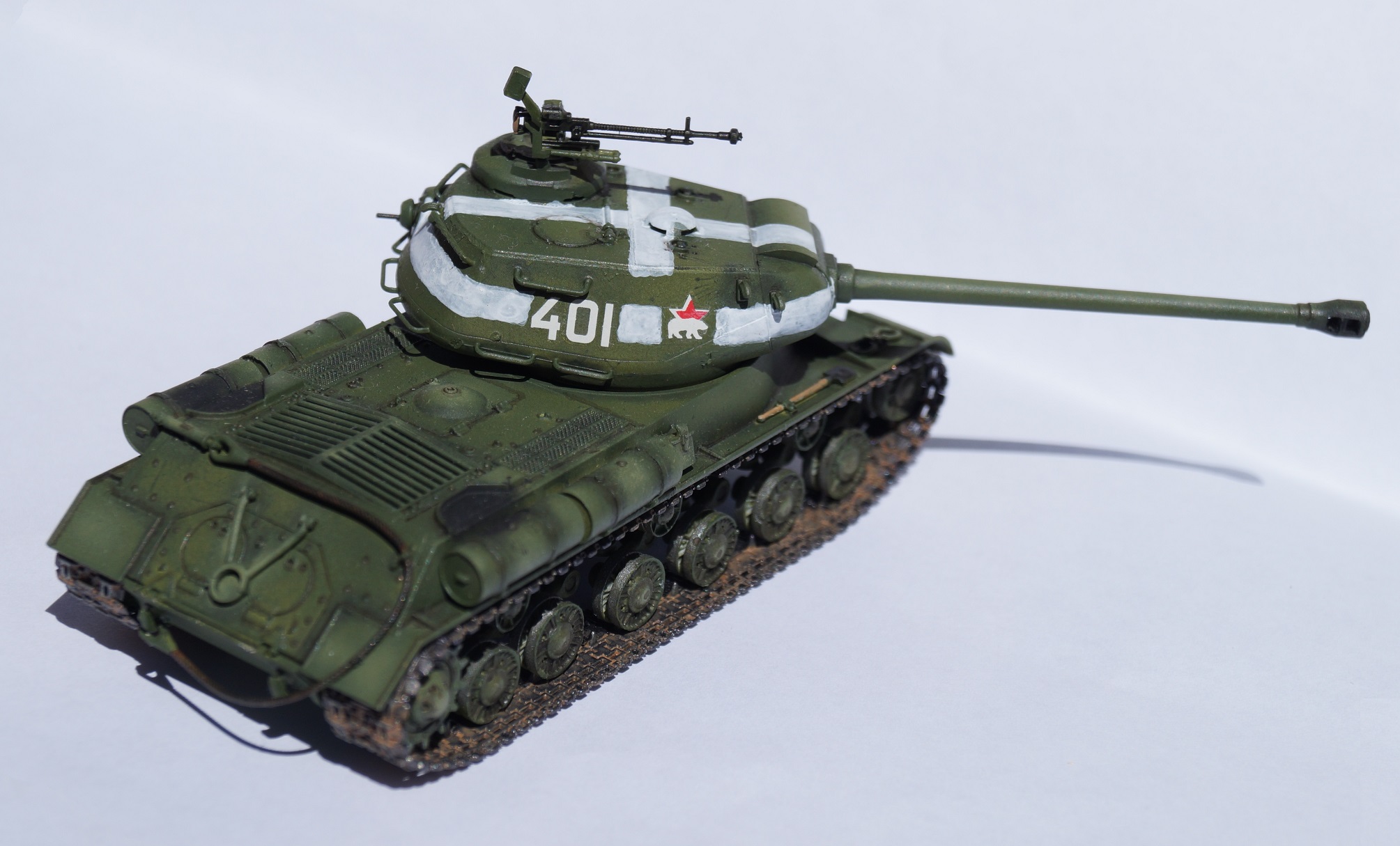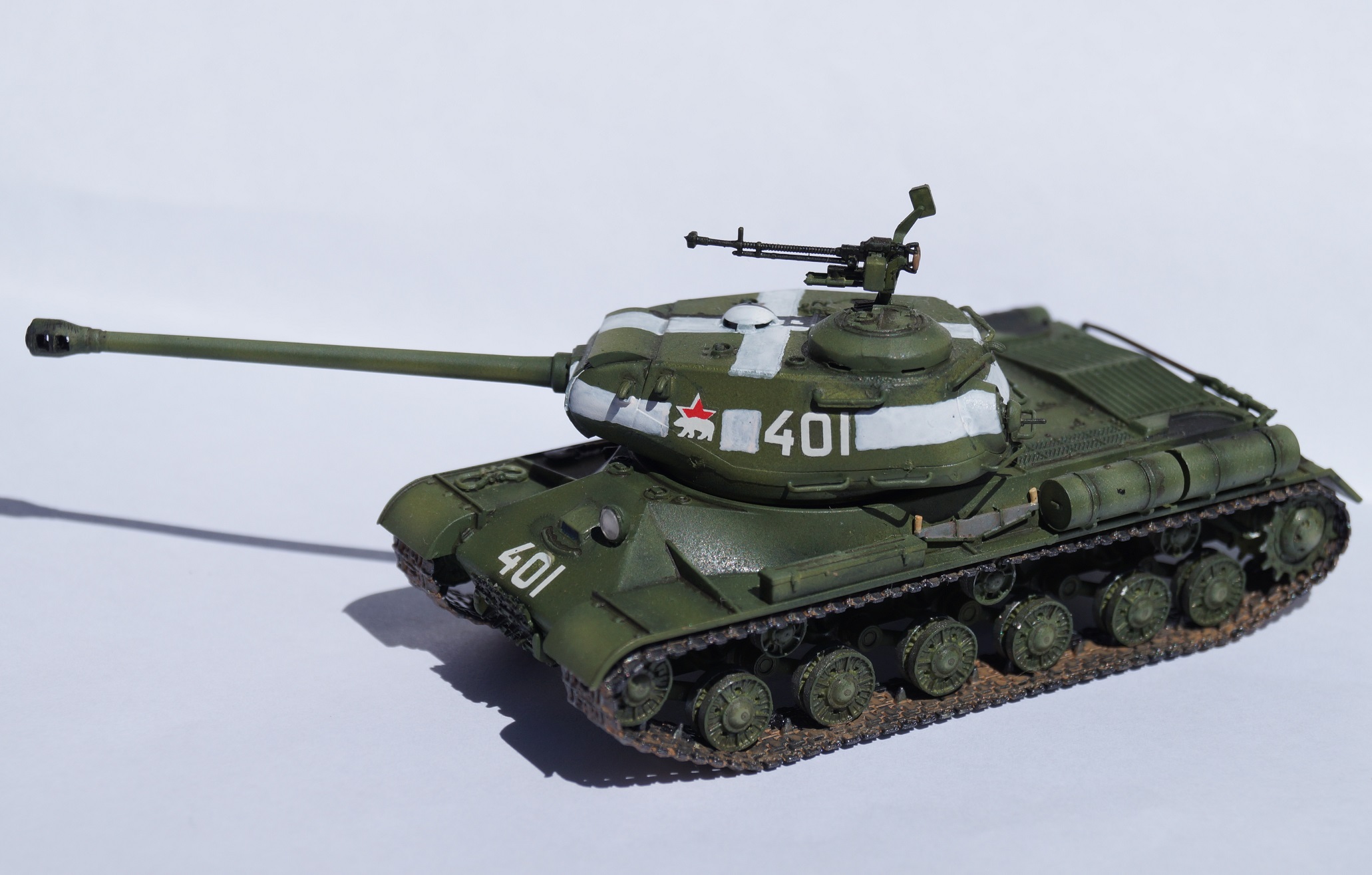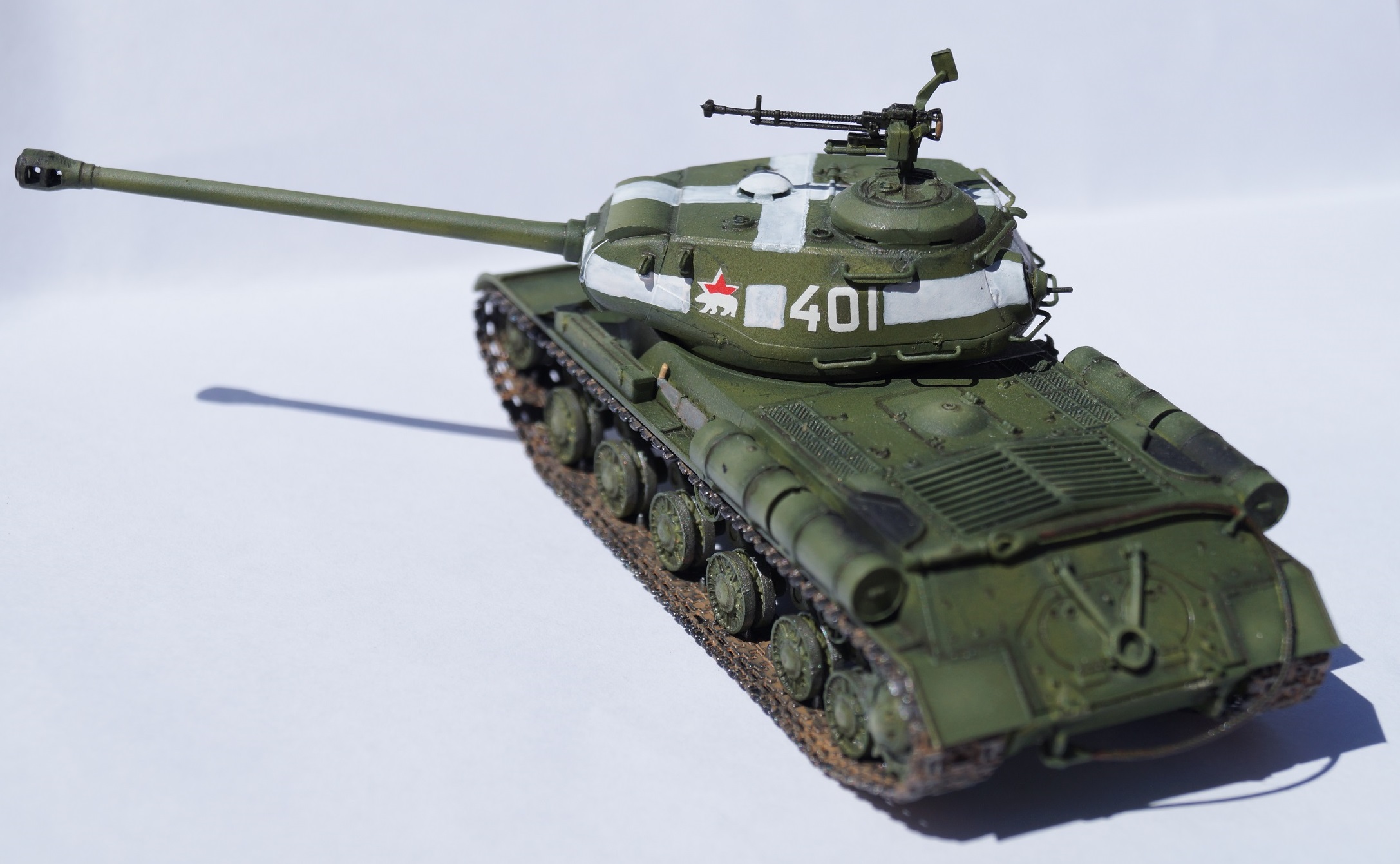 Представляю вам модель отечественного тяжелого танка ИС-2. Работу над ней выполнял параллельно с "Шилкой" в сотом масштабе, выставленной ранее. Изначально хотел успеть к 9 мая, но работа затянулась, а отфотографировать танк руки дошли только сейчас.