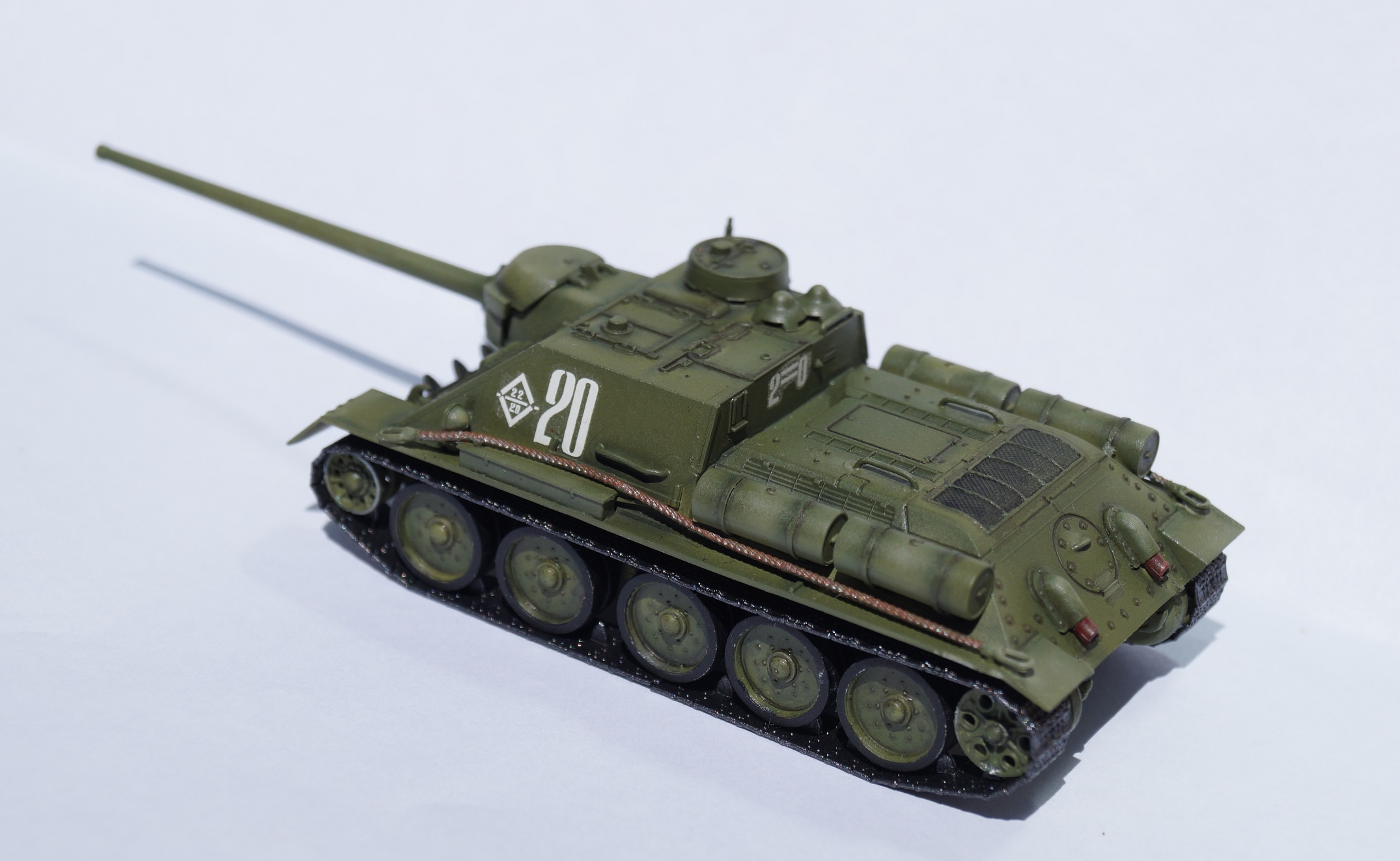 "Сушка" собрана практически из коробки. От себя добавил только поручни из проволоки, рассверлил ствол орудия и выхлопные патрубки, доработал фару. К сожалению, умудрился задом наперёд поставить звуковой сигнал; ошибку заметил уже на этапе покраски.