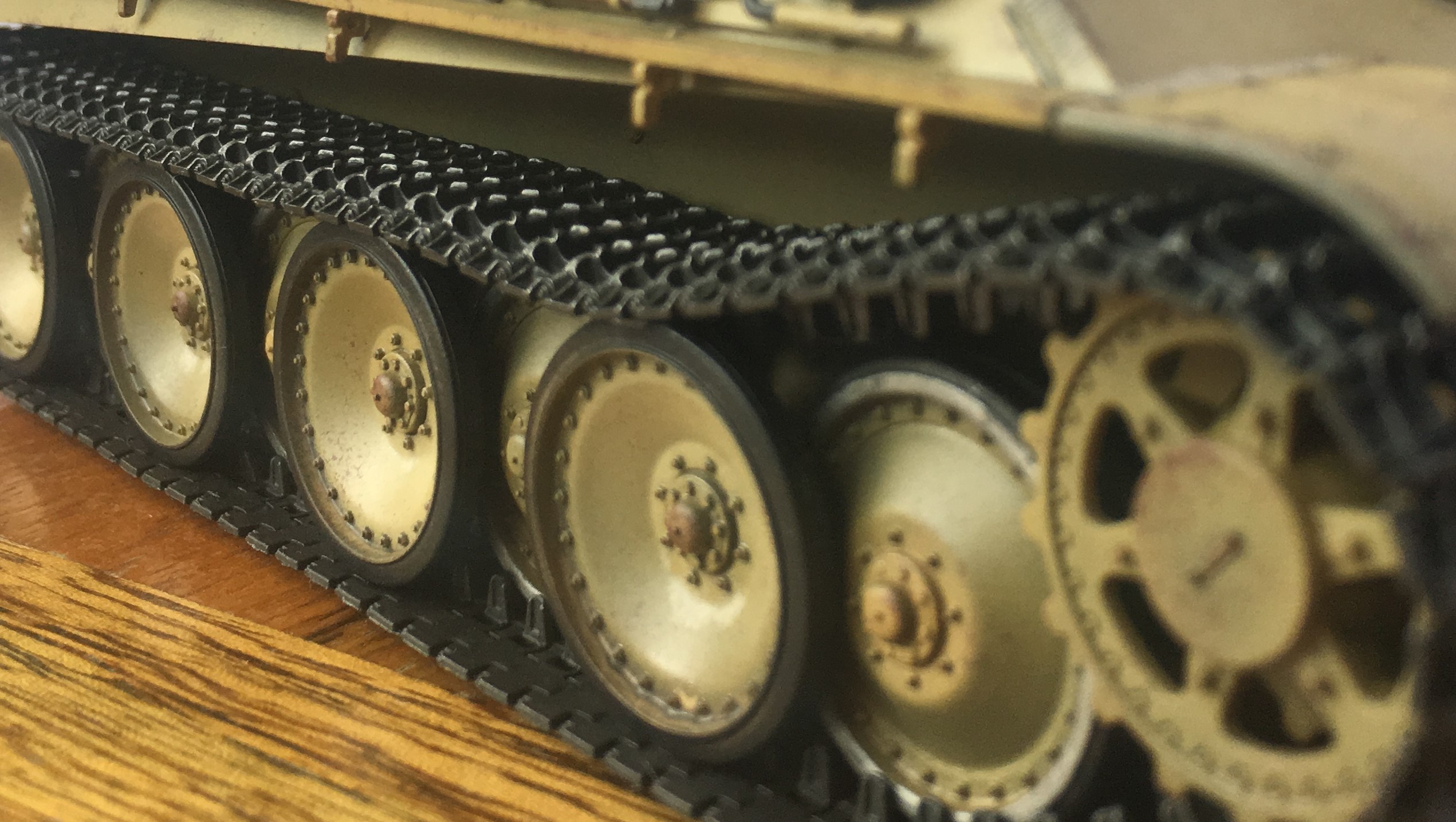 . При хорошей проработке сколов и царапин напрочь отсутствуют потеки ГСМ, нет не то чтобы грязи, пылинки нет ни одной. Искупали в фейри? Судя по количеству побед на стволе машина изрядно покаталась, а траки девственно чистые. Запасные тоже "нулевые", выхлоп где? Снаружи есть какие то мазки робкие,но внутри выхлопных труб чисто, нет беговых дорожек, зубья ведущих тоже стирались до метала...в общем так и просится еще небольшая художественная доработка...