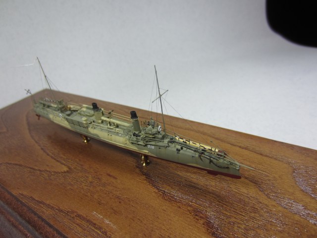 Корабль был заложен в 1896 г. на Ижорском заводе в г. Колпино. Миноносец №210 изначально планировался для службы на Дальнем востоке и являлся одним из 25 миноносцев типа "Пернов", которые выпускались в виде разборных комплектов для упрощения их доставки к месту службы по железной дороге. Таким образом, окончательно корабль вступил в строй лишь в 1899 г., после повторной сборки и проведения ходовых испытаний во Владивостоке. Корабли этого типа не участвовали в крупных сражениях Русско-японской войны в силу своих весьма заурядных тактико-технических характеристик и низкой мореходности, однако активно применялись для посыльной, брандвахтенной и дозорной службы, а также в минных постановках и при тралении фарватера и внешнего рейда. К сожалению, фотографий миноносцев данного типа до наших дней дошло не так много, поэтому пришлось тщательно анализировать крупицы имеющейся информации. Из двадцати пяти существовавших миноносцев типа "Пернов", именно "Двестидесятый" был выбран мною в качестве прототипа для постройки модели, так как он участвовал в набеге на корейский порт Гензан 30 июня 1904 г., а также из-за его необычной для того времени камуфляжной окраски. И конечно, хотелось отдать дань памяти морякам, воевавшим на этих корабликах. Дымовые трубы Миноносца №210 были удлинены во время одной из модернизаций в 1904 году, поэтому пришлось самостоятельно изготовить удлинённый вариант их козырьков из латунной трубки. Паровые магистрали сделал из вытянутой проволоки и приклеил их к дымовым трубам на суперклей. Якорные цепи также были сделаны из старых запасов фототравления и заведены на шпиль через носовые клюзы. Сами якоря были немного доработаны путём установки штоков, сделанных из медной проволоки. Изучив фотографии миноносцев того времени можно заметить специальные шесты для промера глубин, которые крепились к внутренней стороне леерного ограждения на носу и в корме. Сделать их из вытянутой проволоки, покрашенной в чёрно-белую полоску, также не составило особого труда. Изначально миноносцы типа "Пернов" несли три лёгкие мачты, но в ходе службы от средней мачты отказались практически на всех кораблях серии. Я сделал мачты моего миноносца из латунной проволоки, зауженной к вершине путём проката между двумя стальными пластинами. Та же процедура была проделана и с фок-реем, который был приклеен на суперклей. Мачты установлены в предварительно просверленные отверстия с использованием цианокрилатного геля, так как он позволяет корректировать положение приклеиваемых деталей ещё несколько секунд после склейки, что позволяет выравнивать наклон мачт по отношению к корпусу и друг к другу.Для изготовления такелажа модели использована лайкровая нить чёрного цвета толщиной 0.048 мм. Нить довольно прочная, прекрасно растягивается и клеится цианокрилатом. Модель двестидесятого собирается довольно легко и быстро, набор имеет высокую степень детализации и укомплектован фототравлением. Сильно прошу не пинать, в реальности модель лучше, чем на макросъёмке. Ну и предлагаю поддержать публикацию двестидесятого в галерее. :-)
