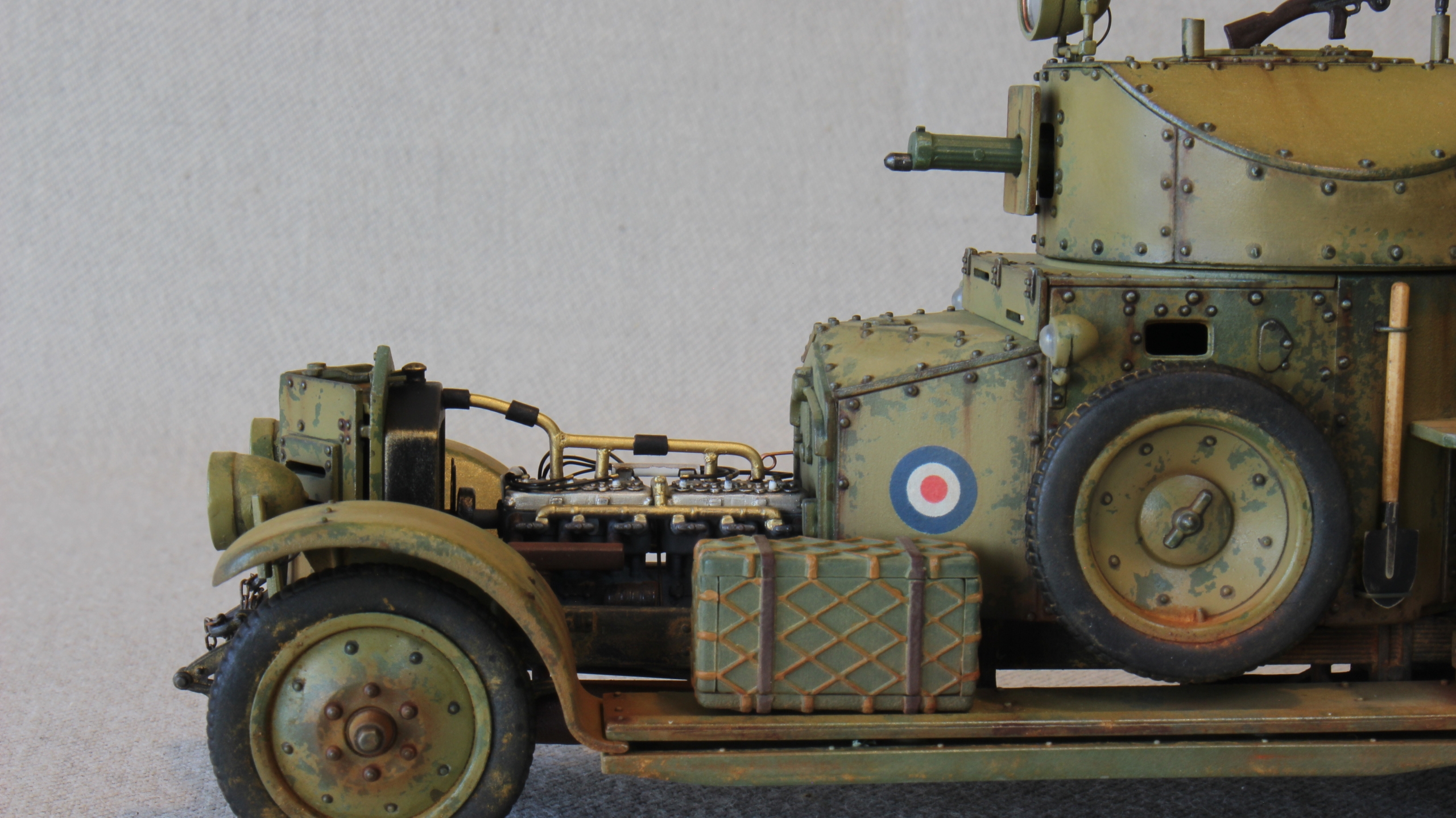 Однако всем привет. Предлагаю к просмотру совместную с моим падаваном работу. Пациентом был назначен Британский бронеавтомобиль Rolls-RoyceMk.I Pattern 1920 от Roden. Ранее с этим производителем не сталкивался – дрова ещё те (имхо), ну да ладно, что принесли. Есть типа нутрянка, даже с литников не стал срезать :( , решил добить подобие двигателя, поэтому решено было сделать капот съёмным, отражателей для фар нет- плёнка в место стёкол, шины-резина, стыковка так себе. За мной была консультация при сборке и часть покраски (визиринг), допы- пулемёт на башню, ведро, лопата, цепь. Краска Tamiya, химия-Zip, Mig, Vellejo. Ну вот как то так.