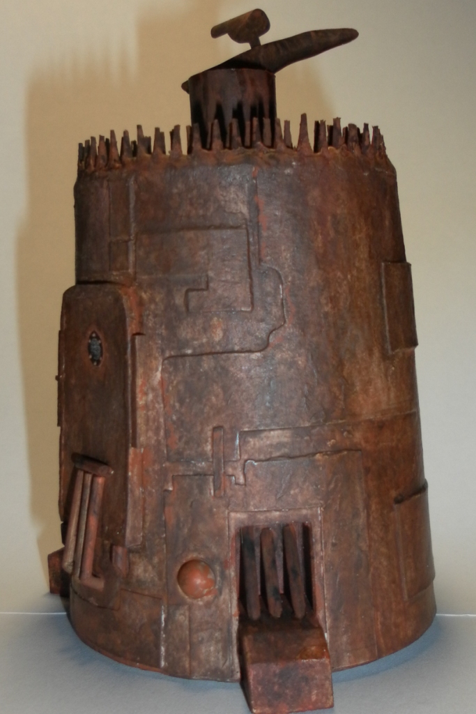 Собирал модель из бумаги для акварели. Её бугристая сторона мне показалась хорошей поверхностью для имитации ржавчины. При склеивании корпуса использовал пивную жесть для усиления прочности. Так же жесть пошла на верхнюю крутилку. Изначально хотел сделать её вращающейся. Присмотрел в сети моторчик с редуктором. Но с подходящим передаточным отношением на сайте не было и ждать не хотелось. Пришлось оставить просто приклееной. Верхние зубцы выточил из каминных КЦ. Ушло три штуки, что выражается умопомрачительной суммой в 13200 чатлов (исходя из стоимости гравицапы в полКЦ равной 2200 чатлов). Сначала думал использовать зубочистки, но они показались слишком тонкими. Использовал их в механизации посадочных лап и двери. Щели затирал шпатлёвкой для дерева. С иллюминатором повозился бы, если бы нашёл подходящую прозрачную пластмассу. Но за неимением таковой пришлось упростить.