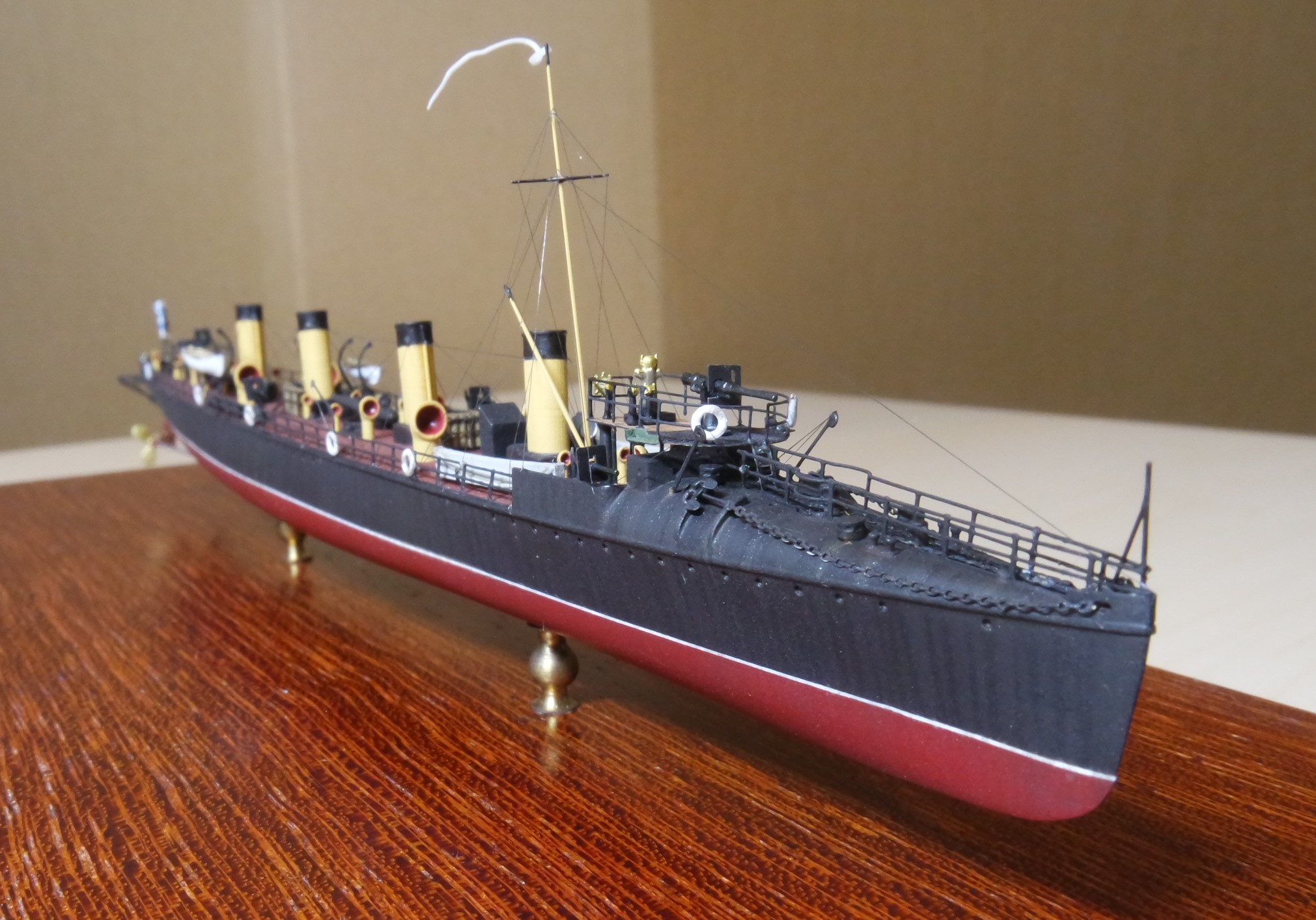 Истребитель "Боевой" является единственным кораблём, построенным по кораблестроительной программе "Для нужд Дальнего востока" в Великобритании. За основу миноносца был выбран проект английской фирмы "Братья Лэйрд", освоившей к тому времени на своей верфи в Беркенхеде производство так называемых "тридцатиузловых" истребителей. В итоге, миноносец унаследовал многие технологические решения, присущие английским кораблям, а также заметно выделялся среди отечественных одноклассников большей длиной корпуса и расположением вооружения. Изначально корабль получил имя "Сом", был спущен на воду 15 июля 1899 года и вступил в строй 18 июля 1900 года, после чего совершил длительный межфлотский переход на Дальний восток. С прибытием в Порт-Артур 23 апреля 1901 года корабль был переименован в "Боевой" и стал флагманом Первого отряда миноносцев Первой тихоокеанской эскадры. 10 июля 1904 года, во время очередного дежурства "Боевого" в бухте Тахэ, корабль был торпедирован с минного катера японского эскадренного броненосца "Фудзи". Повреждения миноносца оказались настолько серьёзными, что устранить их силами мастерских порта не представлялось возможным и, до конца войны участия в боевых действиях истребитель уже не принимал, а накануне сдачи крепости 20 декабря 1904 года был взорван своим экипажем, чтобы не достаться японцам. В общей сложности, на постройку модели "Боевого" у меня ушло около трёх недель. Модель построена практически "из коробки" и собирается довольно легко. В период своей непродолжительной службы "Сом" – "Боевой" имел несколько вариантов окраски, однако я остановился на классической "викторианской", которую корабль нёс во время ходовых испытаний и своего перехода с Балтики на Тихий океан. На мой взгляд, она лучше всего передаёт красоту этого изящного кораблика. Красил водорастворимым акрилом АКАН. В качестве ватерлинии была использована декаль из личных запасов. В принципе, её можно было и не наносить, так как на фотографиях корабль присутствует как с ватерлинией, так и без неё. Платформа под кормовое, 47-мм орудие дана в наборе фототравлением, но установить её на штатное место довольно сложно, так как приходится одновременно соединять ось платформы с тумбой орудия и четырьмя дефлекторами, которые пронизывают её насквозь и должны войти в соответствующие пазы в верхней палубе. Для облегчения данной процедуры леерное ограждение на платформу лучше приклеить заранее. Отдельного упоминания требует носовой ходовой мостик и совмещённая с ней платформа носового 75-мм орудия. Перед установкой этого элемента заранее выровнял и приклеил к палубе корпуса пиллерсы, поддерживающие палубу мостика, чтобы выдержать параллельность всей конструкции по отношению к ватерлинии. После того, как на модель были установлены все орудия, минные аппараты, мостики и трапы, к палубе были приклеены предварительно собранные и покрашенные вьюшки, шлюпбалки, оба штурвала, магнитные компасы, машинные телеграфы, маховик водяной помпы, боевой прожектор и щит кормового мостика, а также коечные сетки команды и складные парусиновые вельботы. В комплект модели входят два ялика, которые аккуратно были окрашены кистью и подвешены на шлюпбалки в районе третьей и четвёртой дымовой трубы. Чтобы плавсредства выглядели более реалистично, я добавил к ним перо руля и фототравлёные 