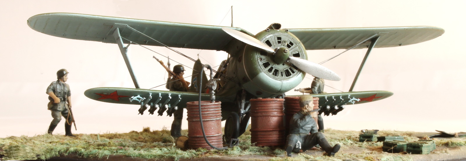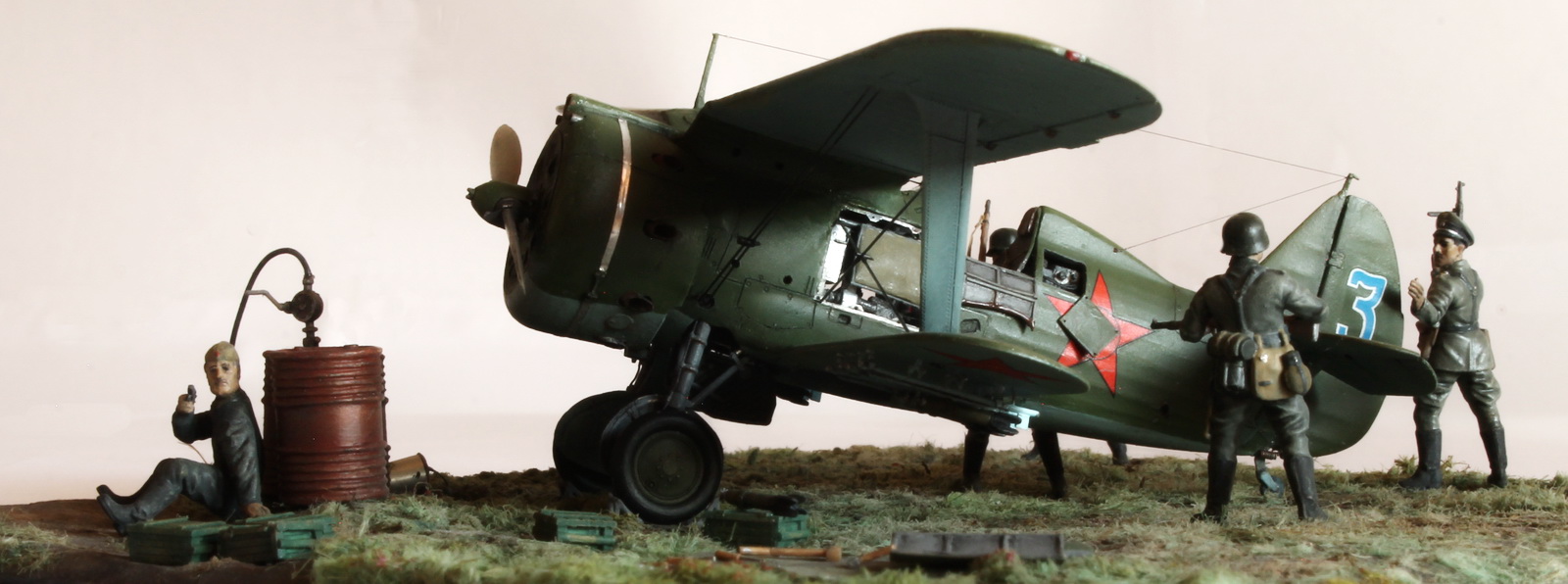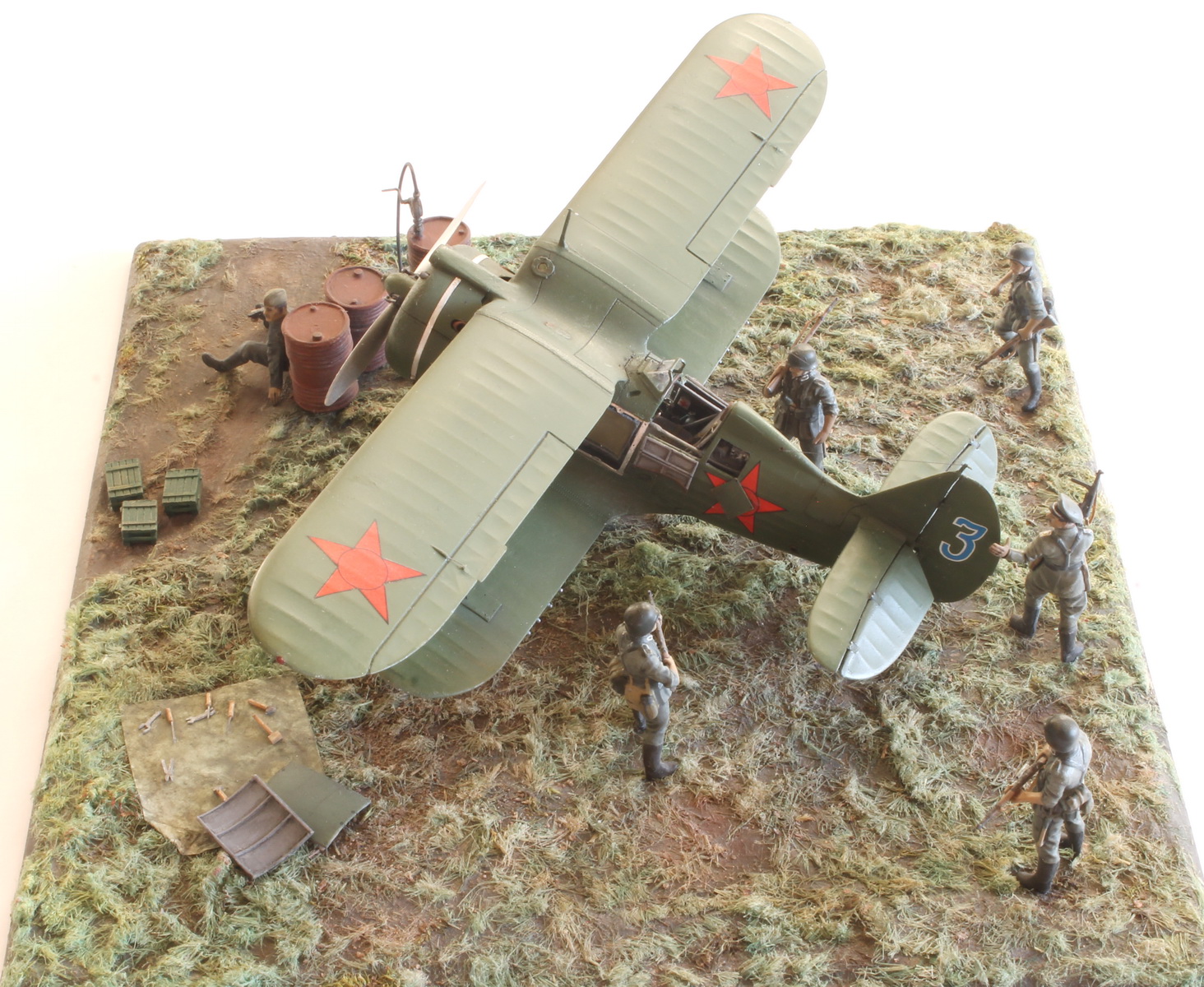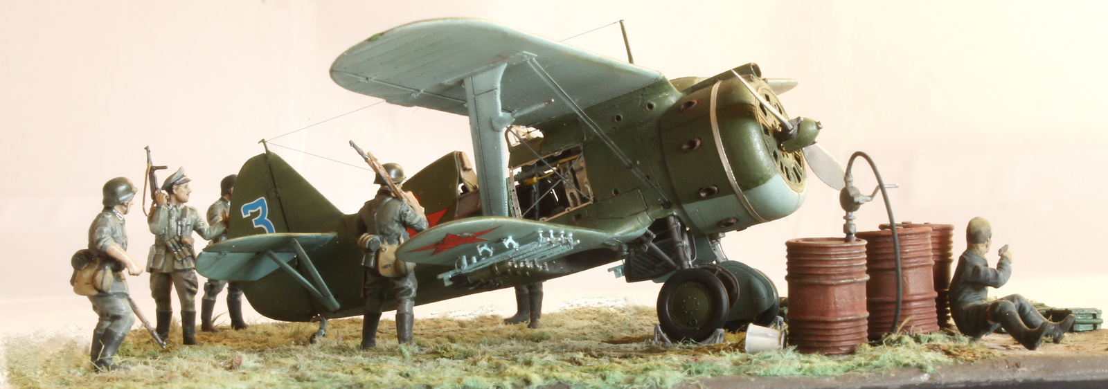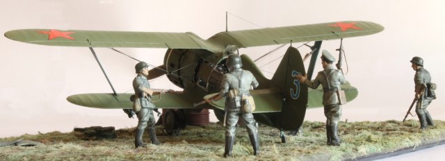 Модель сделана хорошо,а вот композиция подкачала.Что там делает техник/красноармеец в одиночестве,где охрана аэродрома? Интересная система заправки бензином.Правый руль высоты опущен больше левого(или так кажется),тогда и ручка управления должна сместиться в сторону приборной доски,а она стоит вертикально(или тоже кажется).И раздел галереи должен быть другой.