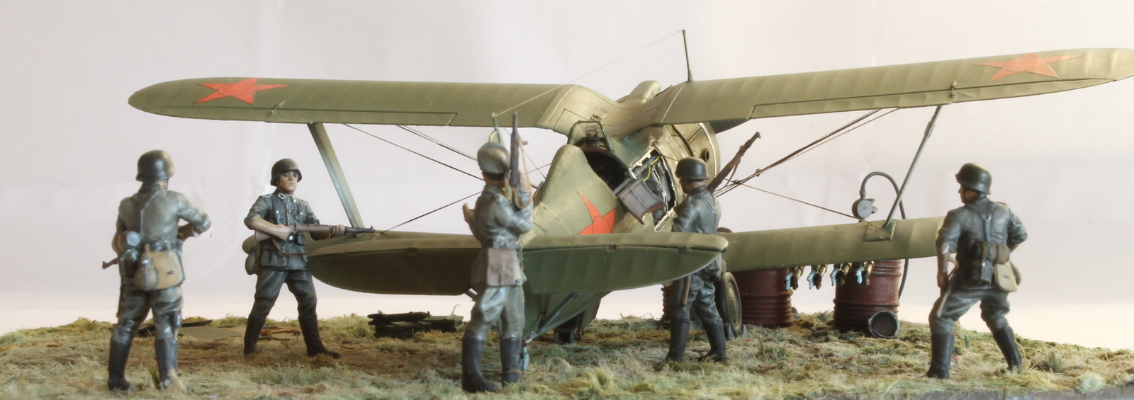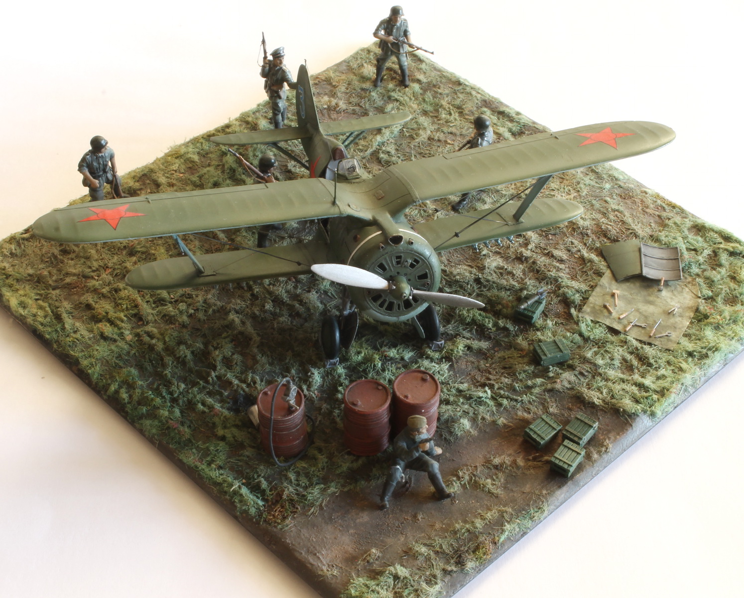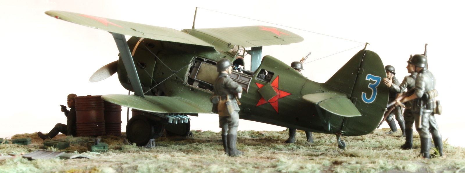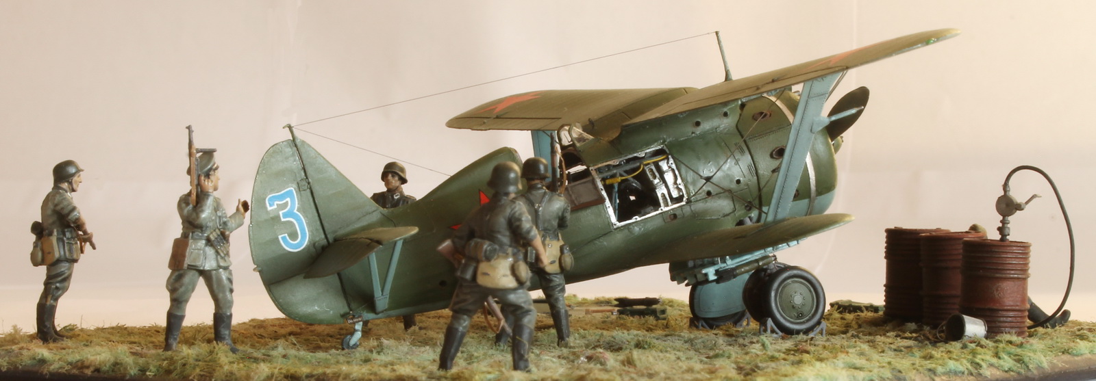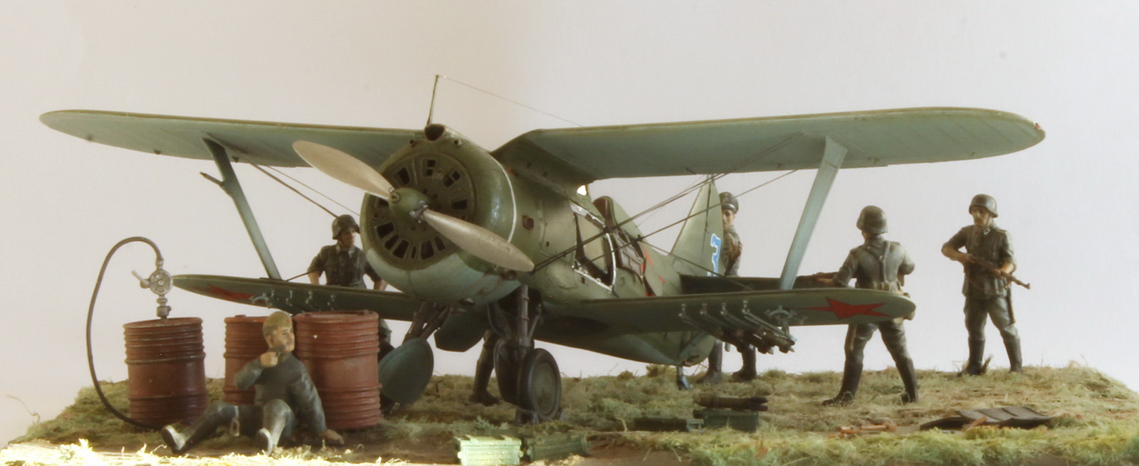 Модель сделана хорошо,а вот композиция подкачала.Что там делает техник/красноармеец в одиночестве,где охрана аэродрома? Интересная система заправки бензином.Правый руль высоты опущен больше левого(или так кажется),тогда и ручка управления должна сместиться в сторону приборной доски,а она стоит вертикально(или тоже кажется).И раздел галереи должен быть другой.