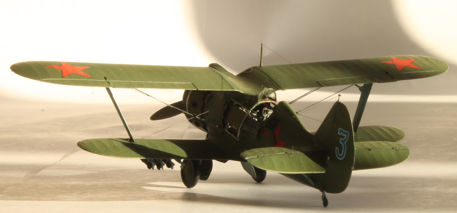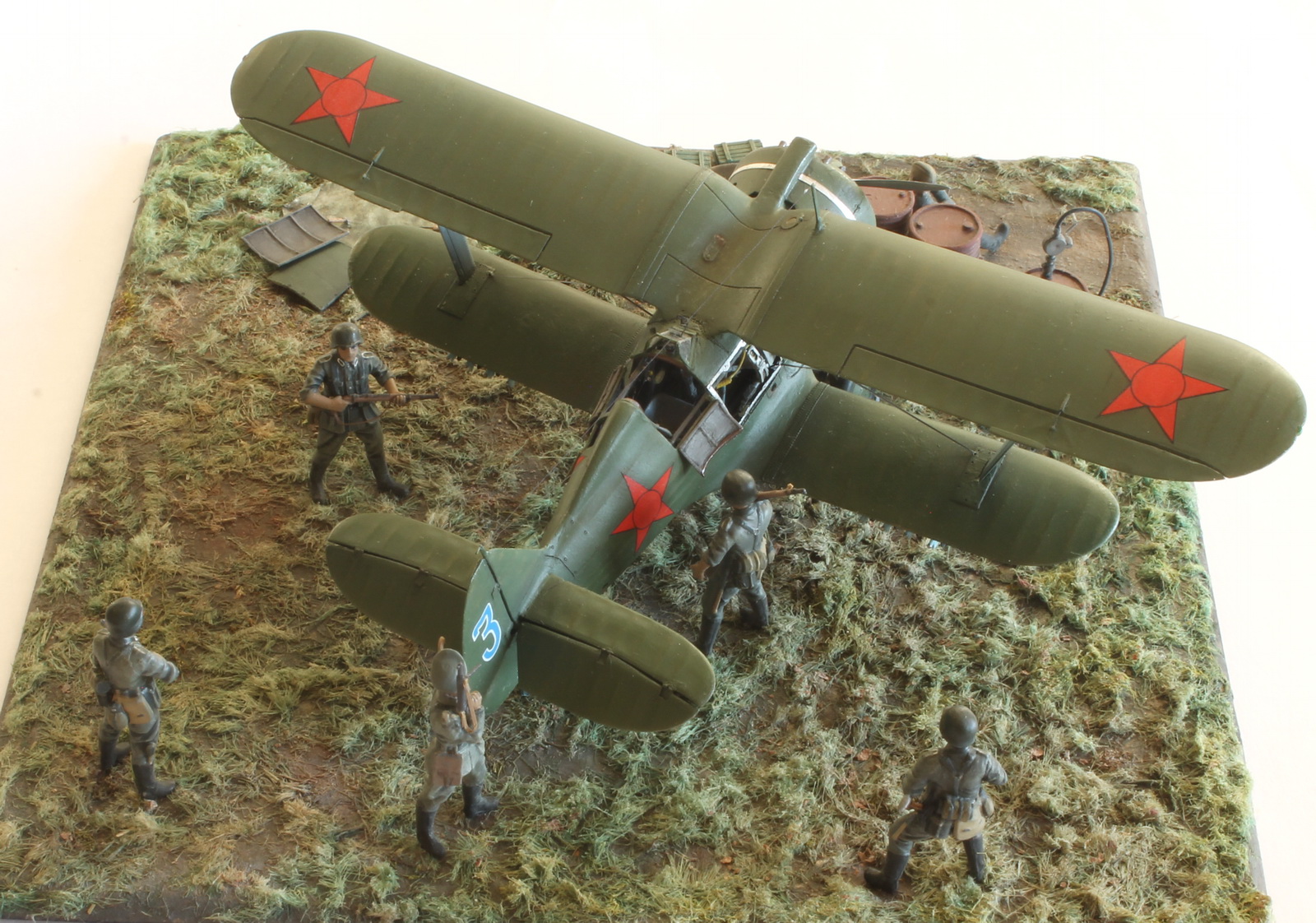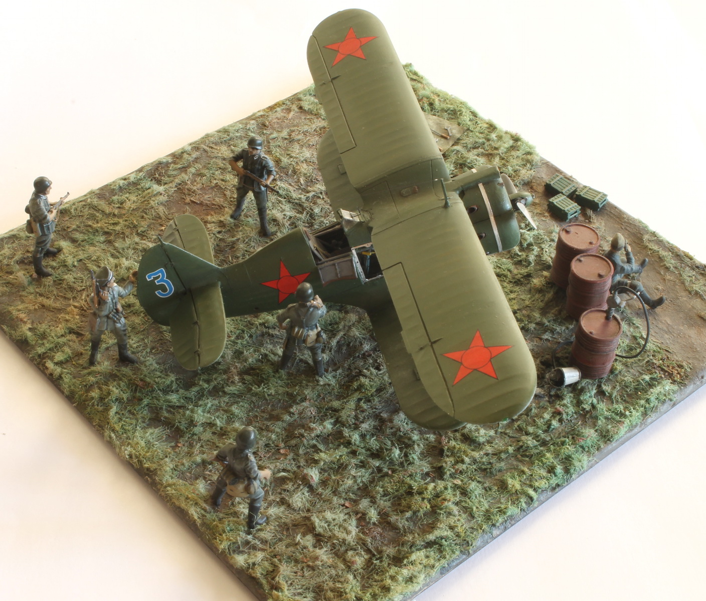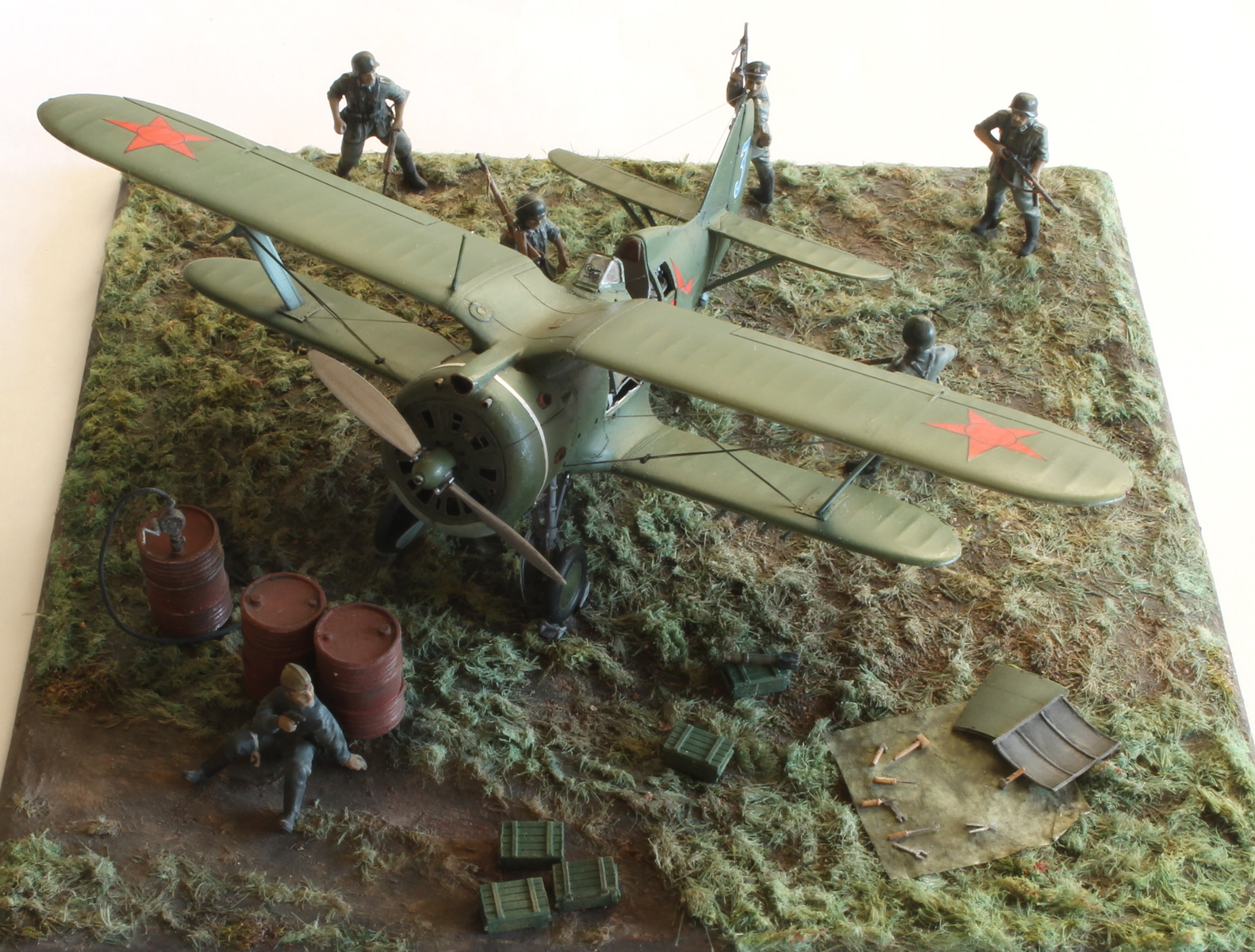 Модель сделана хорошо,а вот композиция подкачала.Что там делает техник/красноармеец в одиночестве,где охрана аэродрома? Интересная система заправки бензином.Правый руль высоты опущен больше левого(или так кажется),тогда и ручка управления должна сместиться в сторону приборной доски,а она стоит вертикально(или тоже кажется).И раздел галереи должен быть другой.