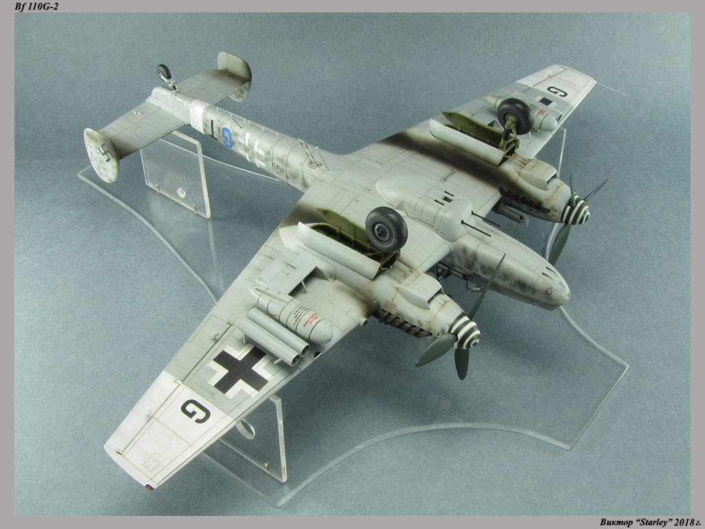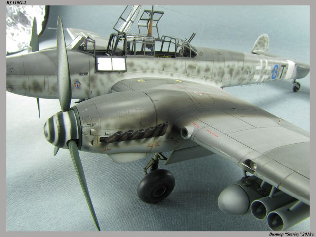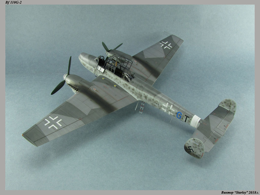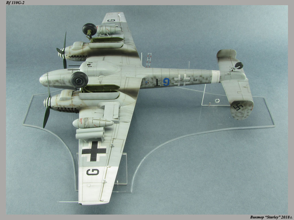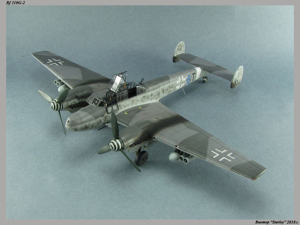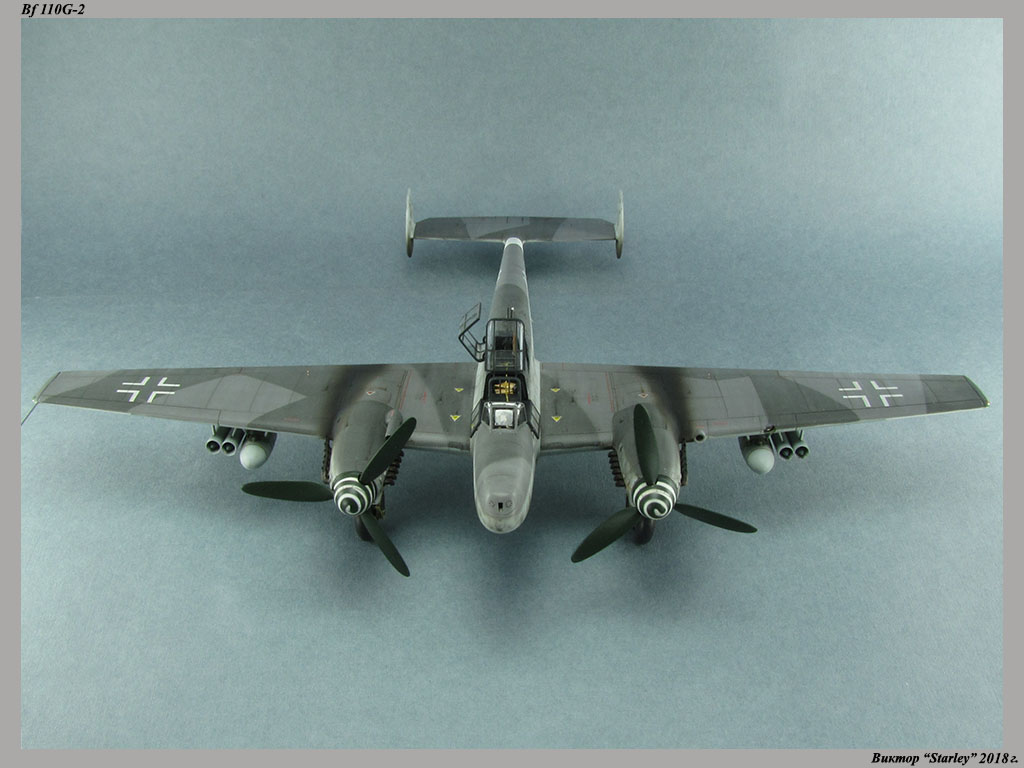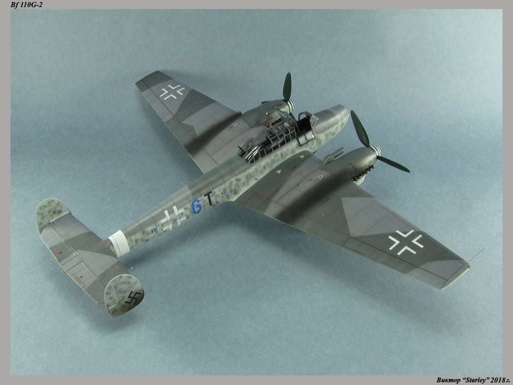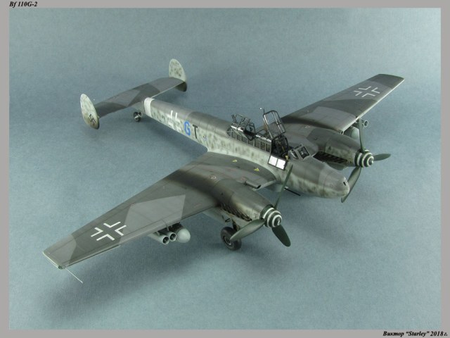 Приветствую уважаемое сообщество! Сегодня хочу Вам предоставить модель тяжелого истребителя Bf 110G-2 "Zerstorer" с комплектами M1,M2,M3 (пушки MG151 в подфюзеляжной гондоле, 300-л подвесные топливные баки и контейнеры с Wfr.Gr.21), предназначенного для уничтожения тяжелых бомбардировщиков союзников в небе Рейха. Прототип состоял на вооружении 9./ZG26 "Horst Wessel" и базировался осенью 1944г. на аэр. Кёнигсберг-Ноймарк. Модель строилась в рамках ГБ "Воздушный бой-3", но к его окончанию я не успел, к сожалению. Информацию по самолету приводить не буду, уж очень ее много в сети.Сама модель собирается очень хорошо, практически "на щелчок" (шпатлевки использовался вообще мизер), за исключением маслорадиаторов двигателей, над которыми пришлось изрядно повозиться. Кроме того, пластик у производителя оказался очень интересным- к нему практически не пристает шпатлевка- через некоторое время начинает трескаться и отваливаться, обнажая расплавившуюся под ней основу. Но все равно пришлось приложить руки, доработаны:-полностью дорезана/перерезана расшивка;-накатана клепка;-пушки в гондоле сделаны из игл;-прокинута проводка в кабине;-протянуты магистрали по стойкам шасси;-переделана хвостовая опора;-заново сделан прицел;-"открыта" створка кабины стрелка-радиста, а также сделан механизм ее закрытия;-сделана противокапотажная рама в кабине летчика;-сделаны гидроцилиндры уборки основных стоек шасси;-сделан силовой набор в нишах основных стоек шасси;-сделана фара, отражатель и стекло;-ПВД из игл;-переделаны тоннели гликолевых радиаторов;-сами радиаторы сделаны с нуля;-сделаны антенны системы слепой посадки;-сделана радиоантенна из бантика, а также "колокольчики" на нейВозможно что-то упустил, но это не принципально.Впервые применил "солевую" технику- понравилось! Одно но- после снятия соли модель надо ОЧЕНЬ хорошо мыть с водой, иначе под лаком начинают вылезать белесые пятна. Также впервые накрасил балкенкройцы, ну насколько же лучше декалей получается! Красил Mr.Color, пачкал маслом, пастелью, акварельными карандашами. Лак, глянец-футура, сатин-Tamiya. Из допов применены:-выхлопные патрубки QuickBoost;-пулемет MG-81Z Eduard;-маски на фонарь EduardВсе остальное вполне себе самодостаточно.