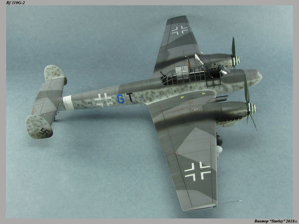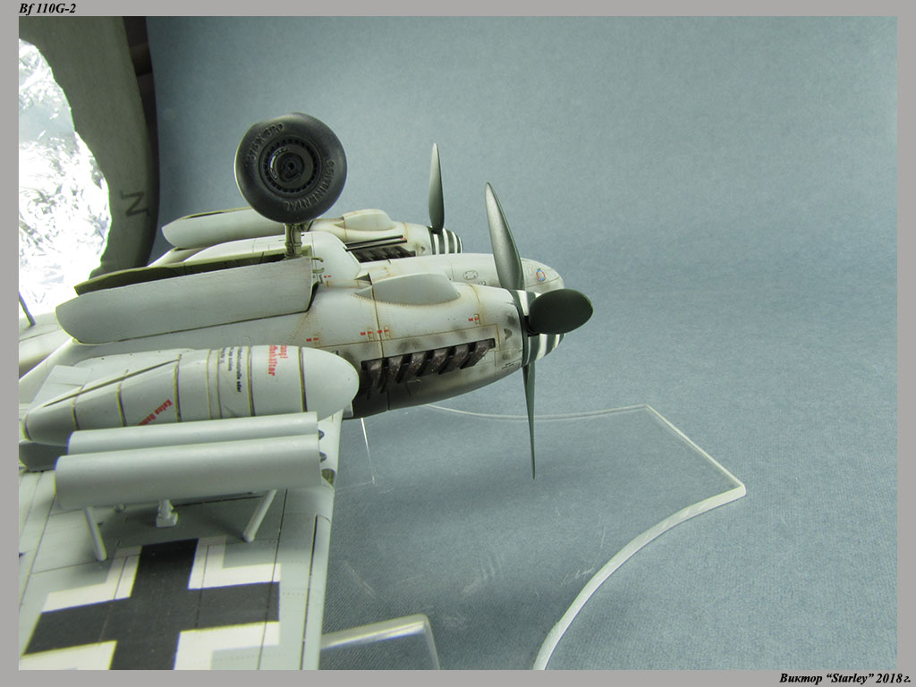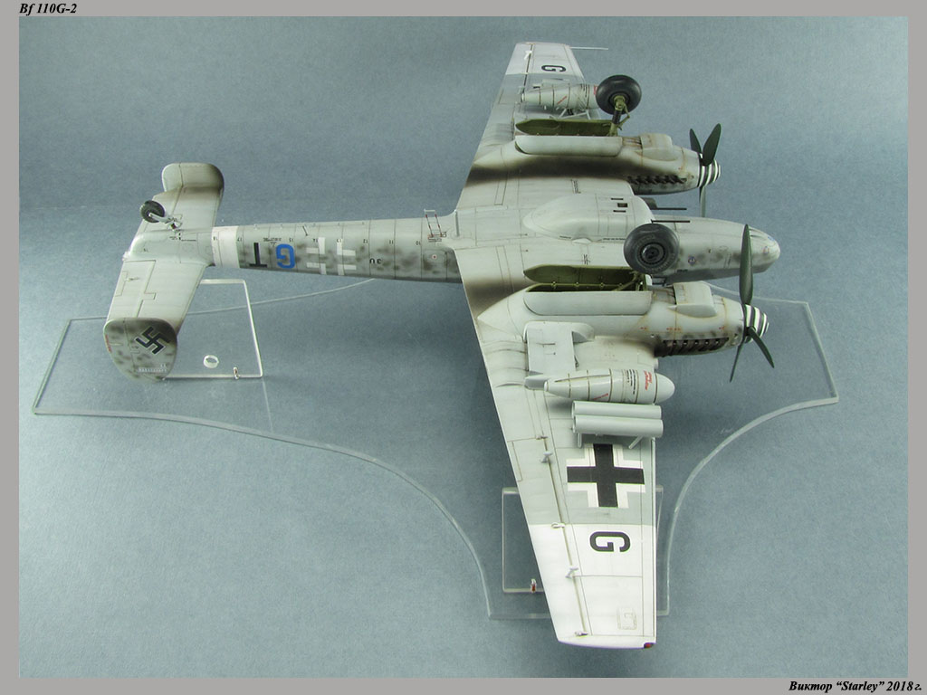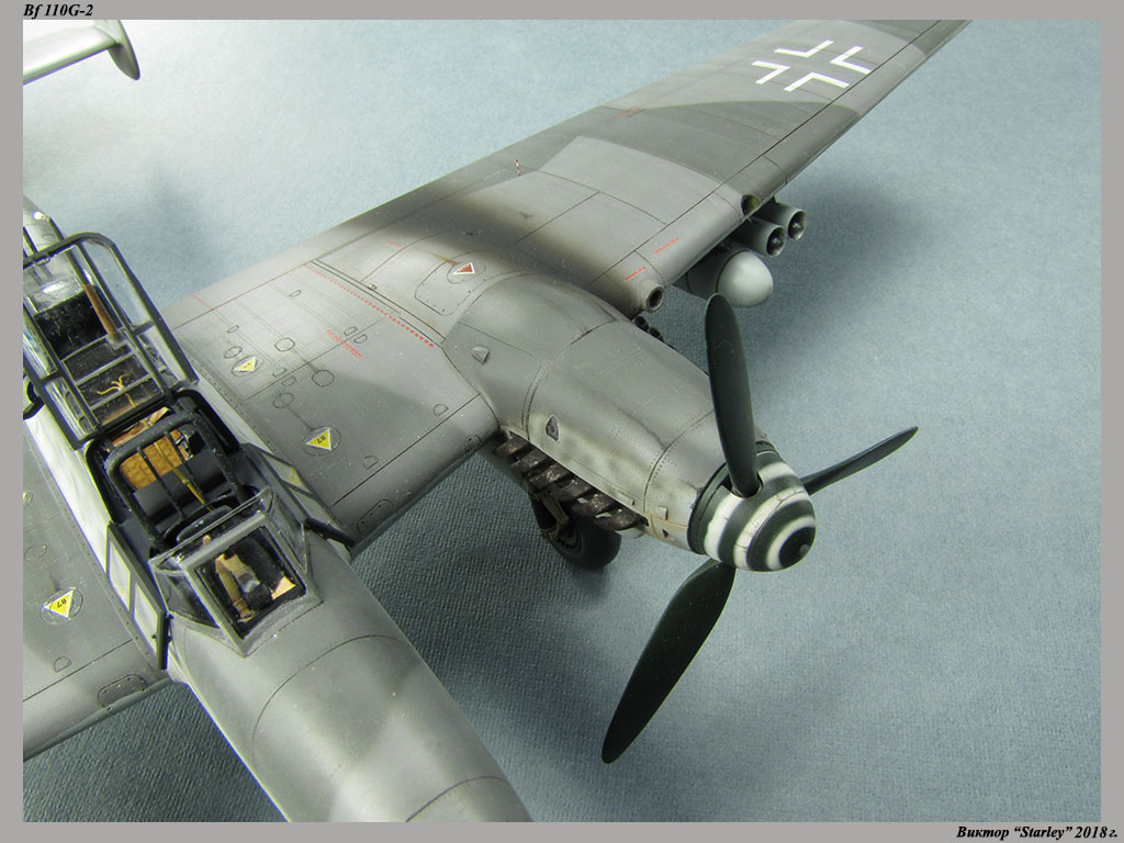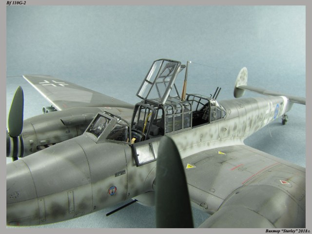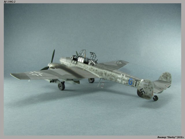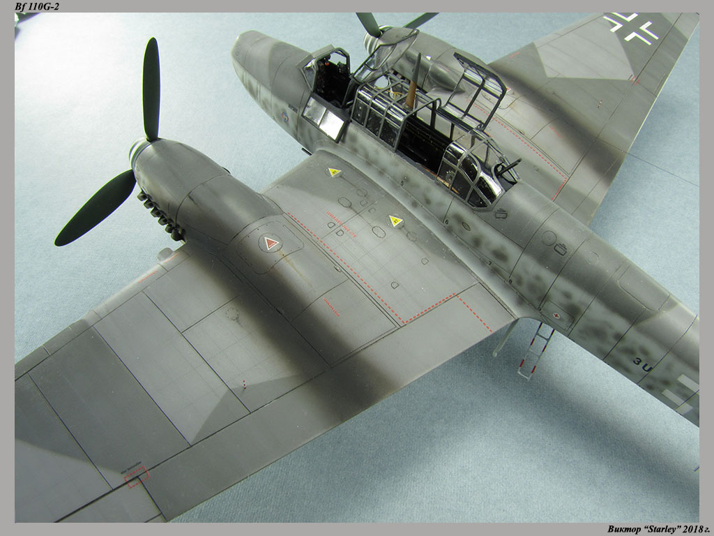 Приветствую уважаемое сообщество! Сегодня хочу Вам предоставить модель тяжелого истребителя Bf 110G-2 "Zerstorer" с комплектами M1,M2,M3 (пушки MG151 в подфюзеляжной гондоле, 300-л подвесные топливные баки и контейнеры с Wfr.Gr.21), предназначенного для уничтожения тяжелых бомбардировщиков союзников в небе Рейха. Прототип состоял на вооружении 9./ZG26 "Horst Wessel" и базировался осенью 1944г. на аэр. Кёнигсберг-Ноймарк. Модель строилась в рамках ГБ "Воздушный бой-3", но к его окончанию я не успел, к сожалению. Информацию по самолету приводить не буду, уж очень ее много в сети.Сама модель собирается очень хорошо, практически "на щелчок" (шпатлевки использовался вообще мизер), за исключением маслорадиаторов двигателей, над которыми пришлось изрядно повозиться. Кроме того, пластик у производителя оказался очень интересным- к нему практически не пристает шпатлевка- через некоторое время начинает трескаться и отваливаться, обнажая расплавившуюся под ней основу. Но все равно пришлось приложить руки, доработаны:-полностью дорезана/перерезана расшивка;-накатана клепка;-пушки в гондоле сделаны из игл;-прокинута проводка в кабине;-протянуты магистрали по стойкам шасси;-переделана хвостовая опора;-заново сделан прицел;-"открыта" створка кабины стрелка-радиста, а также сделан механизм ее закрытия;-сделана противокапотажная рама в кабине летчика;-сделаны гидроцилиндры уборки основных стоек шасси;-сделан силовой набор в нишах основных стоек шасси;-сделана фара, отражатель и стекло;-ПВД из игл;-переделаны тоннели гликолевых радиаторов;-сами радиаторы сделаны с нуля;-сделаны антенны системы слепой посадки;-сделана радиоантенна из бантика, а также "колокольчики" на нейВозможно что-то упустил, но это не принципально.Впервые применил "солевую" технику- понравилось! Одно но- после снятия соли модель надо ОЧЕНЬ хорошо мыть с водой, иначе под лаком начинают вылезать белесые пятна. Также впервые накрасил балкенкройцы, ну насколько же лучше декалей получается! Красил Mr.Color, пачкал маслом, пастелью, акварельными карандашами. Лак, глянец-футура, сатин-Tamiya. Из допов применены:-выхлопные патрубки QuickBoost;-пулемет MG-81Z Eduard;-маски на фонарь EduardВсе остальное вполне себе самодостаточно.