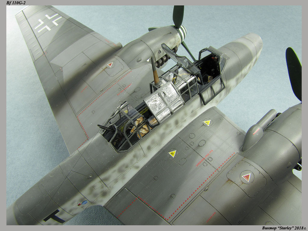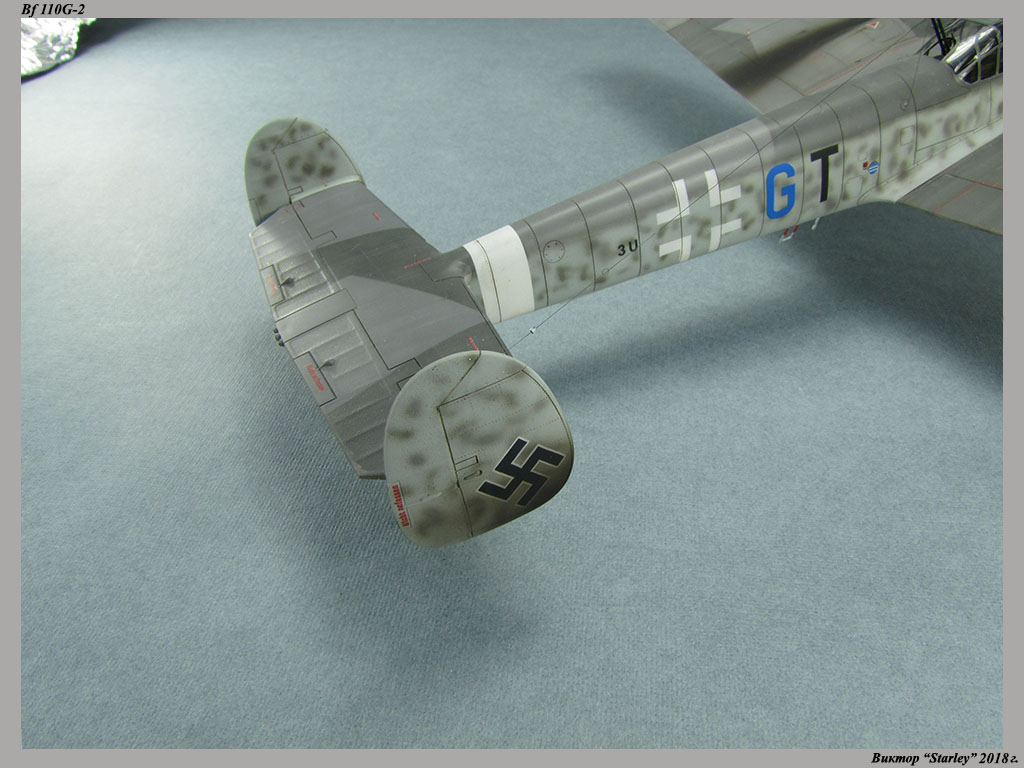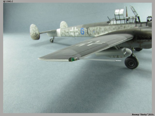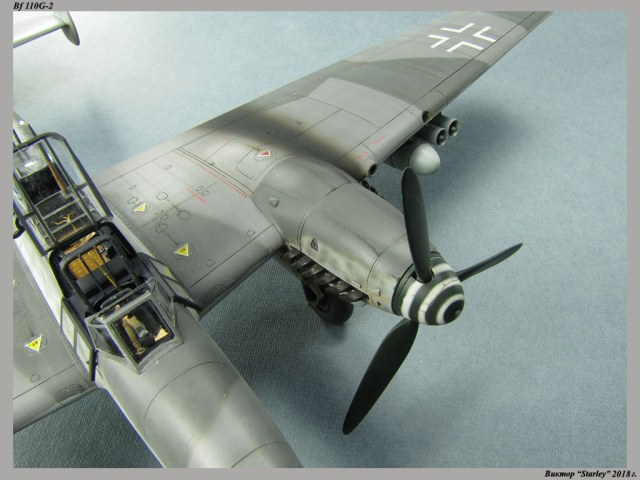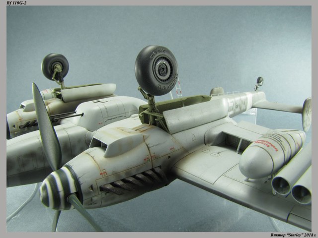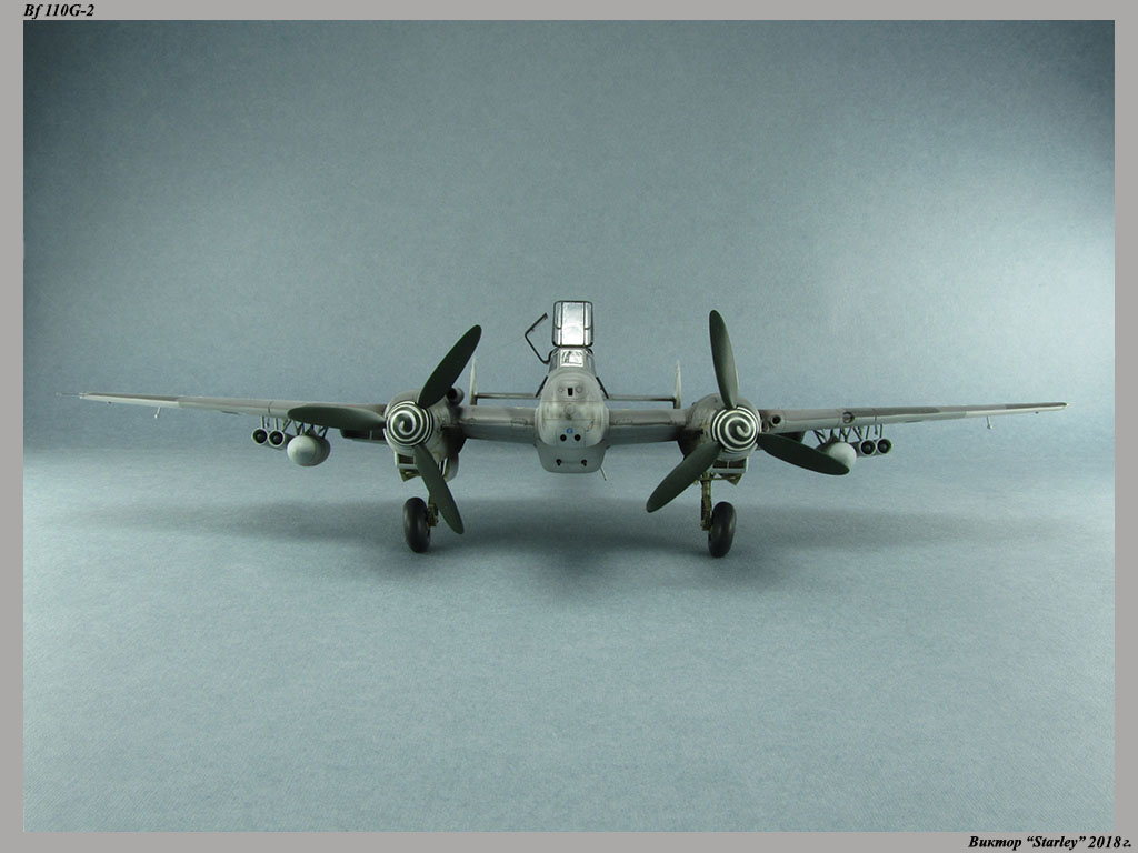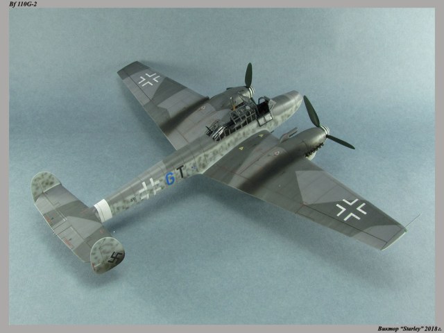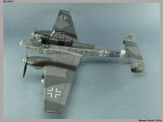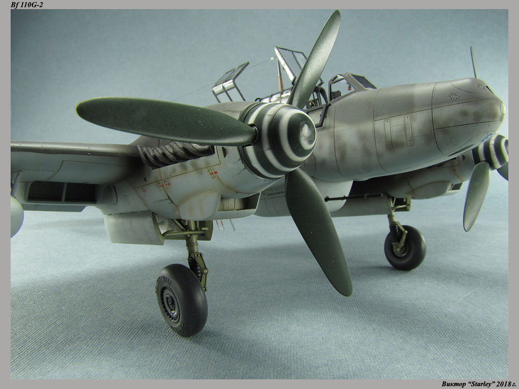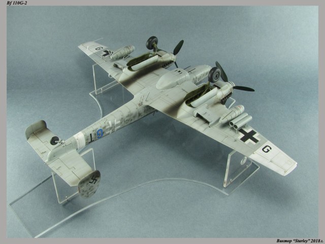 Приветствую уважаемое сообщество! Сегодня хочу Вам предоставить модель тяжелого истребителя Bf 110G-2 "Zerstorer" с комплектами M1,M2,M3 (пушки MG151 в подфюзеляжной гондоле, 300-л подвесные топливные баки и контейнеры с Wfr.Gr.21), предназначенного для уничтожения тяжелых бомбардировщиков союзников в небе Рейха. Прототип состоял на вооружении 9./ZG26 "Horst Wessel" и базировался осенью 1944г. на аэр. Кёнигсберг-Ноймарк. Модель строилась в рамках ГБ "Воздушный бой-3", но к его окончанию я не успел, к сожалению. Информацию по самолету приводить не буду, уж очень ее много в сети.Сама модель собирается очень хорошо, практически "на щелчок" (шпатлевки использовался вообще мизер), за исключением маслорадиаторов двигателей, над которыми пришлось изрядно повозиться. Кроме того, пластик у производителя оказался очень интересным- к нему практически не пристает шпатлевка- через некоторое время начинает трескаться и отваливаться, обнажая расплавившуюся под ней основу. Но все равно пришлось приложить руки, доработаны:-полностью дорезана/перерезана расшивка;-накатана клепка;-пушки в гондоле сделаны из игл;-прокинута проводка в кабине;-протянуты магистрали по стойкам шасси;-переделана хвостовая опора;-заново сделан прицел;-"открыта" створка кабины стрелка-радиста, а также сделан механизм ее закрытия;-сделана противокапотажная рама в кабине летчика;-сделаны гидроцилиндры уборки основных стоек шасси;-сделан силовой набор в нишах основных стоек шасси;-сделана фара, отражатель и стекло;-ПВД из игл;-переделаны тоннели гликолевых радиаторов;-сами радиаторы сделаны с нуля;-сделаны антенны системы слепой посадки;-сделана радиоантенна из бантика, а также "колокольчики" на нейВозможно что-то упустил, но это не принципально.Впервые применил "солевую" технику- понравилось! Одно но- после снятия соли модель надо ОЧЕНЬ хорошо мыть с водой, иначе под лаком начинают вылезать белесые пятна. Также впервые накрасил балкенкройцы, ну насколько же лучше декалей получается! Красил Mr.Color, пачкал маслом, пастелью, акварельными карандашами. Лак, глянец-футура, сатин-Tamiya. Из допов применены:-выхлопные патрубки QuickBoost;-пулемет MG-81Z Eduard;-маски на фонарь EduardВсе остальное вполне себе самодостаточно.