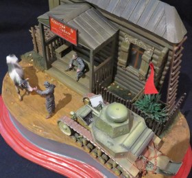 Соглашусь с первым комментатором, который справедливо заметил, что издали работа неплохая, но вблизи заметна куча косяков. По композиции и подставке - зачем было делать такой постамент, если в работе нет ни траншей, ни окопов с воронками? Его высота избыточна, он вообще никакой роли не играет и не нужен. Работу можно было разместить непосредственно на подставке. Цвет подставки излишне ядовитый. Основание,а это основной и частый недостаток работ начинающих, очень мала. Танк стоит впритык, практически падает с основания, с другой стороны, он непозволительно близко стоит у дома. Надо до расстановки обьектов как-то прикидывать их взаимное расположение. Грунт слишком однороден. Про косяки со сняряжением и формой - указали. Танк от ХБ косячен - никак не исправили ходовку. Дом сделан грубовато, надпись кривая - можно было декаль заказать или распечатать. Дом очень странный с архитектурной стороны.