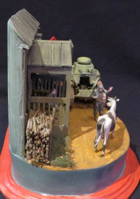 Кстати, Владлен, а может вам и правда сделать забор и может часть крыльца сломанными, как раз подвинуть танк немного. Тогда все встанет на свои места, танкисты разбираются с коровой и добавить председателя с кем нибудь из местных жителей. Думаю такая доработка не потребует ничего сложного, а картинку внешне и логически поправит в лучшую сторону.