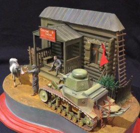 Представляю небольшую диорамку по мотивам ,проводимых войсковых маневров в конце 20-х годов прошлого столетия. В работе использовались: танк от Hobby Boss и фигурки от MasterBox. В изготовлении здания использовал палочки для суши и шпон из подставки под горячее. В основании применил пенопласт и рекламный пластик.