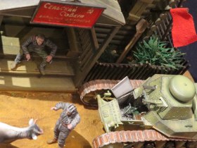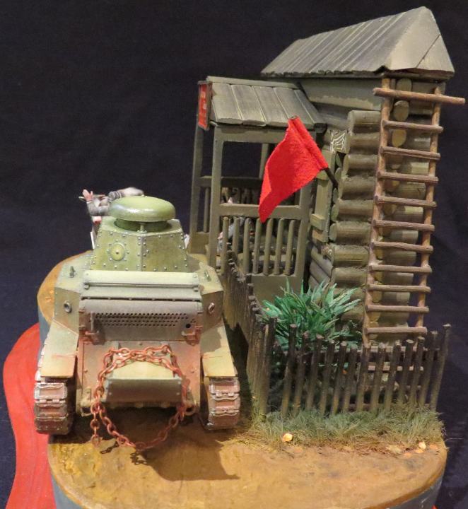 Композиция танка на краю диорамы мешает, об этом сказали. Тут еще задело другое - танк очень близко стоит к штакетнику, а он не автомобиль - при повороте налево задницей забор повалит.