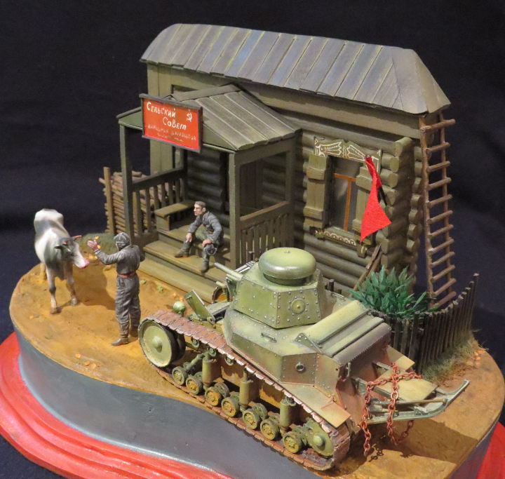 Работа явно привлекает внимание, общая картина мне понравилась. Наверное за счет обильного красного цвета, выглядит ярко и хочется рассмотреть и в целом как диорамка симпатично выглядит. А вот рассматривая и читая полемику во многом соглашусь с "упрямым критиканом" Михаилом Уколовым)))) С основанием действительно не очень получилось, висит танк, даже тень падает, некрасиво.(И не только танк, но и дрова, но это не бросается в глаза))) Поменять местами танк и корову уже было бы места танку достаточно. Грунт в желтизну мне кажется сильно ушел. Флаг совершенно точно из ткани не к месту, кукольно смотрится и бросается в глаза как инородное тело. По зданию я думаю чего только в союзе не понастроено было и почему бы нет, но вот профиль бревен - палочки от суши дают себя распознать... Вывеска особо не смущает, художник мог от руки и таким макаром написать, для сельской местности сойдет как говорится))) По танку с Уколовым трудно не согласиться, уж на матчасть то он не слабо упарывается, но за интерьер мог бы похвалить вас конечно))) интерьер как по мне это отдельная песня и страхи его делать... По фигуркам: по скульптуре МастерБокс он и есть Мастербокс, морды квадратные и страшные, пропорции тел и складки одежды порой вызывают полное отвращение и красить их приходится долго и упорно через не могу и то, если их обточить как следует. Но все же тот же Уколов красит фигурки определенно и круче вас, это только слепой не увидит. Ну а то, что работа в каких то выставках заняла призовые места это хорошо и значит она не плохая уж точно, но в то же время и ничего не значит еще. У меня работ немного выложено здесь, но все три плюс, те что не выложены (мне их даже стремно выкладывать если честно) занимали в моем городе 1 места в выставках, но косяков в них это не отнимает, просто другие работы были чуть хуже, вот и все. Это уровень всего лишь одного какого то города и не факт, что в городе нет более крутых работ и моделистов,а они не выставлялись, по домам сидят и не знают про выставки. Вроде все сказал, что думаю))) кроме коровьего вымени, которое выглядит как надутая резиновая перчатка, реально. И да, это не критика, я ни грамма не хочу говнить вашу работу и надеюсь никто не хочет, нормальная работа, это скорее "Как бы и чего я не делал" и постарался бы исправить до ее завершения...