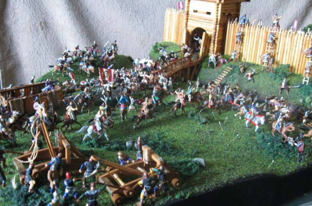 Для изготовления диорамы использовал наборы русичей и татар фирмы Орион, Катапульты и таран самодельные из груши, на стены пошли рейки из сосны и шпон лиственницы и бука покрытые льняным маслом. Основание из пенопласта, покрытый сатенгипсом. Трава мелко порезанная пеньковая веревка, покрашенная гуашью и зеленый чай перетертый в кофемолке.