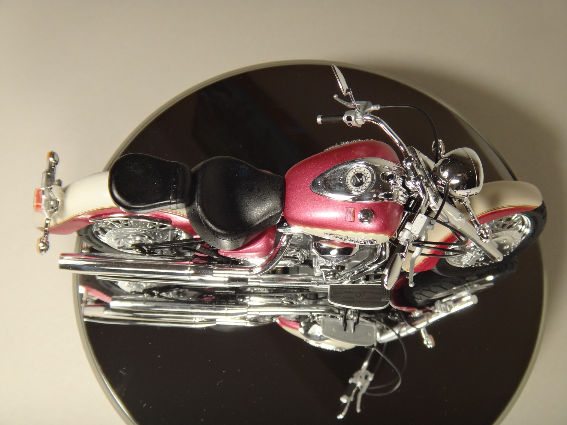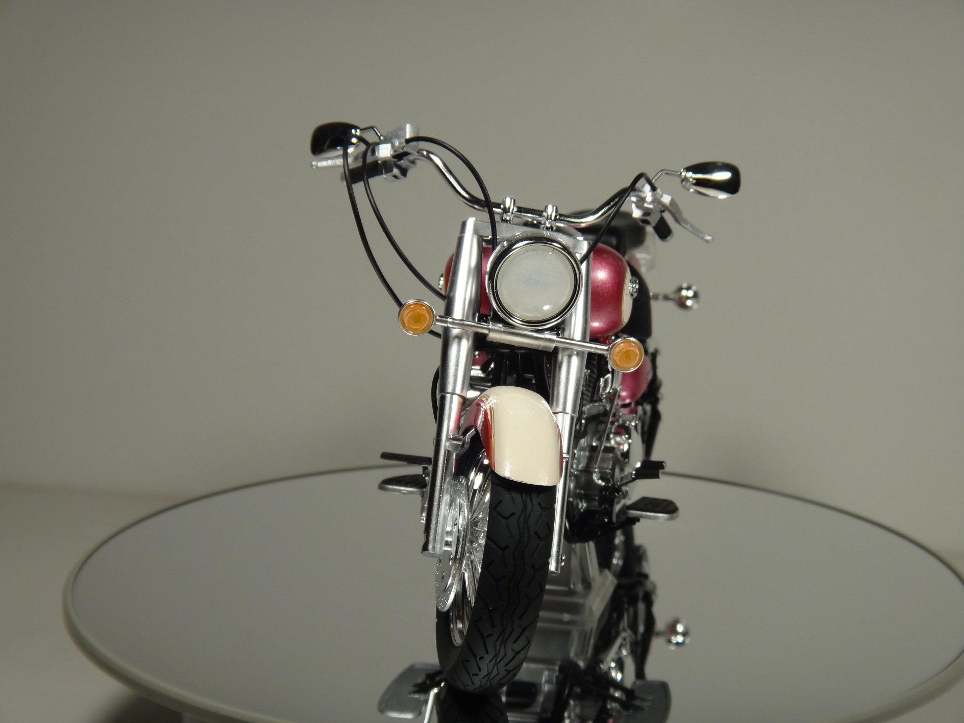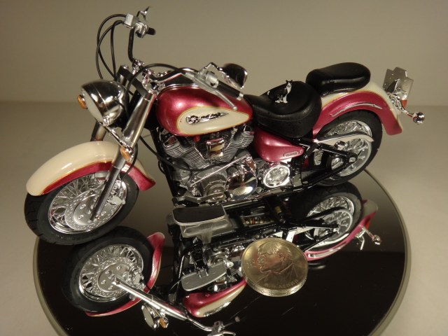 Помимо фары- бледный задний фонарь. Противоестественный, для сияющего чоппера с мотором 1,6, маслянистый нагар в дымоходах, как на ушатанном 2Х-тактнике. В остальном- смотрится весьма правдоподобно.
