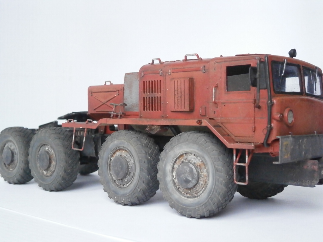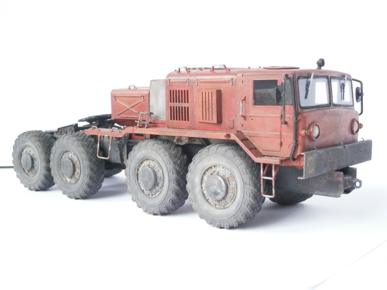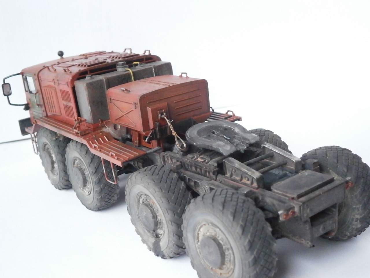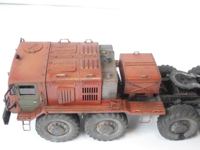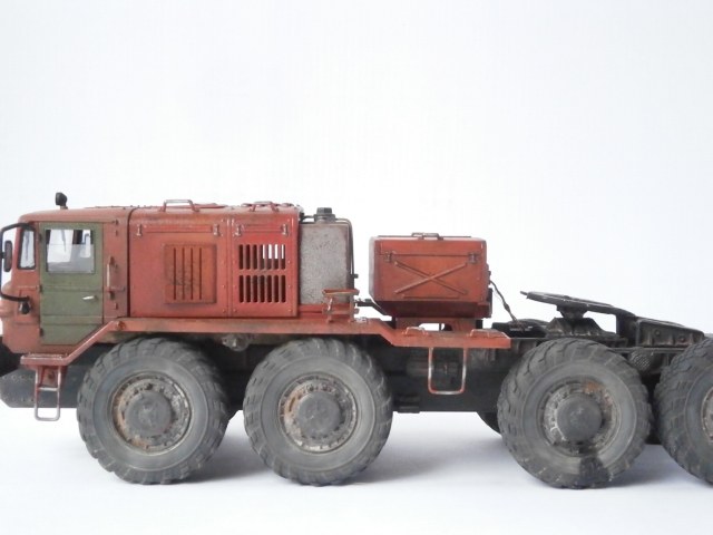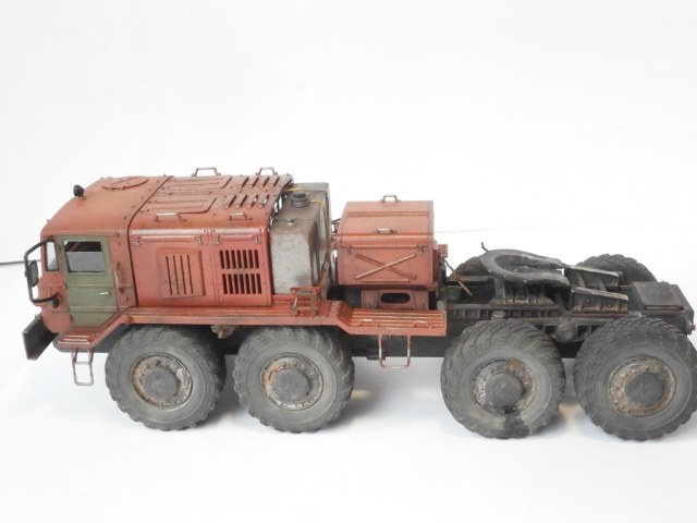 Маз должен был быть балластный тягач,но я собрал седельный. Топл.бак, седло и все стёкла самодельные, стекляшки фар подобрал из "запасов". Ну в остальном это обычная "изкаробка". Впервые осознанно пытался сделать смывку и впервые использовал столько лака. Матовый лак оказался совсем не матовый,модель местами поблёскивает. Вкратце как то так.