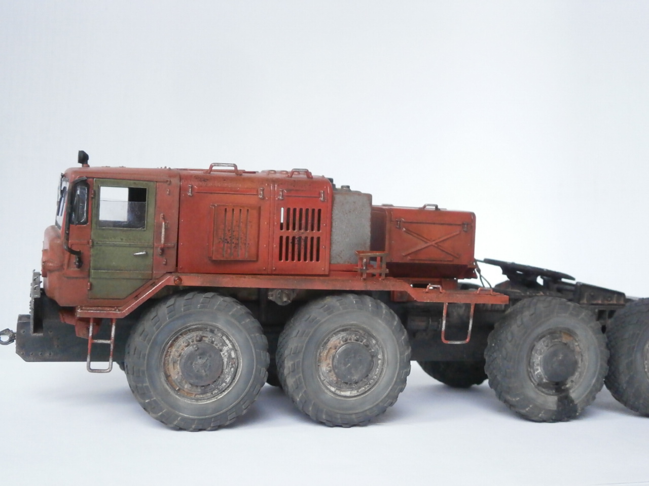 Очень хотелось покрасить в красный,а для этого цвета КЗКТ не подходит(ИМХО конечно)За те деньги,что стоит подобная модель китайцы могли бы и сами сделать заготовку под двигатель,у меня дорабатывать набор желания нет. МАЗ я сделал в своём любимом "колхозном" стиле,от сюда неправильно обутая резина(на некоторых шинах я пытался изобразить нагрузку,раз никто не заметил значит не получилось) и т.д.Набор мне достался не полный(выменял его у Ю.Зуйко на "Эльбрус"