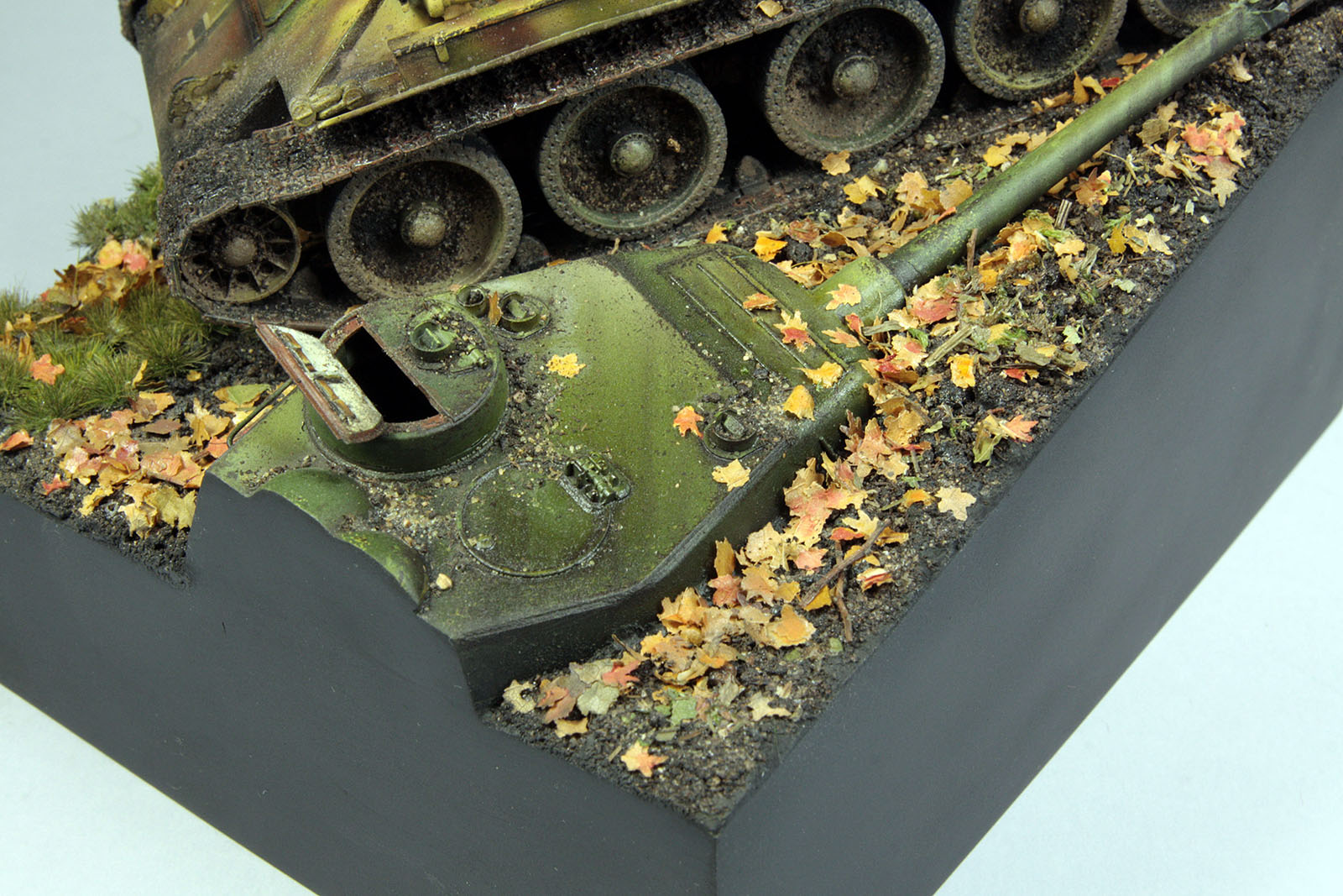 Танк дополнен полностью самодельной подставкой с листвой и травой от Modellers of fortune, которые пришлось тонировать акрилом и маслом, что бы всё выглядело целостно.