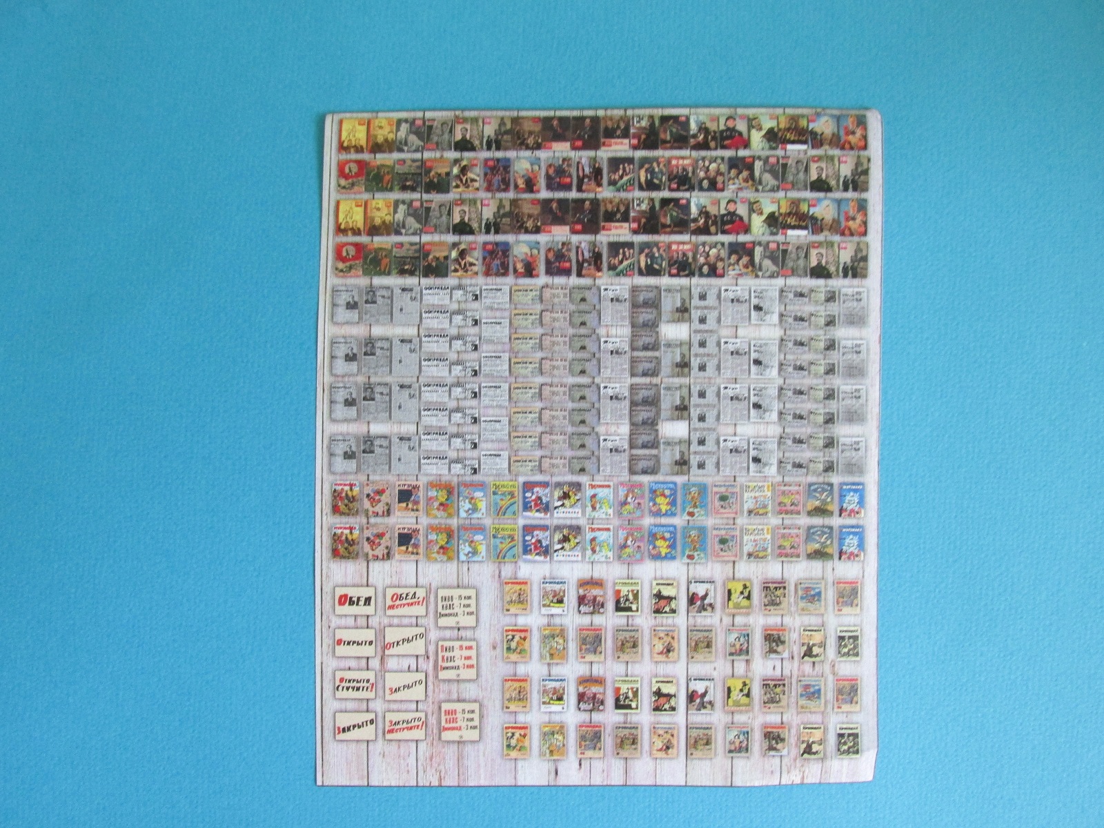 Во втором пакетике небольшой листик А5 с обложками советских журналов и газет. Выбор наименований периодических изданий не столь велико, каково оно было в при Союзе (коллеги по старше думаю подтвердят, выбор был действительно огромен), но киоск заполнить хватит, ещё и останется. Вариантов номеров довольно много. Каждый номер журнала повторяется от двух до четырёх раз, газеты по четыре, шесть и восемь раз. Качество полиграфии отличное.