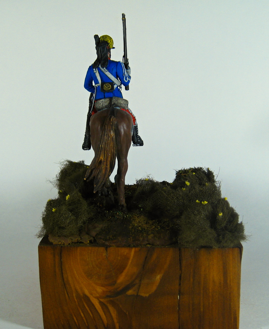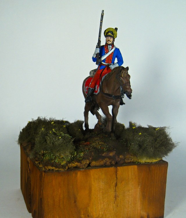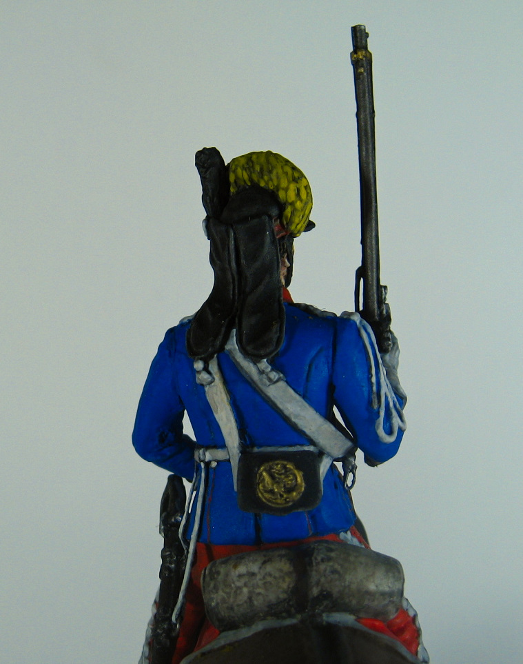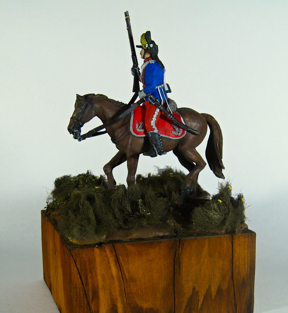 Здравствуйте. Вот, получилось нечто. Усредненный (классический)) вид рядового легкоконного полка русской армии на период 1786-96 годов. Фигурка очень замылена, хотя и относительно новая. Акрил, эмаль, масло.