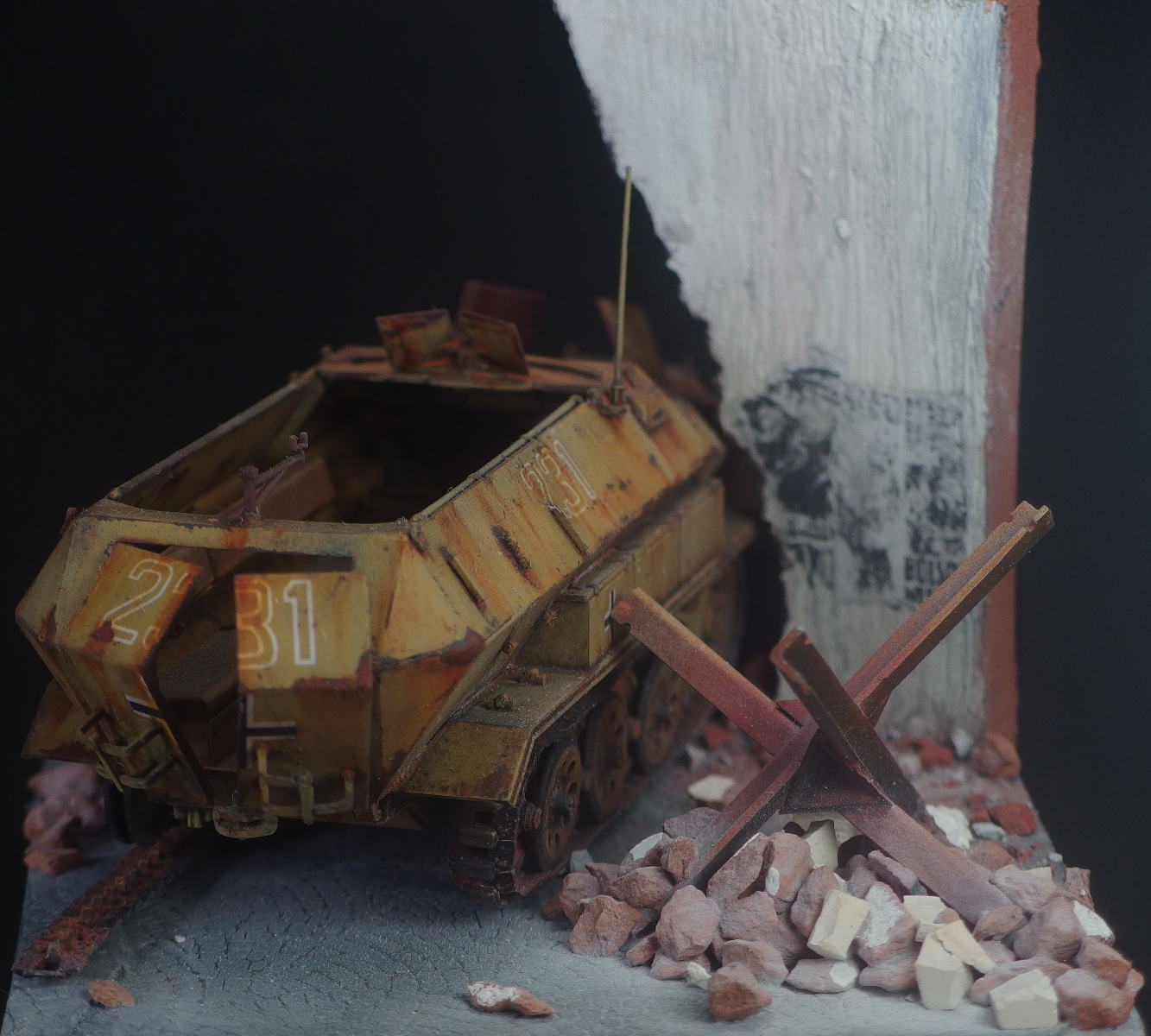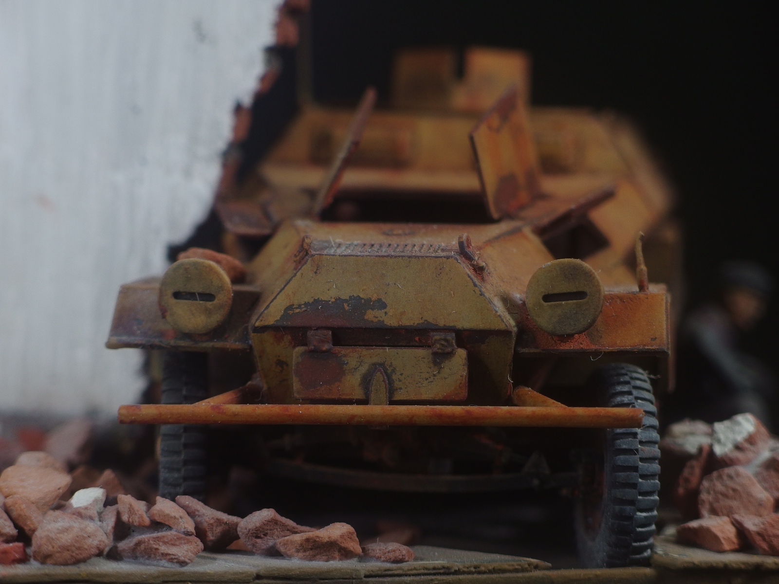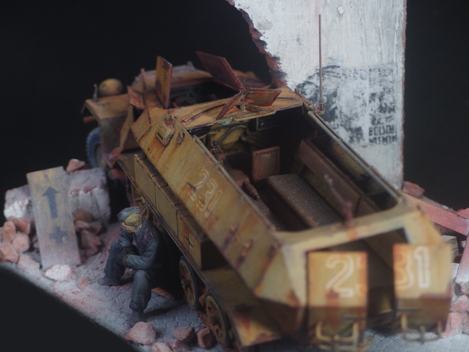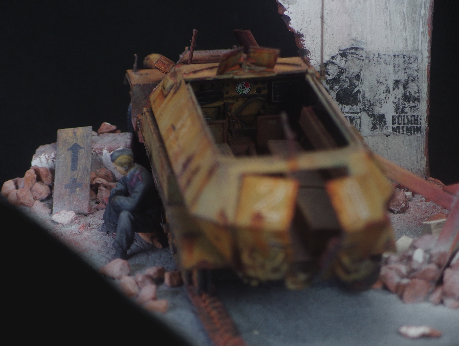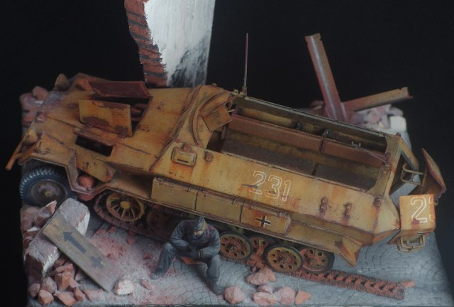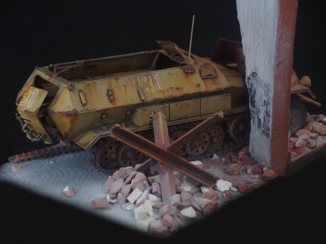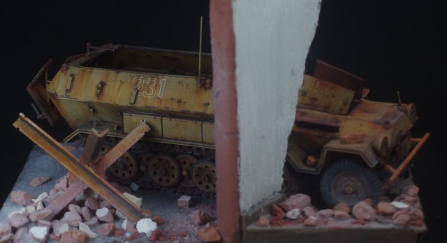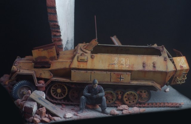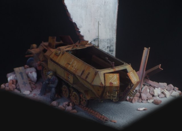 Диорама не привязана к конкретному фестунгу, а показывает собирательный образ. Немецкий солдат запертый в городе присел подумать у разбитого бронетранспортёра. Как и машина, его армия на глазах превратилась из мощного оружия в бесполезную обузу, которая обречена торчать на месте пока кому-нибудь не приспичит от неё избавиться.