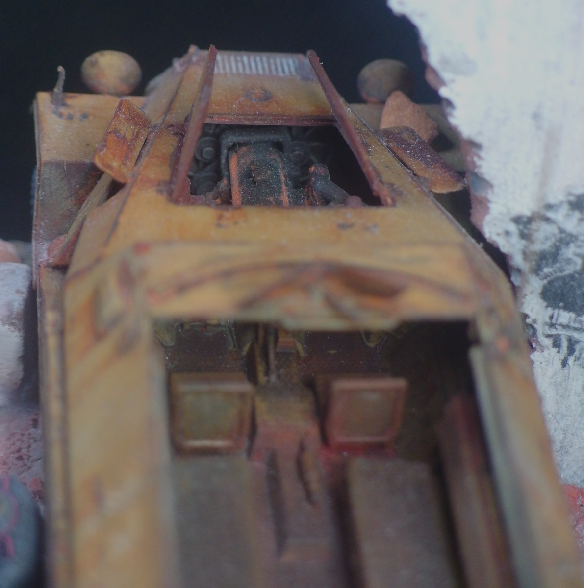 Согласен с Дмитрием. Машина выглядит на 25-30 лет простоя. Сделано очень хорошо, но для передачи атмосферы уныния можно было бы добавить кроме колотых кирпичей разной мелочёвки типа ящиков, бочек, оружия, гильз и т.д. и т.п...