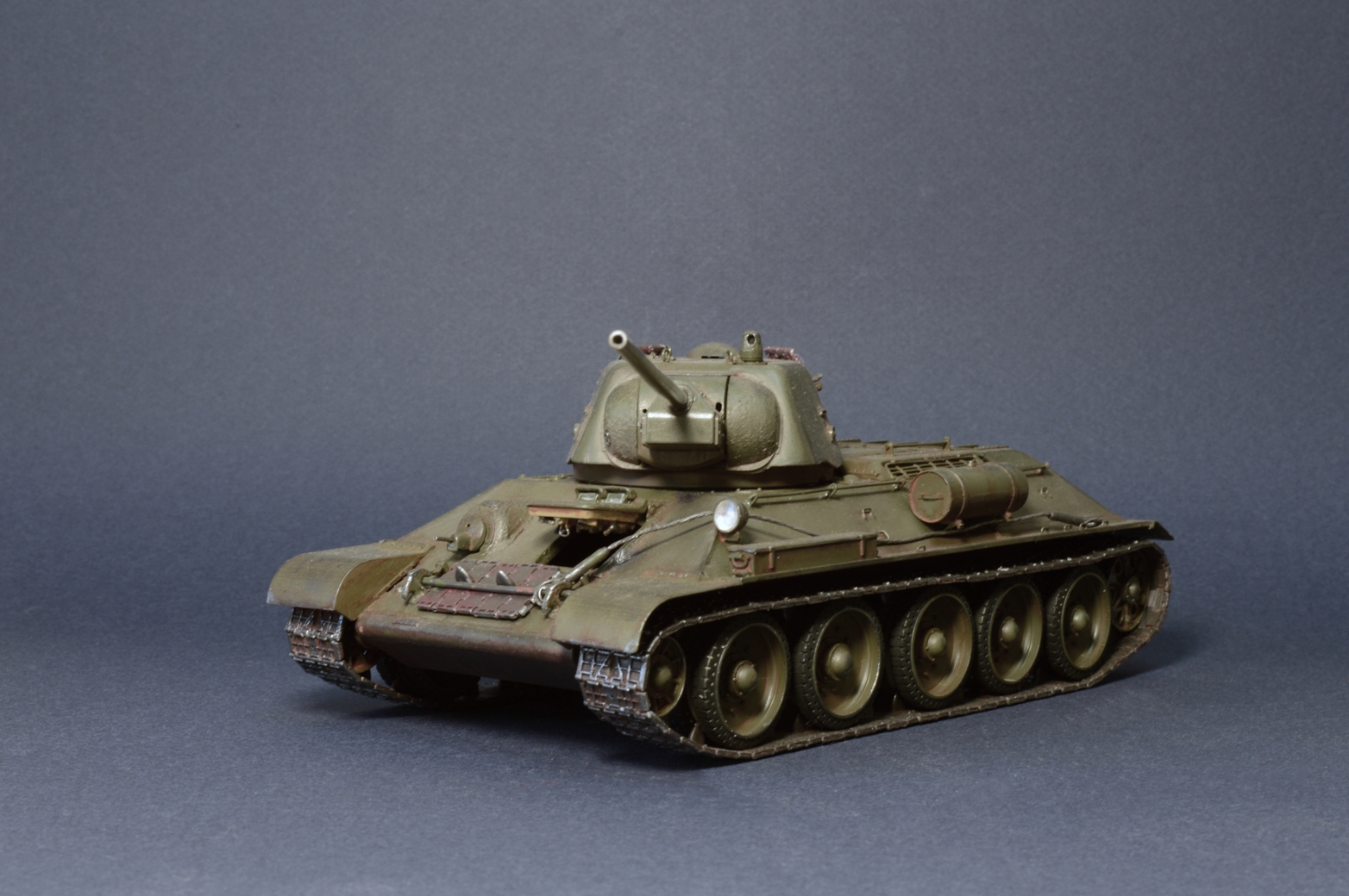 Корпус походит к первым серия Харьковского завода. Передняя балка клепка верх и низ. катки с миру по нитки от военных до послевоенных машин другого поколения. Ствол тоже непонятный, для 76 мм немного длинноват и толст.. Люк мехвода самый первый, баки явно не родные. Ленивец и ведущие явно не от этого корпуса. Башня гайка. Сомневаюсь что машина была в такой комплектации.