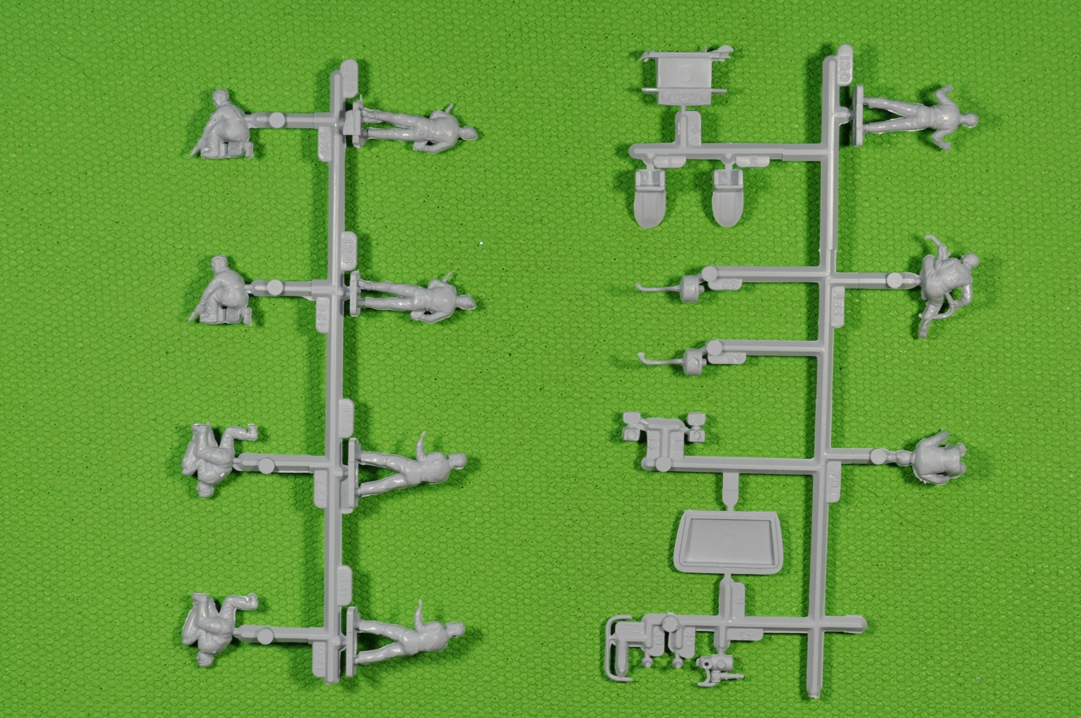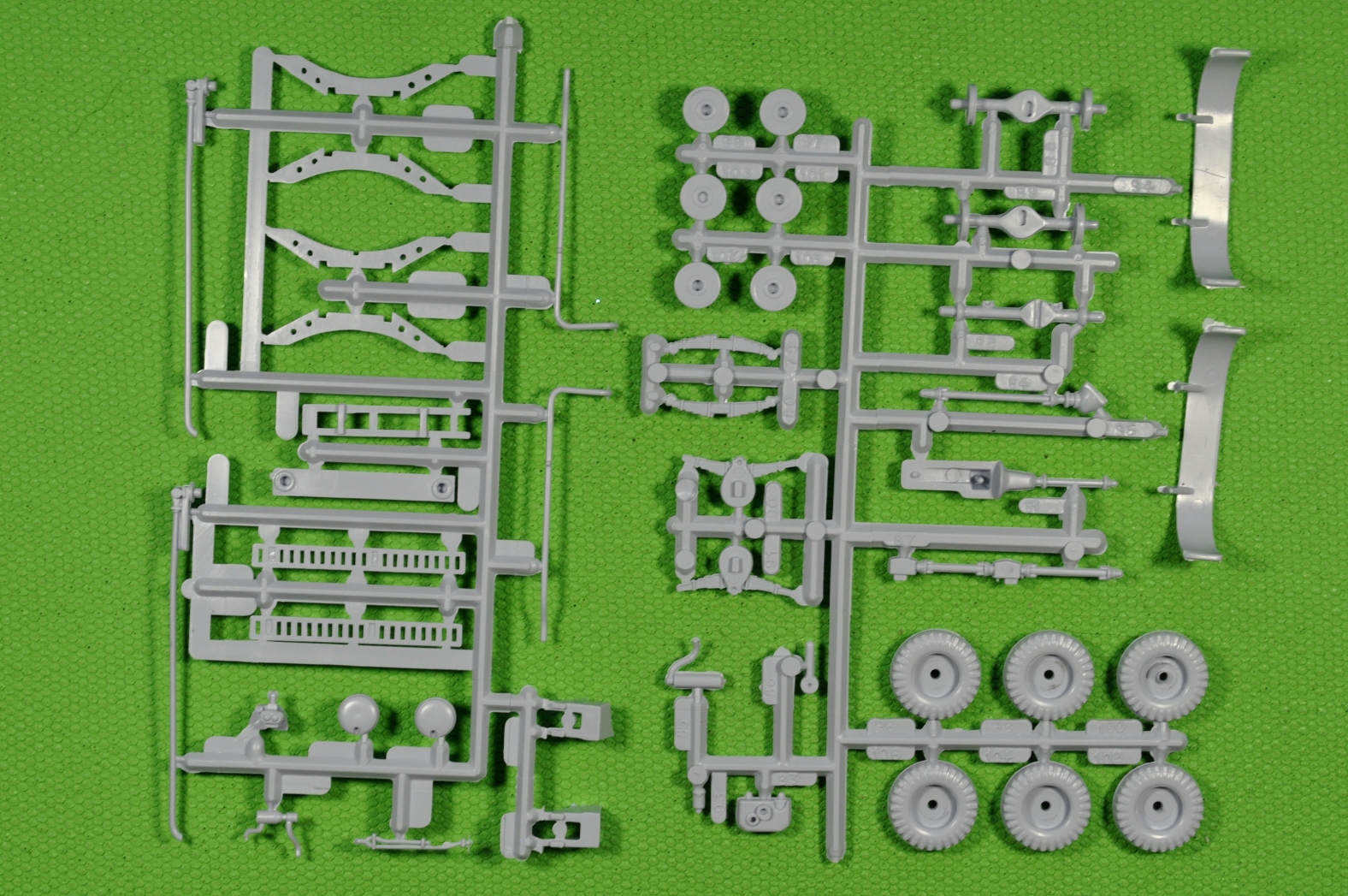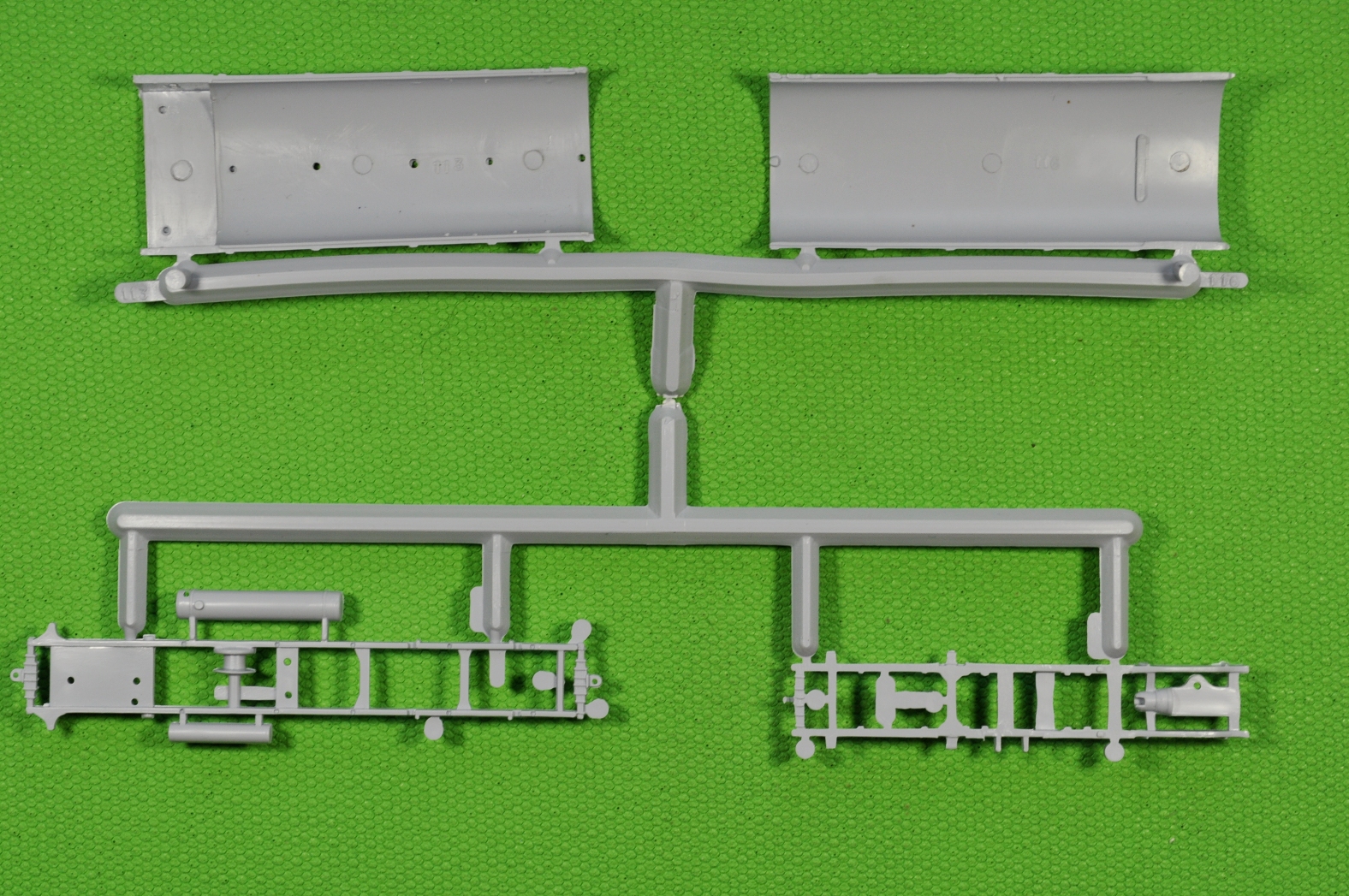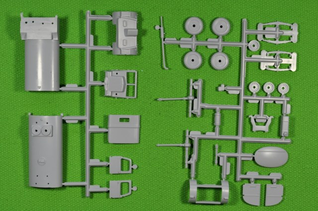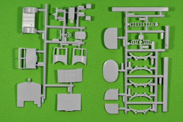 Литники, на современный взгляд, «безобразные» и насыпаны в коллективный пакет. Пластик литников однородный и приятный в обработке. При всей неказистости литников, детали набора отлиты качественно. Местами присутствует небольшой «пограничный слой» в месте смыкания пресс-форм. (Честно говоря, в процессе «гугленния» набора перед покупкой, ожидал более обильного облоя и худшего качества литья).