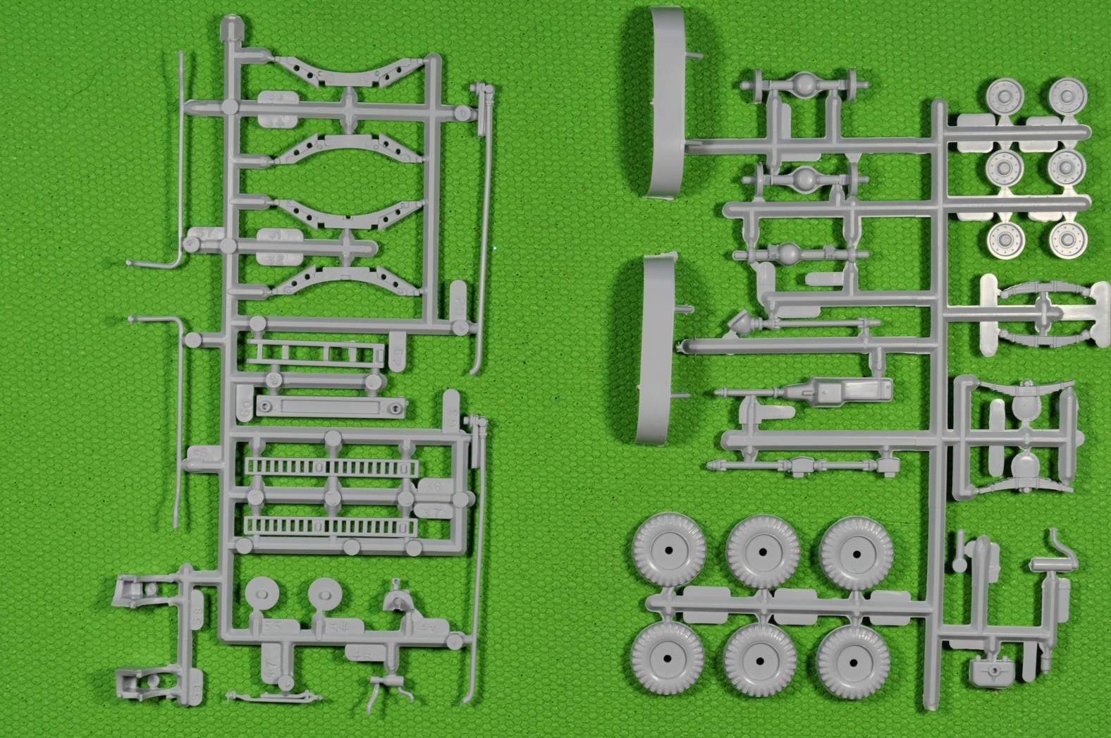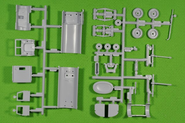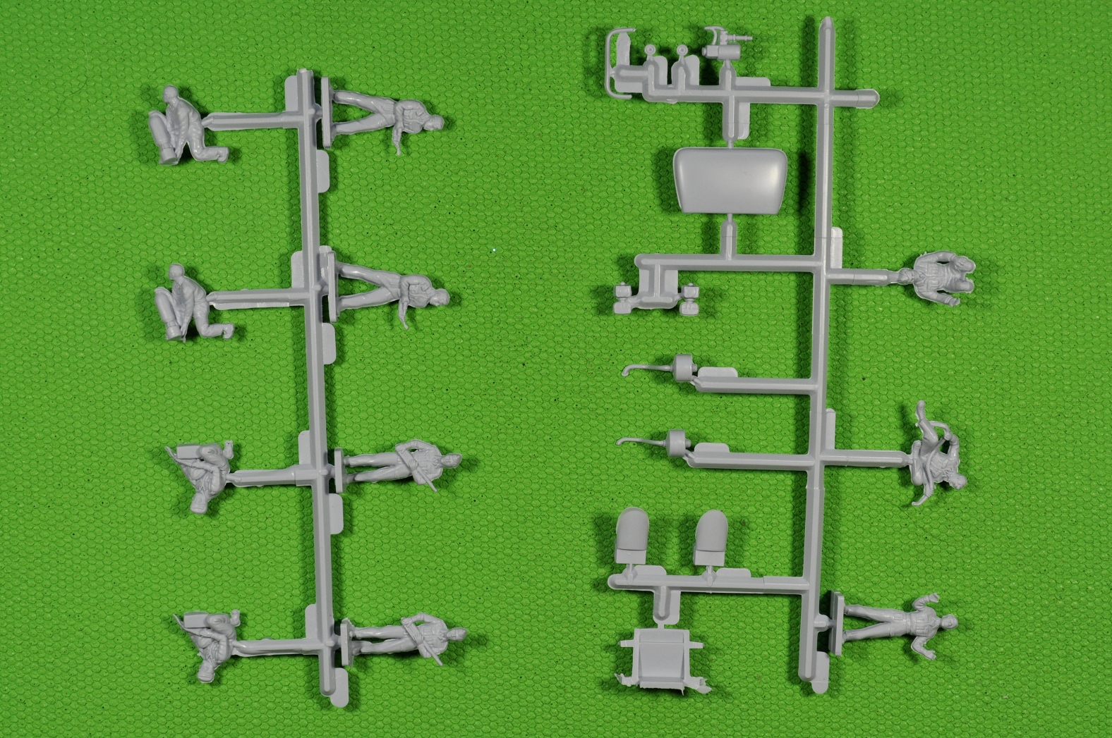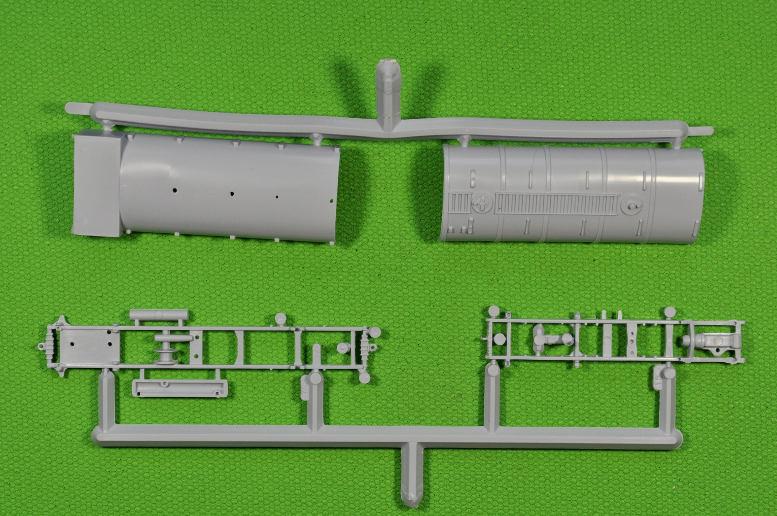 Литники, на современный взгляд, «безобразные» и насыпаны в коллективный пакет. Пластик литников однородный и приятный в обработке. При всей неказистости литников, детали набора отлиты качественно. Местами присутствует небольшой «пограничный слой» в месте смыкания пресс-форм. (Честно говоря, в процессе «гугленния» набора перед покупкой, ожидал более обильного облоя и худшего качества литья).