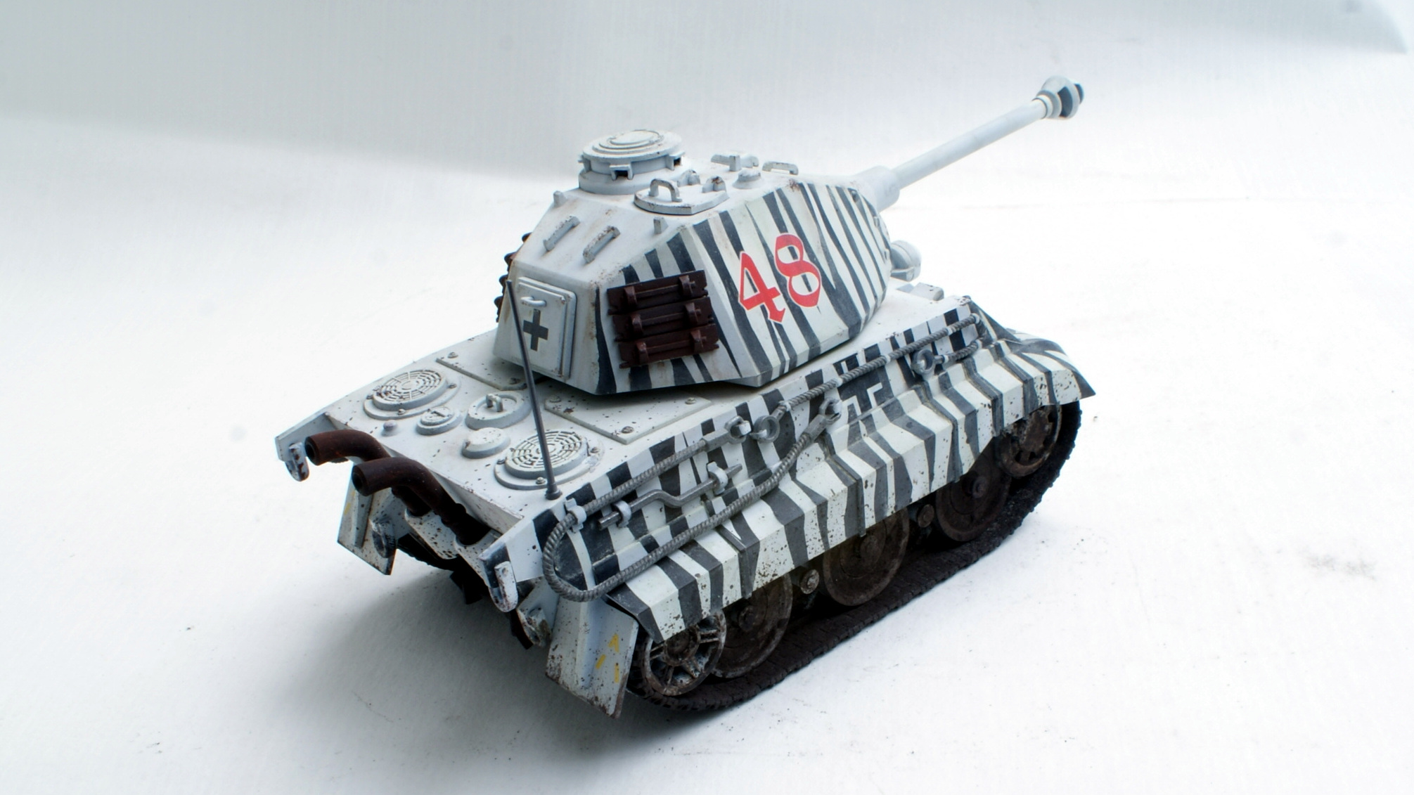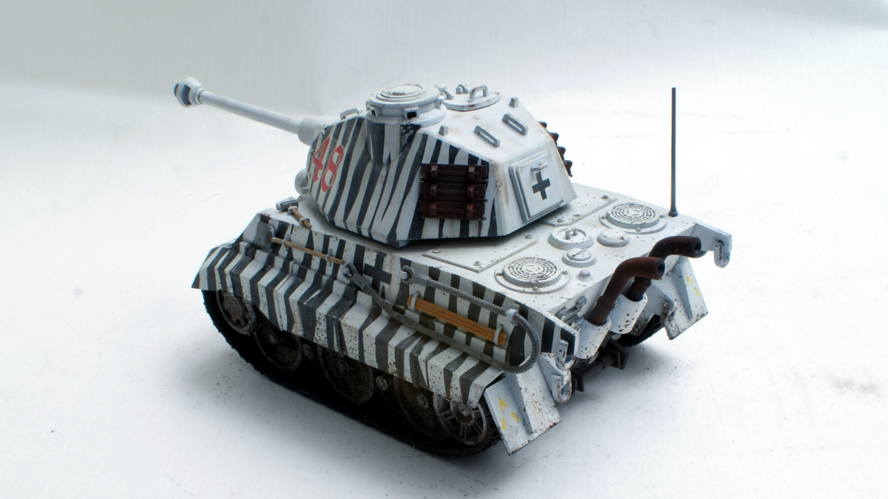 Собран без изысков, просто из коробки. Правда, пришлось выпиливать фару из того, что было в запасах, ибо родная была каким-то непостижимым образом потеряна. Из переделок только выдвинутые, как на настоящих тиграх, оси опорных катков (кто в теме, тот поймёт :) ). На окрас вдохновил такой же тигр, подсмотренный на themoddelingnews, только там в белый ему разукрасили только башню, я же решил пойти дальше.
