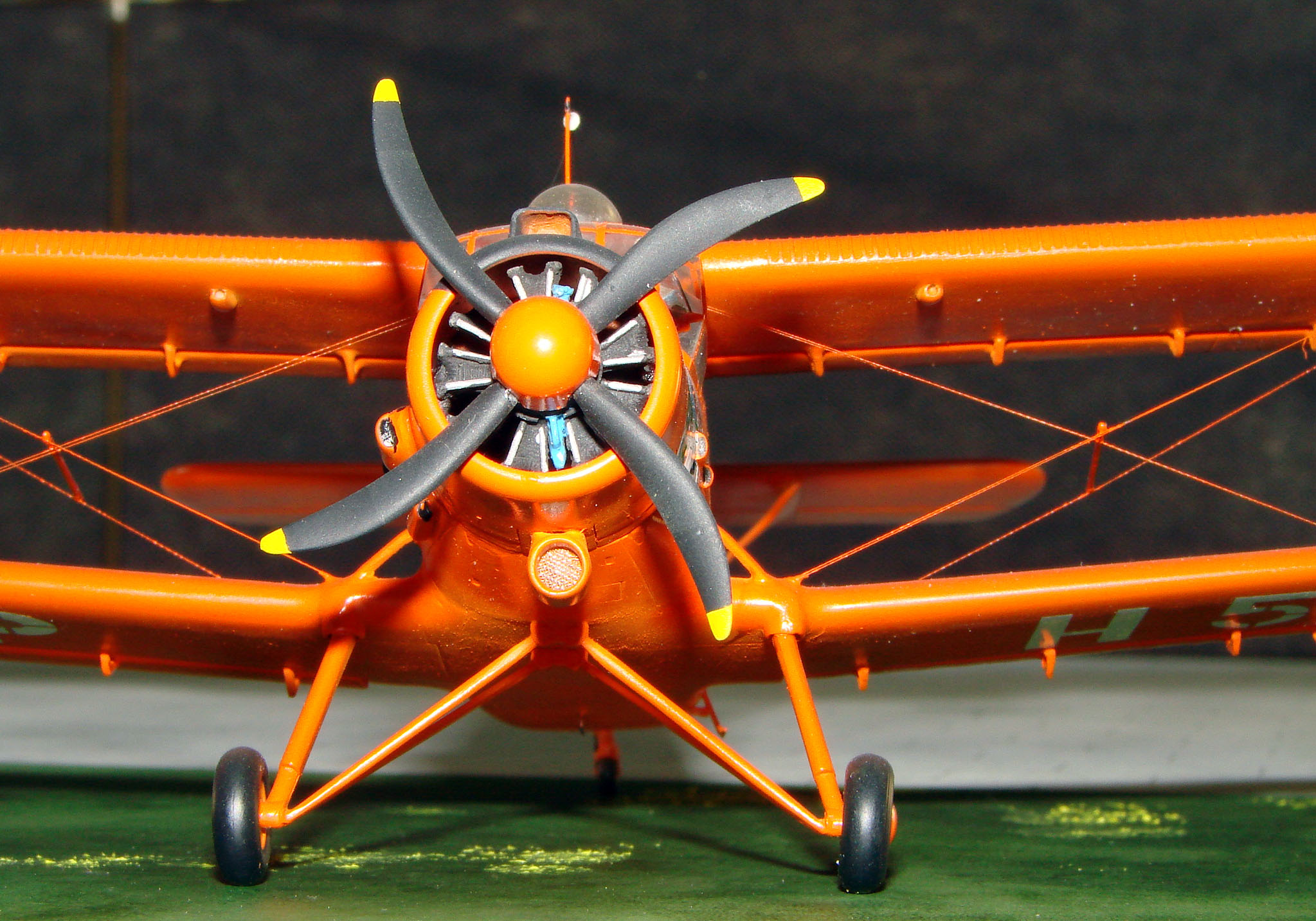 Всем привет. Представляю вашему вниманию модель Ан-2 образца 1957 г. в оригинальной раскраске Полярной авиации. Ан-2 в 72-м масштабе не редкость. Несколько лет назад Trumpeter, насытил рынок изделиями в собственных коробках и перепаковками. К сожалению, качество изготовления крыла убивает напрочь всякое желание продолжать работу, поскольку на нём совершенно карикатурным образом показаны нервюры и полотняная обшивка. Кроме этого отсутствуют такие приметные детали как гофр на лобике профиля и ребра жесткости на поверхности топливных баков. Положение исправила Italeri, перепаковавшая отливку Ан-2 от чешской фирмы Bilek, лишенную этих недостатков, в цветастую коробку с изображением Ан-2 на лыжах. Оранжевый Ан-2 с коком и астрокуполом на крыше - это что-то! С учётом того, что летом на Крайнем Севере по причинам полярного дня и сезонного характера экспедиций, Ан-2 летал чуть ли не круглые сутки, решено было поставить его на колеса. Кабина требует незначительной доработки. В иллюминаторы вклеиваются стекла вырезанные из прозрачного пластика толщиной ≈ 0,5 мм, а боковины кресел стачиваются до предела. В противном случае после установки боковых пультов, кресла будут перегораживать весь проход. Основные проблемы с фонарем кабины. В наборе он дается в виде совмещенной верхней и боковой частей и четырех фрагментов криволинейной формы, изображающих его нижнюю часть. Положение усугубляется неверным скруглением верха фюзеляжа в месте установки фонаря, Для исправления этого недостатка крайние боковые стекла отрезаются, а задняя стенка кабины расширяется за счет пластиковых надставок. После приклейки к фюзеляжу верхней части фонаря в образовавшийся проём вклеивается плоское стекло из пластика. Выступающая за контур фонаря часть надставки срезается, а ниша на фюзеляже ниша заполняется полиэфирной шпаклевкой BodyFine. Низ фонаря также собирается по частям из плоского пластика. После проклейки швов готовый фонарь прямо на модели шлифуется шкуркой и полируется пастой ГОИ (инструмент - кусок тонкого сукна, приклеенный на плоскую оправку). Доработки позволяют до некоторой степени исправить огрехи литья и подчеркнуть характерные черты фонаря АН-2: плоские панели и острые грани переплета. Завершая работу над фюзеляжем необходимо придать компенсатору руля направления обтекаемый аэродинамический профиль, в результате чего между ним и торцом киля должен образоваться хорошо видимый уступ. Сборка крыльев требует аккуратности, чтобы излишками клея не залить гофр на передней кромке. Обратите внимание: рефлекторы у фар разного размера. После склейки нижнего крыла посадочные места под фары были выровнены, а в их торцы вклеены рефлекторы, выдавленные из полированной алюминиевой фольги с помощью шарика от подшипника и резины. Остекление фар было заменено куском отполированного оргстекла вплотную прижатого к рефлектору и заполняющего с запасом все пространство фары. Закрылки и элероны навешиваются до установки крыла на фюзеляж. Обозначенная на закрылке разметка посадочных мест для крепления кронштейнов навески сошлифовывается, поскольку после подгонки контура законцовки, она не совпадает с разметкой на крыле. Перед склейкой закрылок выставляется относительно крыла с помощью двух пластин, прижатых прищепками к нижней поверхности профиля и распорных клинье