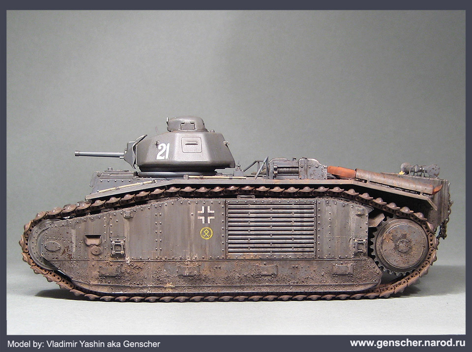 Тонировка заключалась в нанесении коричневого фильтра и темной смывки. Кроме того растер точки масляной краски серых и землистых цветов, чтобы усложнить оттенок брони. Сколы наносил песочным и зеленым, учитывая, что до пленения танк носил песочно-зеленый французский камуфляж (как н бекс-арте). На элементы добавленные немцами в ходе модернизации (огнеметная надстройка, цистерна для огнесмеси, домкраты) нанес сколы коричневого цвета, подразумевая сколы до грунтовки.