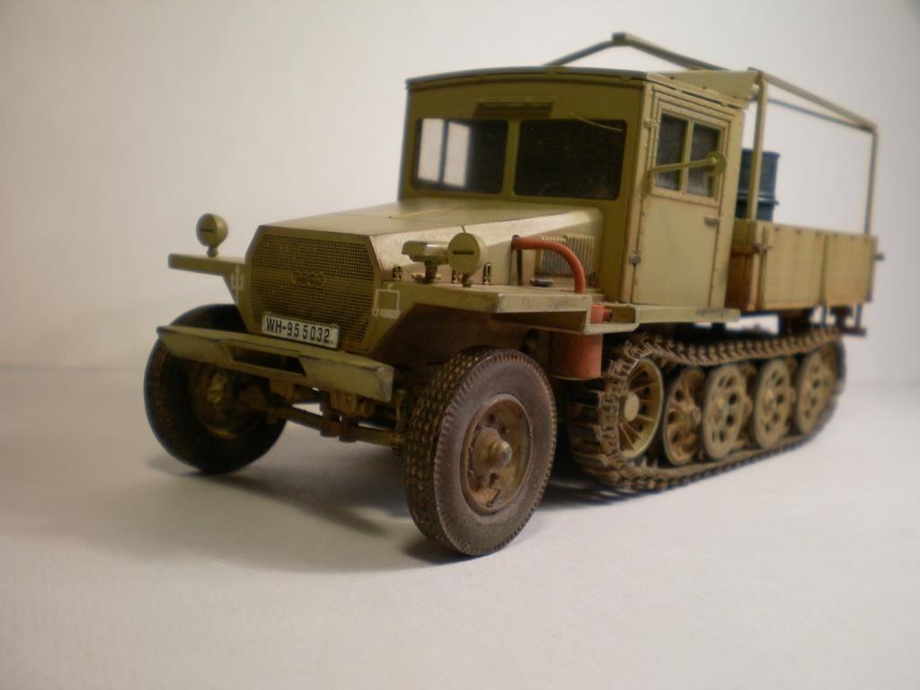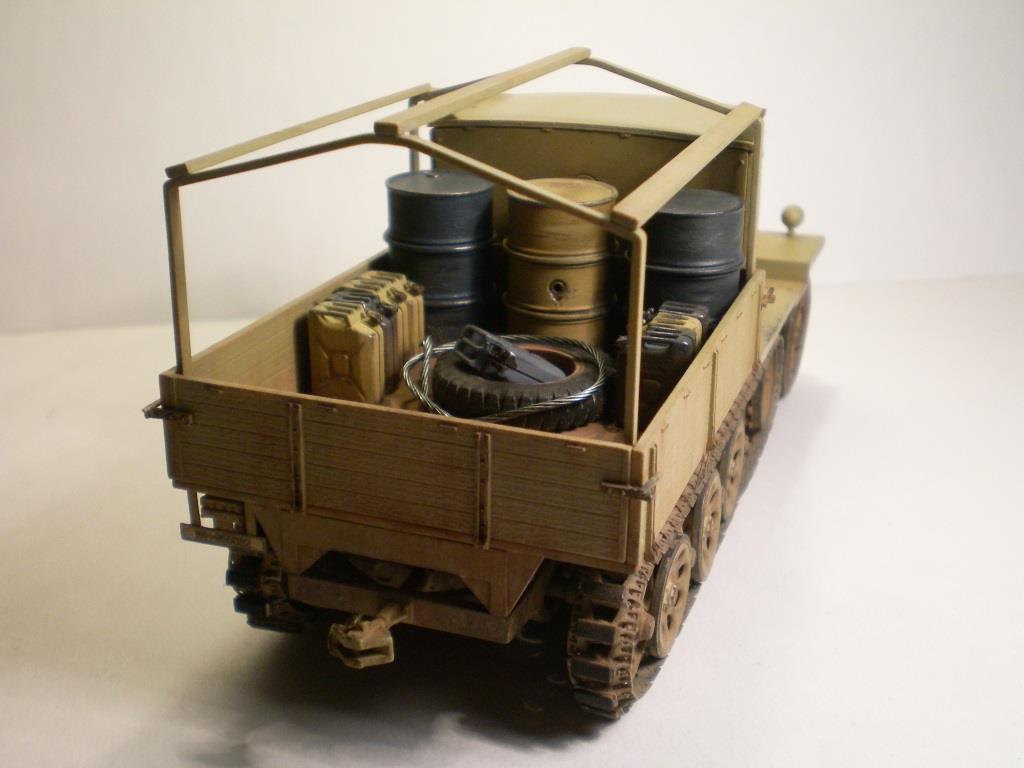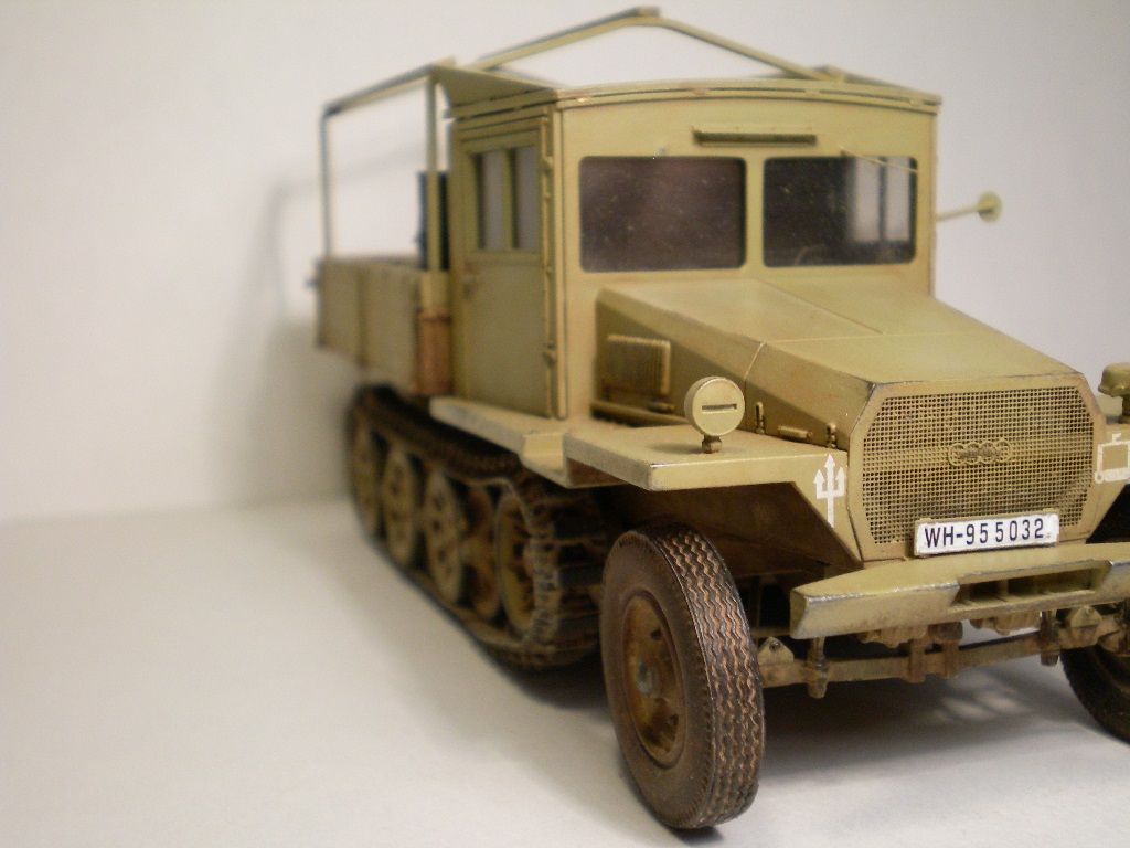 Сборка была лёгкой. Все детали стыковались идеально. Мелкие немасштабные детали лучше заменить фототравлением. Использовал травление фирмы Voyager Model. Заменил дворники (один отлетел - очень тоний, как секундная стрелка часов), зеркало заднего вида, накладки на кабину с клёпками и болтиками, номерные таблички, педали в салоне и т. д. Колёса поменял на смоляные с гражданским протектором фирмы MIG. Изкоробочные собираются из двух половинок - остаётся шов. Траки фирмы Friulmodel. Из набора виниловые пришлось выкинуть, они не дают провис. Наполнение кузова - бочки и канистры от Tamiya опеля блица, колесо в кузове тоже от него. Трос из магазина стройматериалов, стальной, диаметром 1 мм.