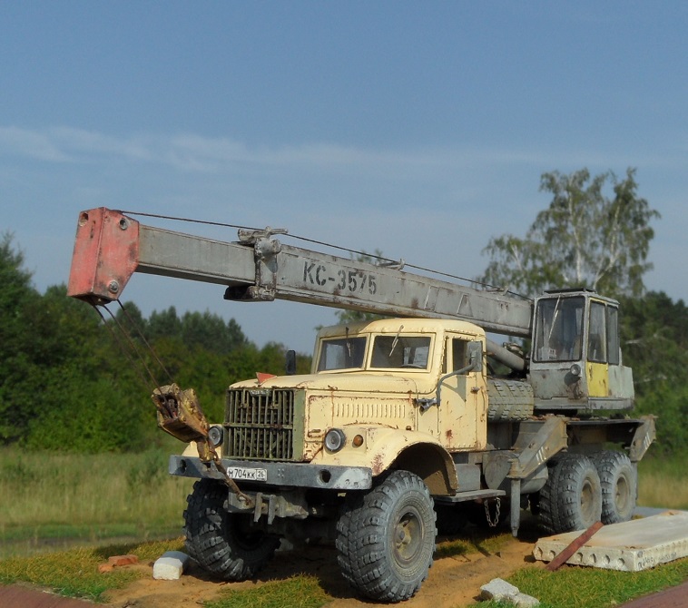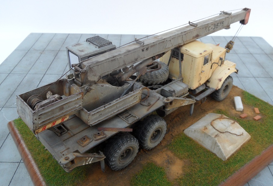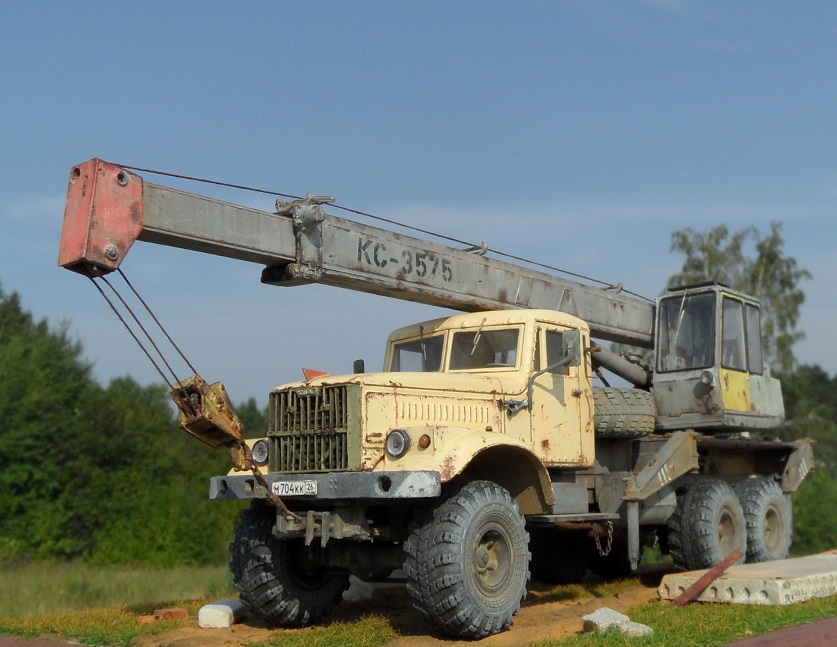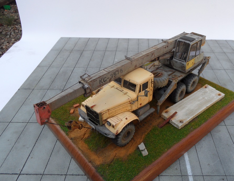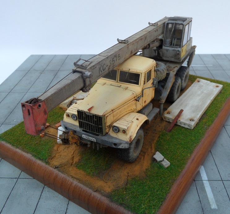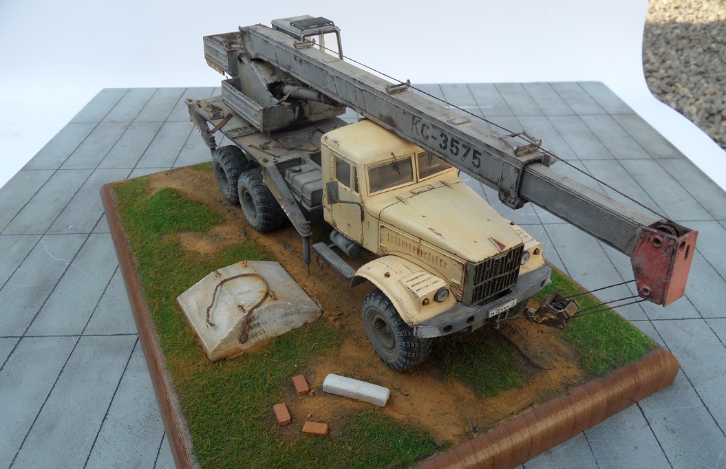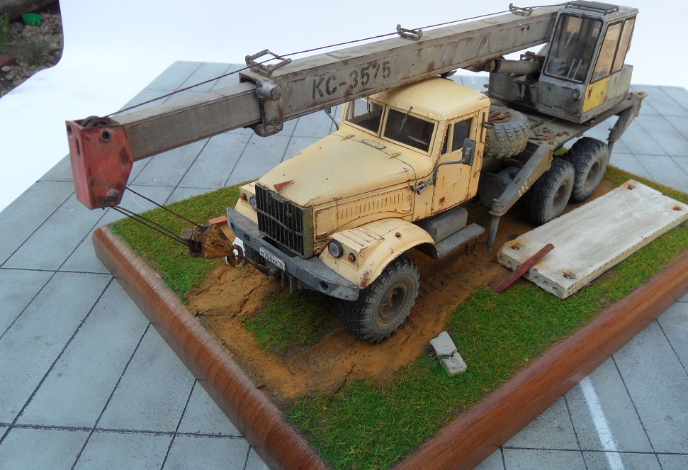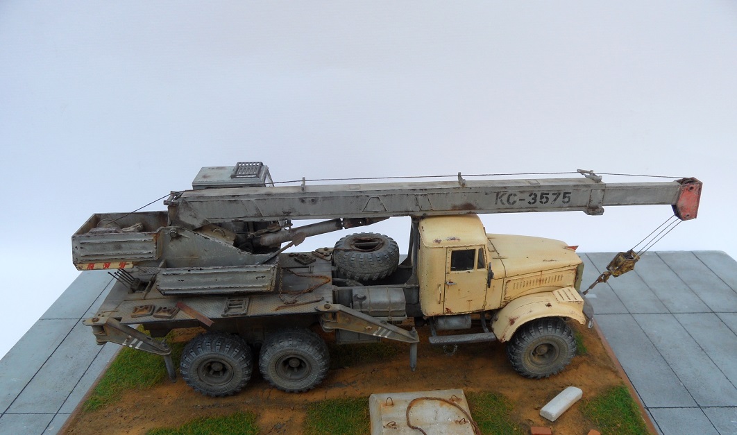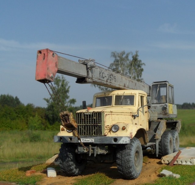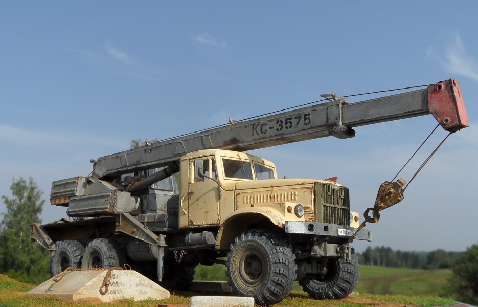 Привет всем! Очередная новинка от AVD Models - Автокран КС-3575 на базе 255. Модель очень интересная, я такие в военных частях, так не видел. Потому и решил окрасить наоборот в гражданский цвет. Модель имеет надстройку крана, она выполнена из пластика, отлично проработана, имеет хорошую деталировку. Есть возможность выдвигать стрелу и поднимать, поворачивать башню. Упоры тоже подвижны. В наборе идут фототравленые дворники, нить для имитации троса и дкаль отличного качества.По модели -собиралась легко и интересно,сделал небольшие доработки в виде ручек и решетки радиатора как и на предыдущем Кразе, в общем по мелочам. Из антуража лопата и ключи Петроград, тросы самодел, цепь , панель и блок сму 23. Окрашена эмаль Мотип, чайная роза (кабина) и кран ( темно серый). Тонировка пигментами Зип тамия. Приятного просмотра!