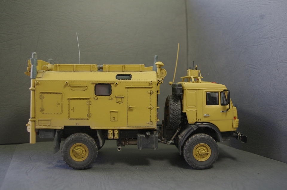 Многоцелевая радиостанция Р-161-А3М на базе а/м КАМАЗ 4350 в Сирийской Арабской Республике.Не все получилось как задумывал, где-то помещали косяки криворучкости и неожиданостей от используемых материалов. За основу взят КИТ AVD КАМАЗ 4350, кунг радиостанции — МАЛ студия, с доработками (1 К25(самодел под фото кондиционеров стоящих на различных аппаратных — 1 К22 шел в двух блоках, а 1К25 моноблочное исполнение), сделан транспортный вариант — антенны в чехлах), прицеп ( КИТ подкатной тележки МАХ-МОДЕЛС- основа, все остальное перепил кузова от КАМАЗА 4350 и кузова ЗиЛ-131 (ну а чего добру пропадать)). Из добавленного: радиоэлектронный комплекс «Пелена-6БС-Ф», предназначенный для защиты от радиоуправляемых взрывных устройств автомобилей и бронетехники (установлен на багажной системе кабины), колы заземления, канистры для воды и топлива. Использовано: автомобильные грунт и краски MAXI-COLOR, MOTIP, Тамия и АКАН, пигменты АК, Вайдлер, различное травление, подсобные и подручные материалы, проволока, тряпочки, палочки. Абгадинг умеренный,