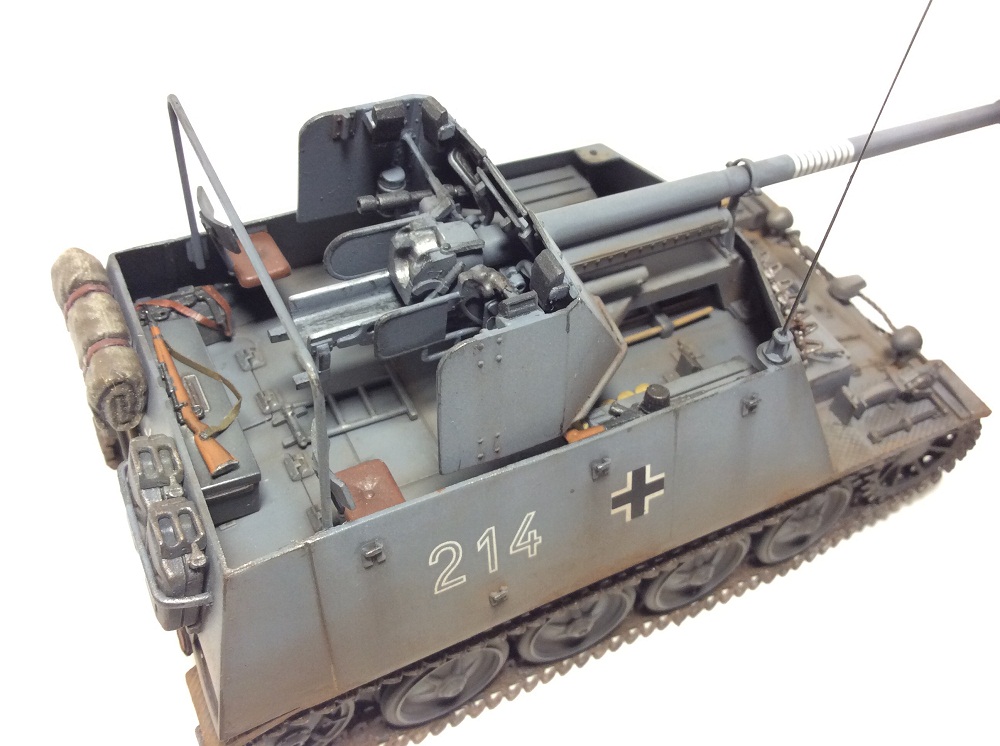 Модель собрана с не большими доработками: спилены не нужные клёпки на листах защиты ствола и вторые держатели крыльев, перенесена вверх центральная часть защиты орудия добавлены разные допы (антенна, трос, канистры, тент, фары, ящики и оружие).