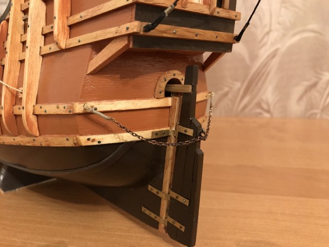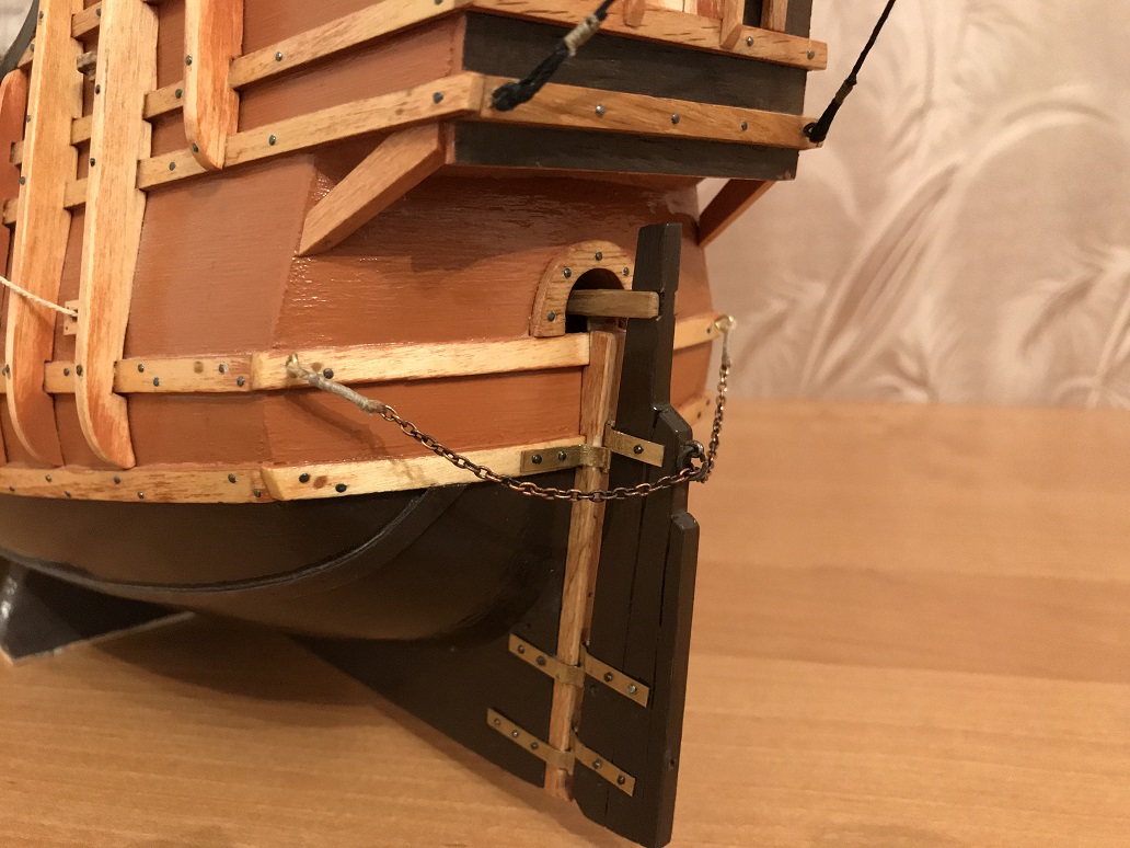 Есть путаница в окраске корпуса и цвете такелажа, ликтрос и его прошивка почему-то черного цвета, шлюпка не принайтована и без наполнения. А в целом приятная модель получилась! Я за галерею проголосую