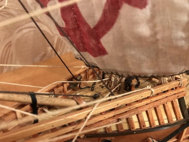 Ну вот,теперь все всё увидели и оценили. Выбленки толстые, лик-трос на будущее надо натягивать и кромку паруса подшивать на весу,тогда не будет этих синусоид. Редкий случай,когда паруса у меня возражений не вызывают,кроме лик-троса.Вполне себе галерейная модель. Все надо учесть и ...за новый корапь. Белый шар.