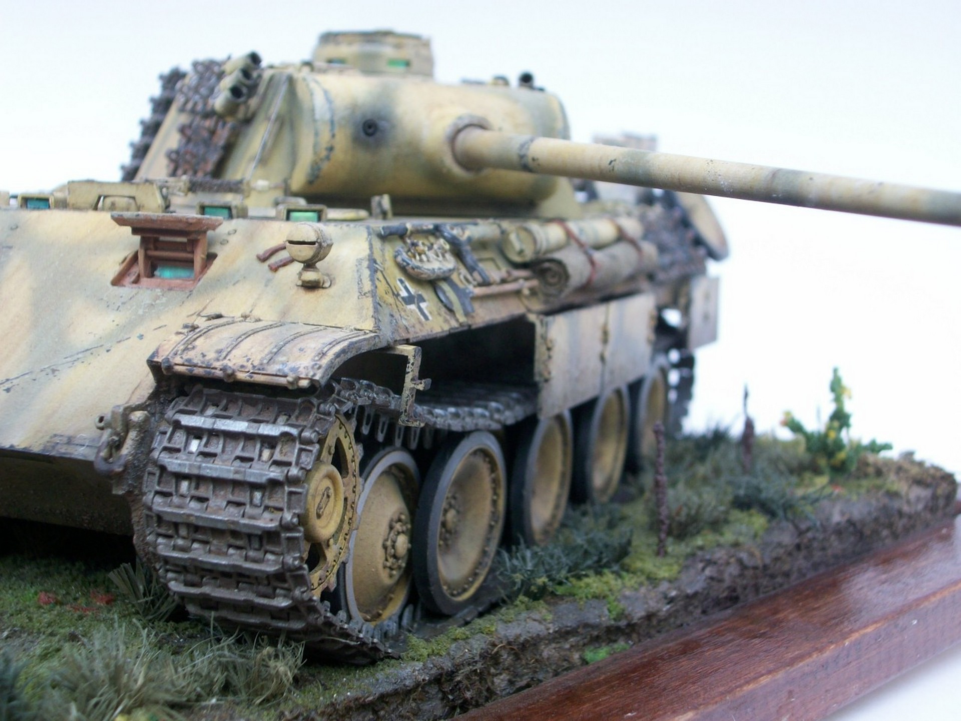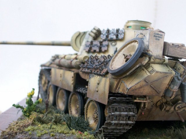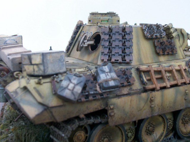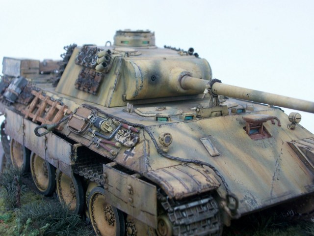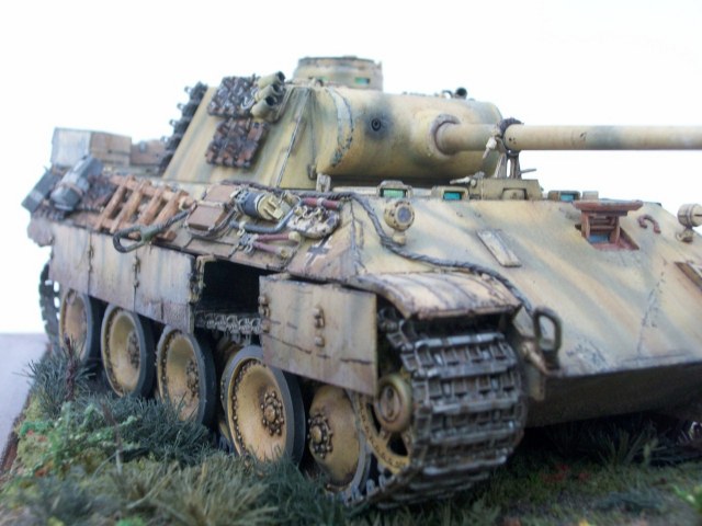 Всем доброго времени суток.Представляю вам свою работу,танк" Пантера" Модификации " Д"Это мой долгострой,начал я его в апреле,а так как живу в селе с приходом лета времени очень мало.Применялось фото травление сетки на М.Т.О Вояджер модель и ведро микро дизайн,болтики мастер клуб и картонные коробки вермахта,производителя сказать не могу (не помню)Трос от танка ИС-1 по моему Всё остальное самодел. Покраска тамия , пигмент Ваелдор и Зип , маслянные краски. Плёнку под триплексы ,заказ с алика ,рулон , хватит на всю жизнь.