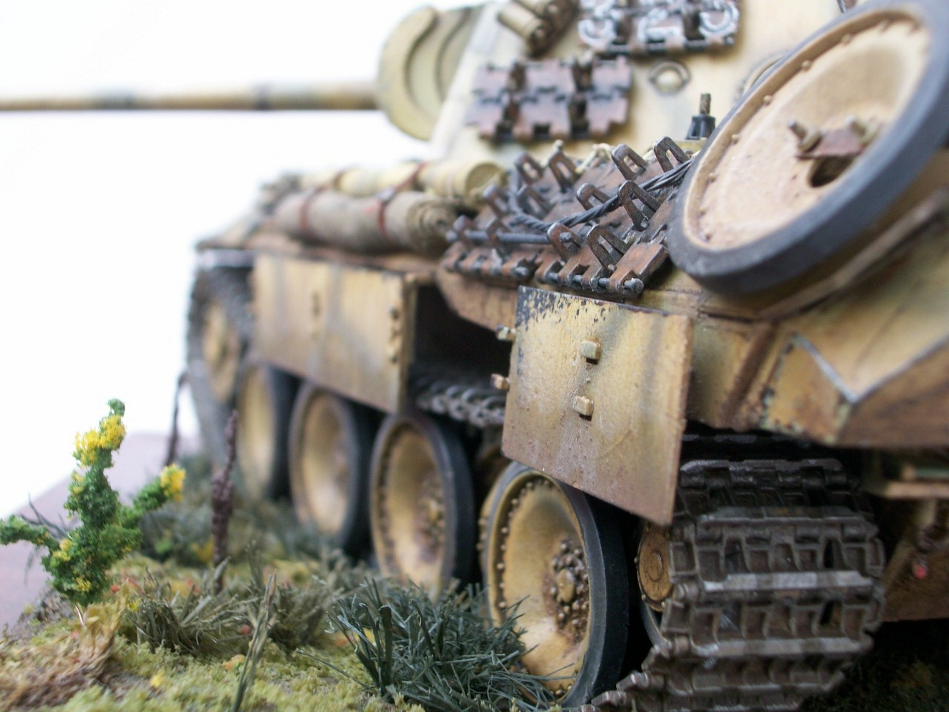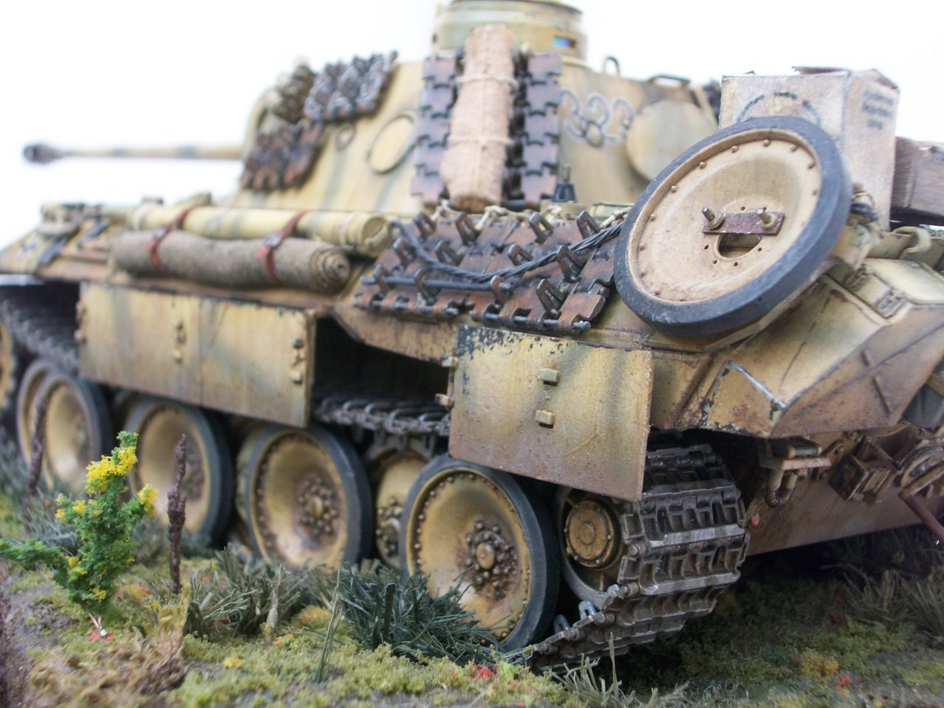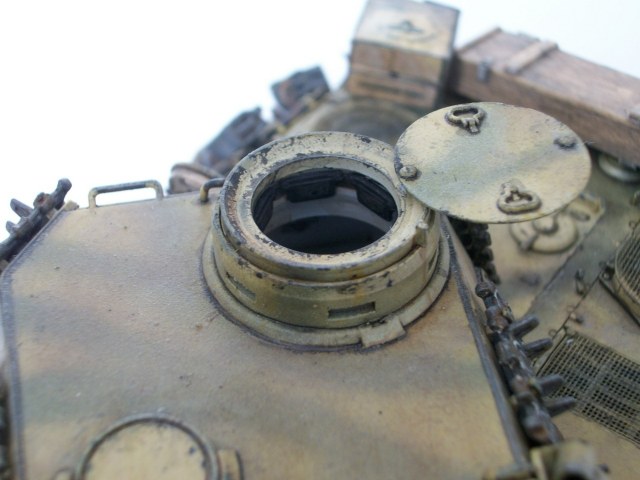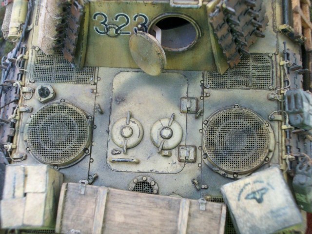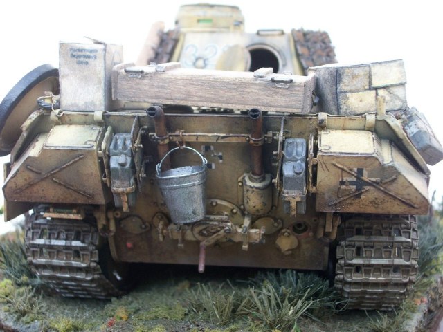 В целом работа удалась. Мох конечно не смотрится, когда свою строил, тоже хотел его применить но отказался. Нижний ряд траков,на башне так не крепили, по крайне мере я такого не видел.Стоило срезать дымовые шашки и повесить ровным рядом зап. траки. И номера всё же стоило нанести на башню, на траках их наносили только если весь борт башни был завешан траками. Канистры более детально проработаны в наборе Tamiya 35315 и стоит не дорого а то у ваших заливные горловины вообще не проработаны.