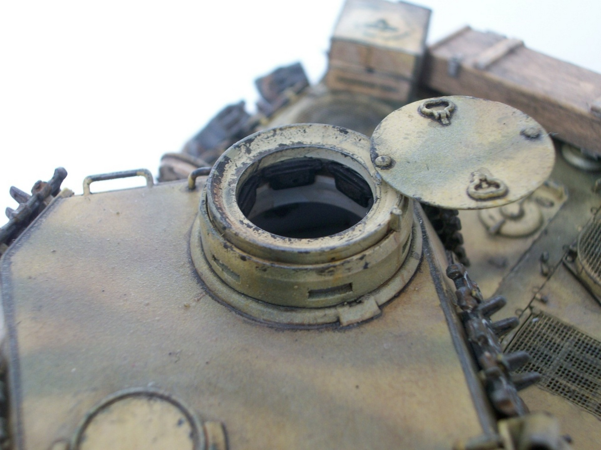 с лестницей косяк,поэтому она снимаеется и можно переделать,что и будет сделано.А траки все на башне на одинаковых крюках висят.Просто фото не очень,или в сколах перестарался.